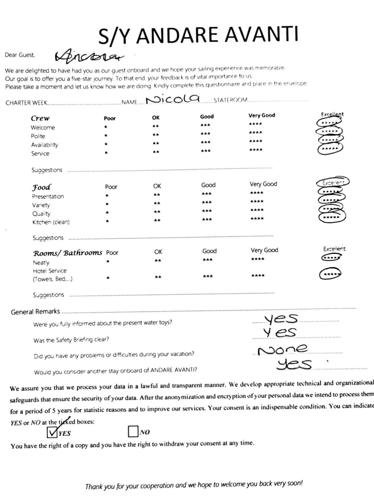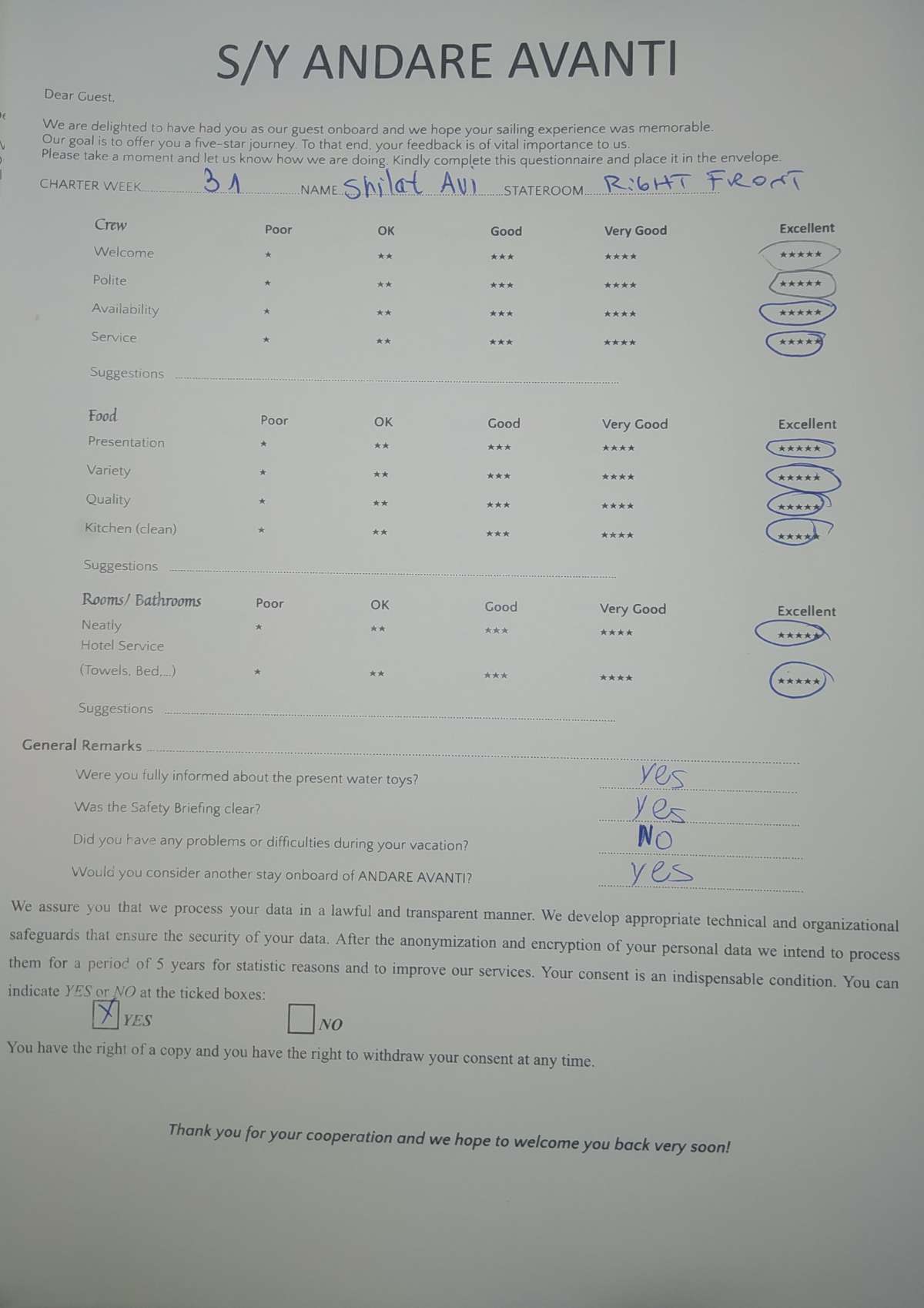 ANDARE AVANTI Description and Charter Summary Information