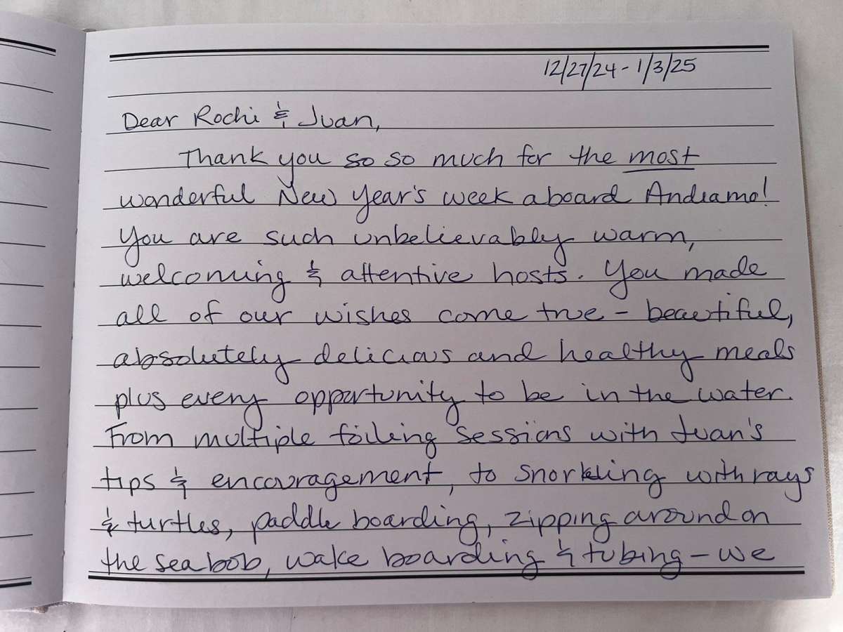 Dear Rochi & Juan,Thank you so so much for the *most wonderful New Year’s week aboard Andiamo!* You are such unbelievably warm, welcoming & attentive hosts. You made all of our wishes come true - beautiful, absolutely delicious and healthy meals plus every opportunity to be in the water. From multiple foiling sessions with Juan’s tips & encouragement, to snorkeling with rays & turtles, paddle boarding, zipping around on the sea bob, & tubing - we truly enjoyed ourselves!