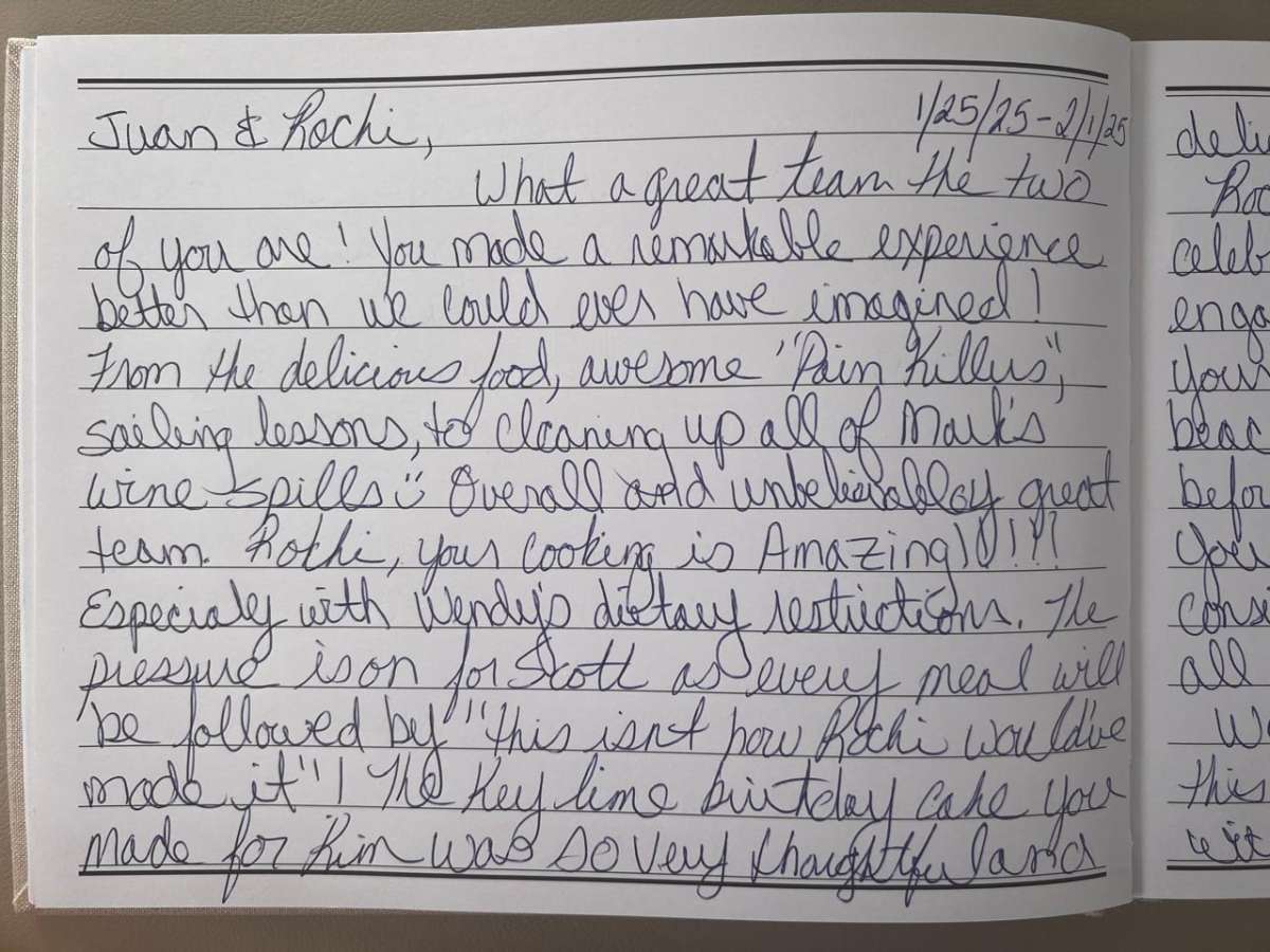 Dear Juan and Rochi,What a great team the two of you are! You made a remarkable experience better than we could ever have imagined!😍 From the delicious food and awesome "Painkillers" to sailing lessons and cleaning up all of Mark's wine spills—overall, an unbelievably great team!!!
