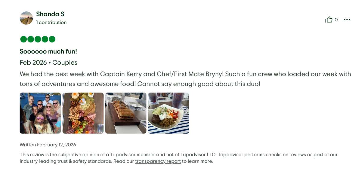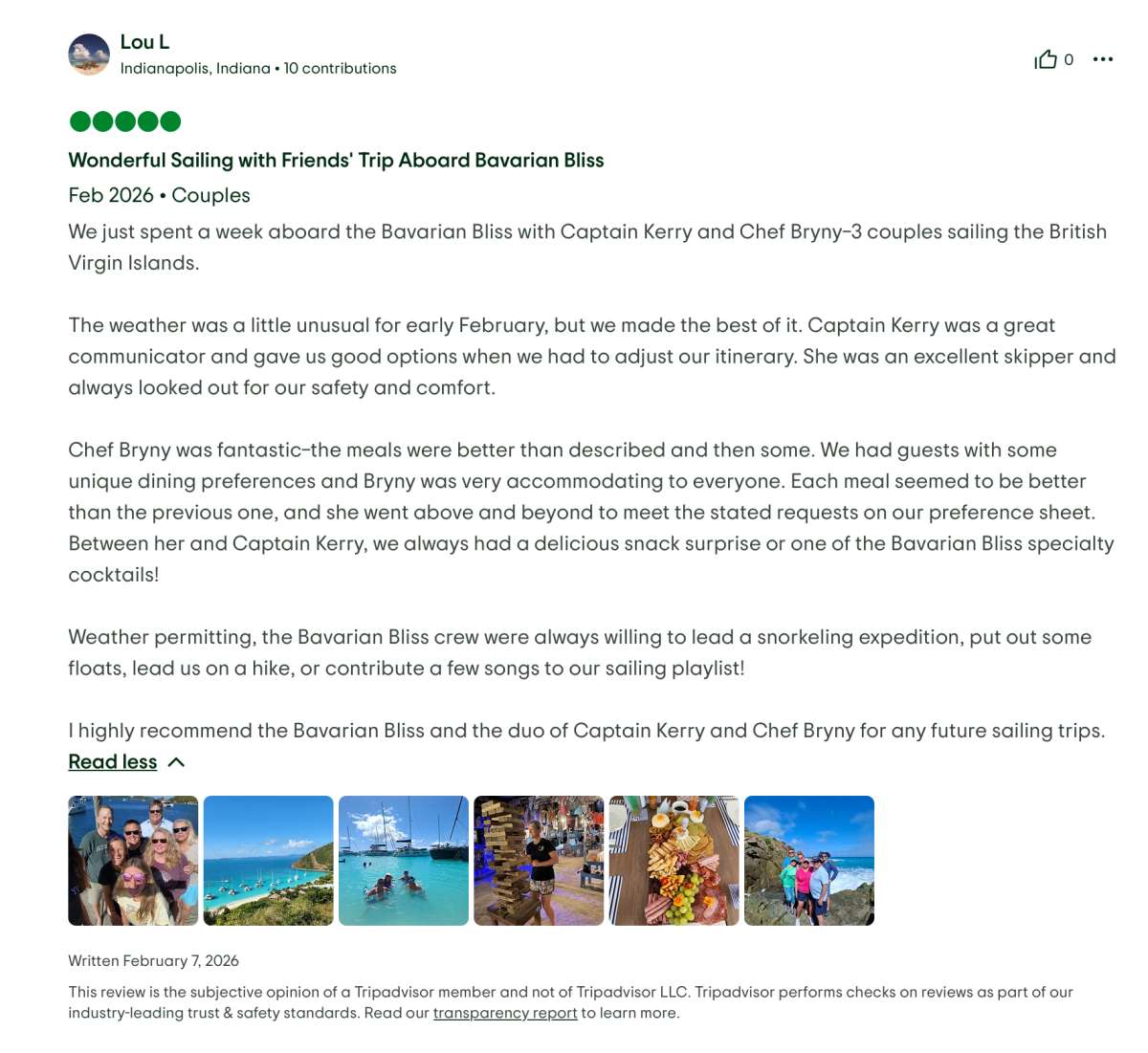 Bavarian Bliss accommodates up to 8 charter guests in 3 spacious queen cabins and 1 twin cabin each with en-suite facilities and individually controlled air conditioning. The yacht is equipped with solar panels, a water maker, and a full-sized refrigerator. Guests can enjoy a customizable menu, a fully stocked bar, a coffee/espresso machine, snorkeling gear, 2 stand-up paddleboards, a towable water tube, a 10-ft floating dock, fishing gear, and a Bluetooth sound system.