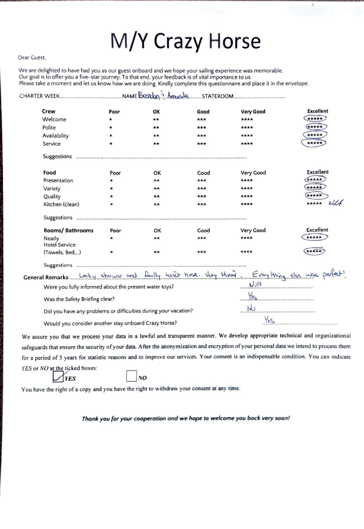 Additional yacht details including amenities and standard equipment for CRAZY HORSE