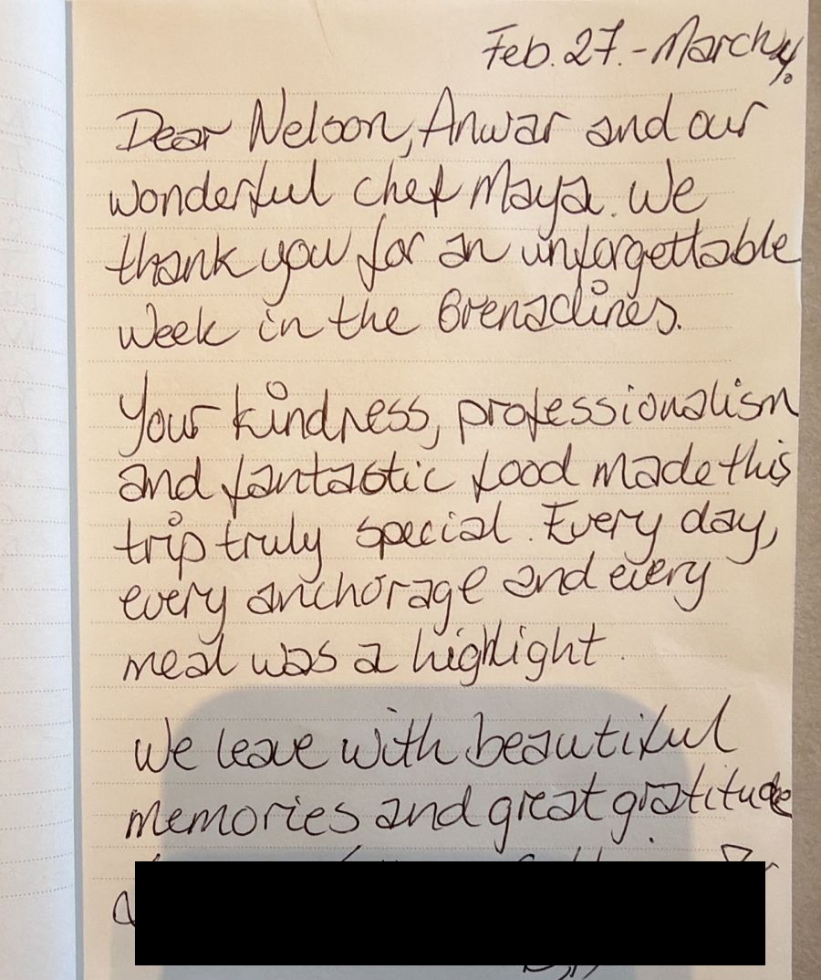 Formidables ! Croisière dans les Grenadines. Equipage (attentionné et à l’écoute). Bateau (bien entretenu et confortable) Tout était parfait. Tous mes remerciements sincères et amicaux. Bon repos à St Martin !Un immense merci à vous trois ! La semaine a été parfaite, beaucoup trop courte évidemment… Nous garderons de magnifiques souvenirs de vous, des paysages, des repas, du service irréprochable ! Mille mercis pour tout !