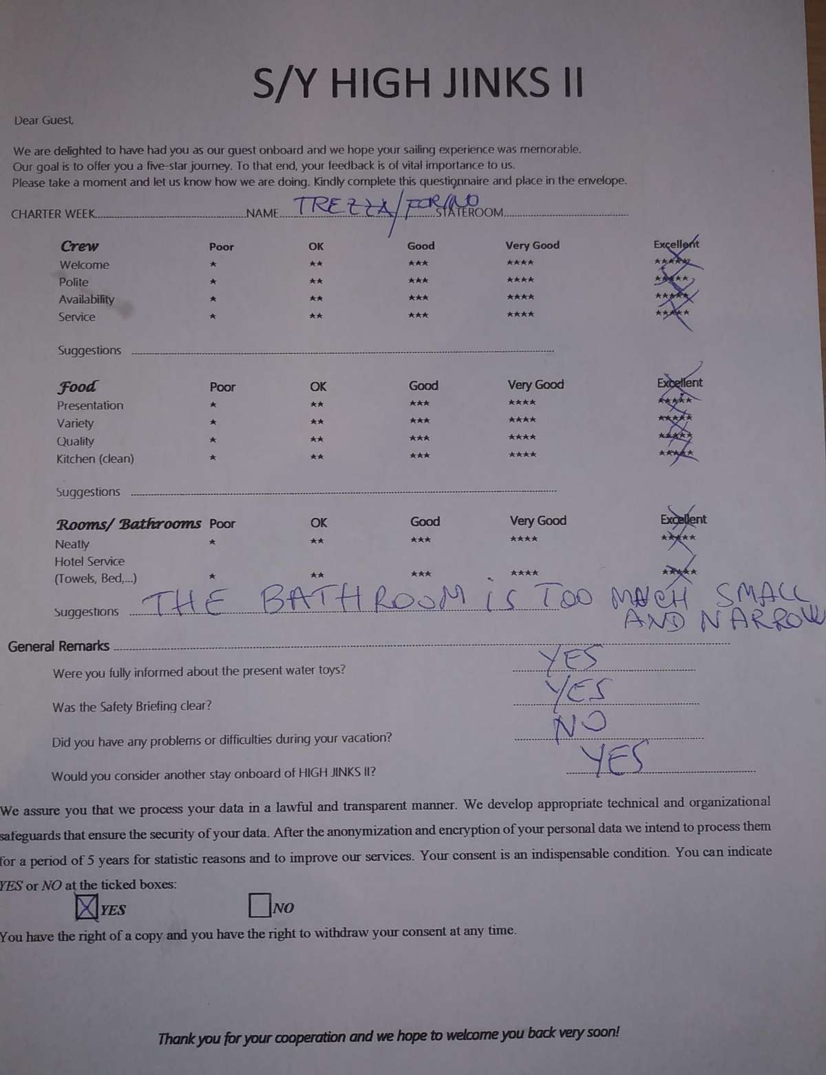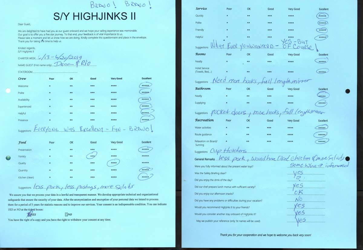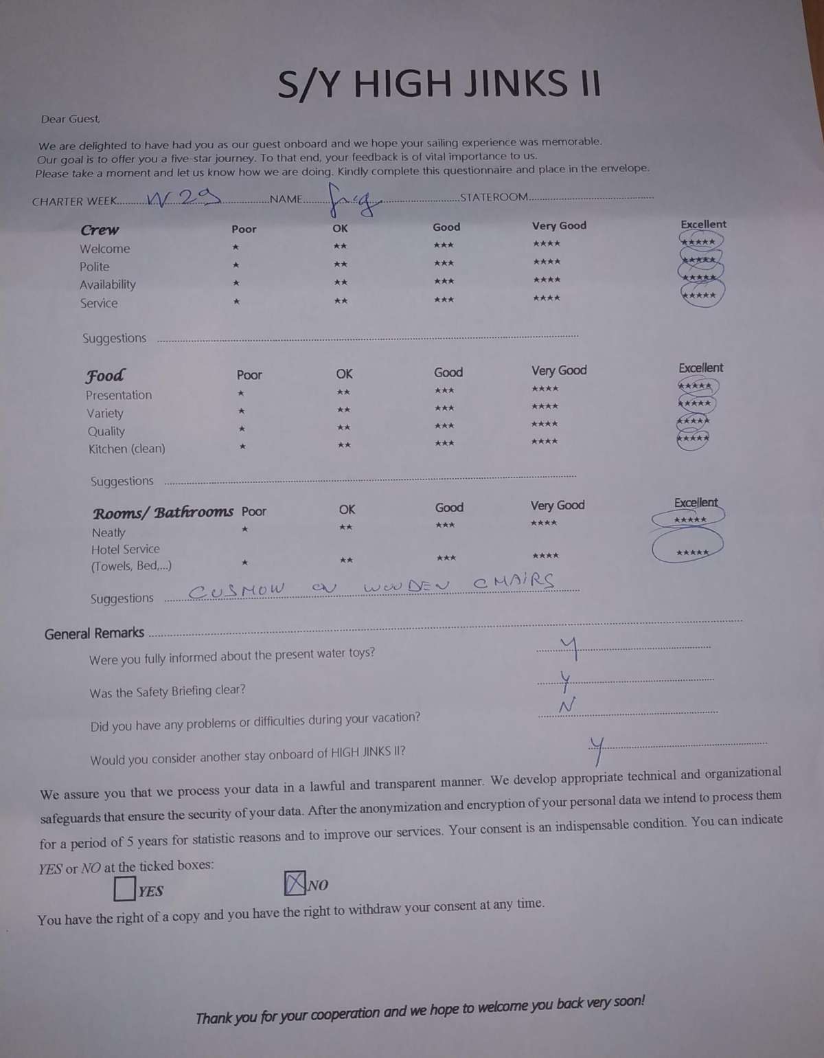 Built with exceptional craftsmanship and continuously refitted to maintain her high standards, HIGH FIVE offers the comfort and refinement of a boutique floating hotel. She accommodates up to 10 guests in five spacious double cabins, each equipped with private en-suite facilities, air conditioning, TV, DVD, and integrated stereo systems. Every cabin has been thoughtfully designed to maximize space, privacy, and tranquility—inviting guests to unwind in absolute comfort. At the heart of the yacht, the salon welcomes you with soft tones, flexible seating, and sweeping panoramic views. Whether you’re escaping the midday sun, enjoying a quiet moment with a book, or watching the Chef craft the next culinary delight, the ambiance is serene and sophisticated.