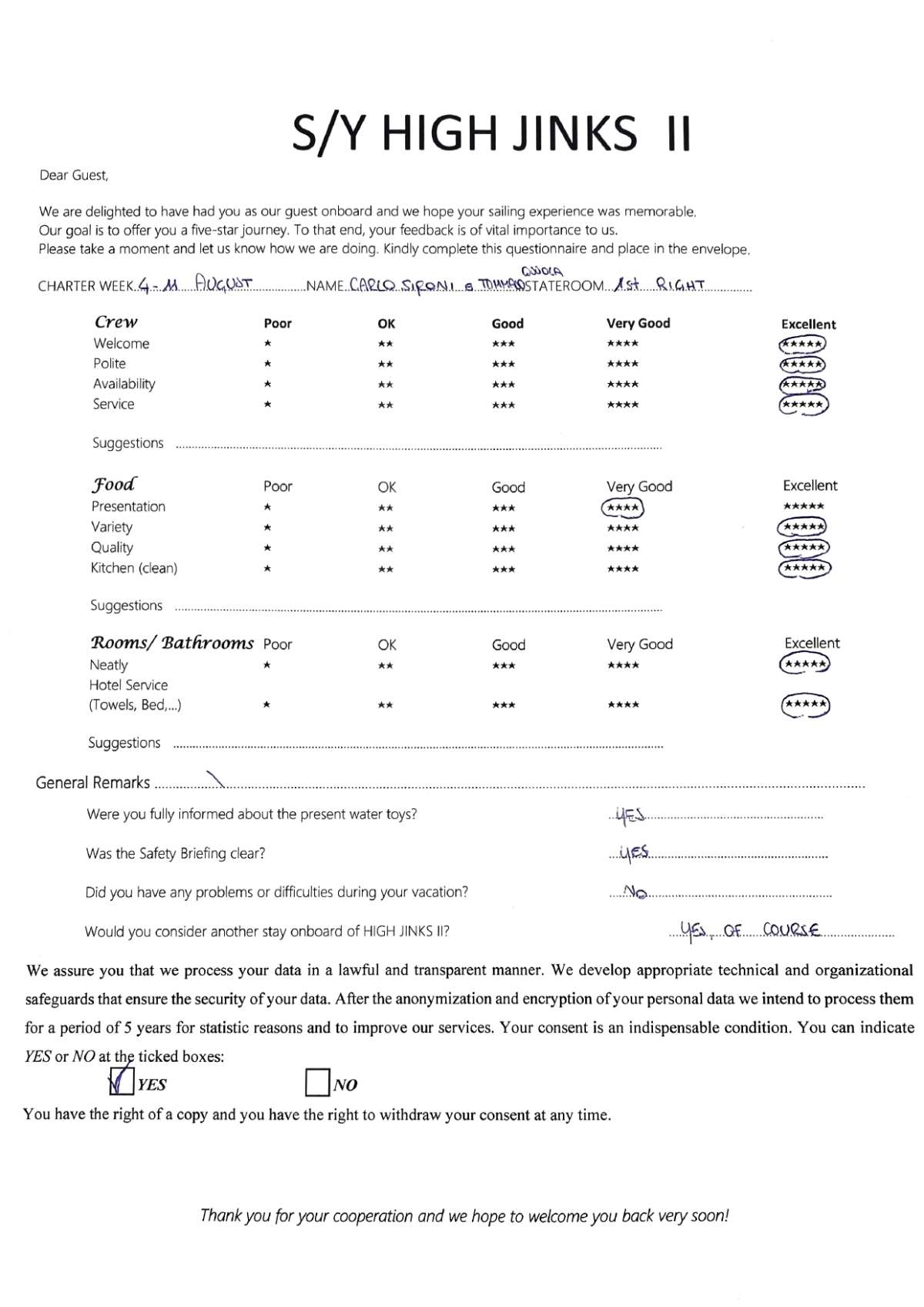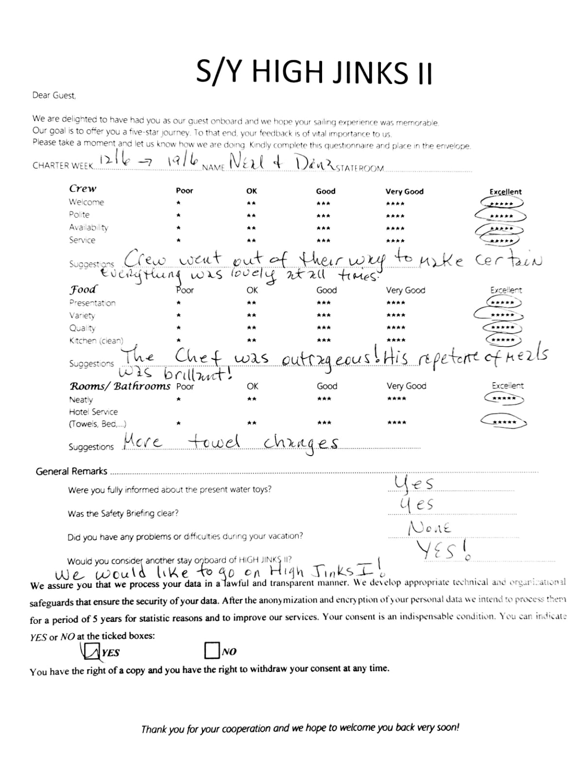 Additional yacht details including amenities and standard equipment for HIGH FIVE