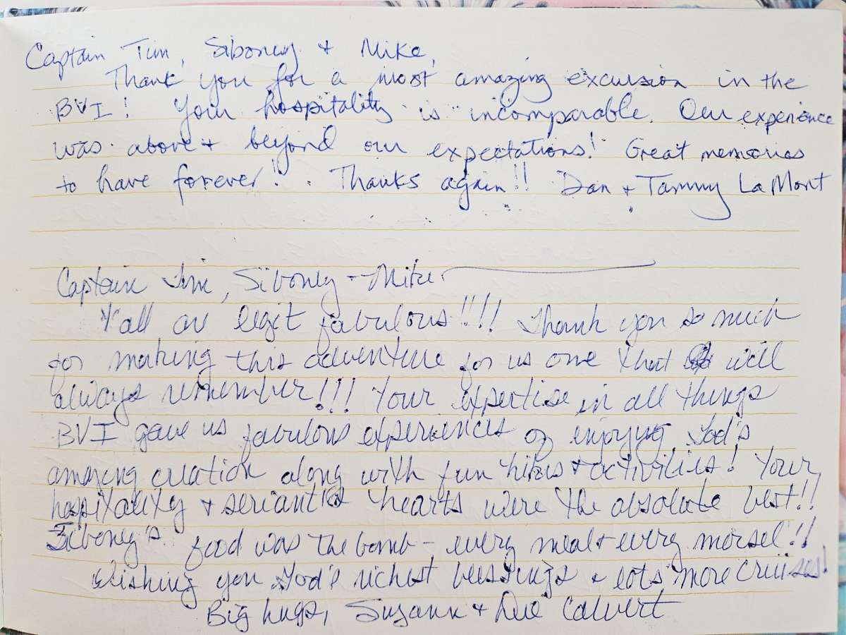 Dear Captain Tim. Siboney & Mike,Thank you so much for the best trip yet! We all had so much fun riding around the BVI's with ya'll! Ya'll are family and we love you all! Can't wait to be back in May.