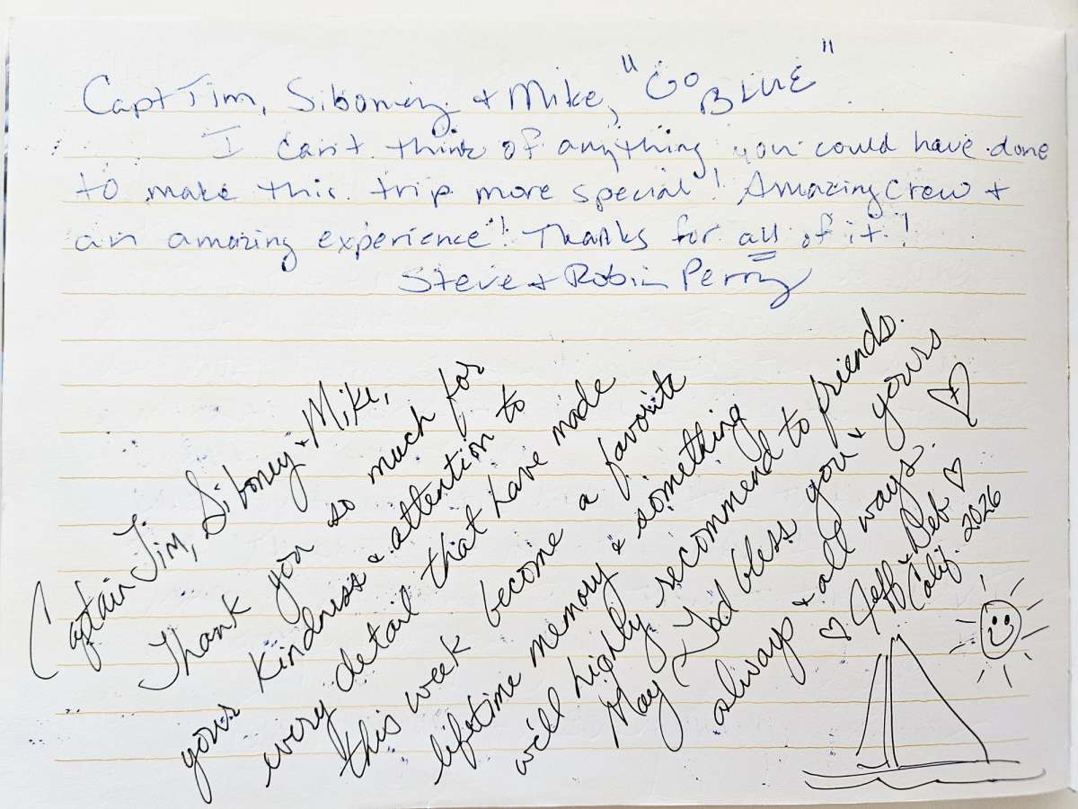 To Captain Tim, Mike & Siboney, Thank you all for a wonderful trip. This was my maiden voyage, and I thank you for the wonderful experiences, food and places you've all given us. I will cherish this for a long time. I hope everything goes well in the future! - AugMarch 2024