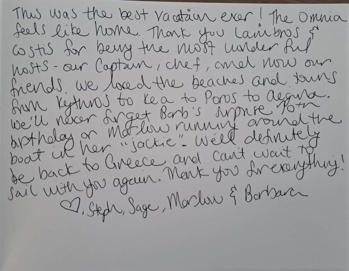 Thank you so much for a fantastic trip.First time in Greece & first time sailing. You made wonderful memories for us. We also made lifelong friends in you. Best humans ever! Until next time sweet friends. Thanks again for everything you did to make our time so special!