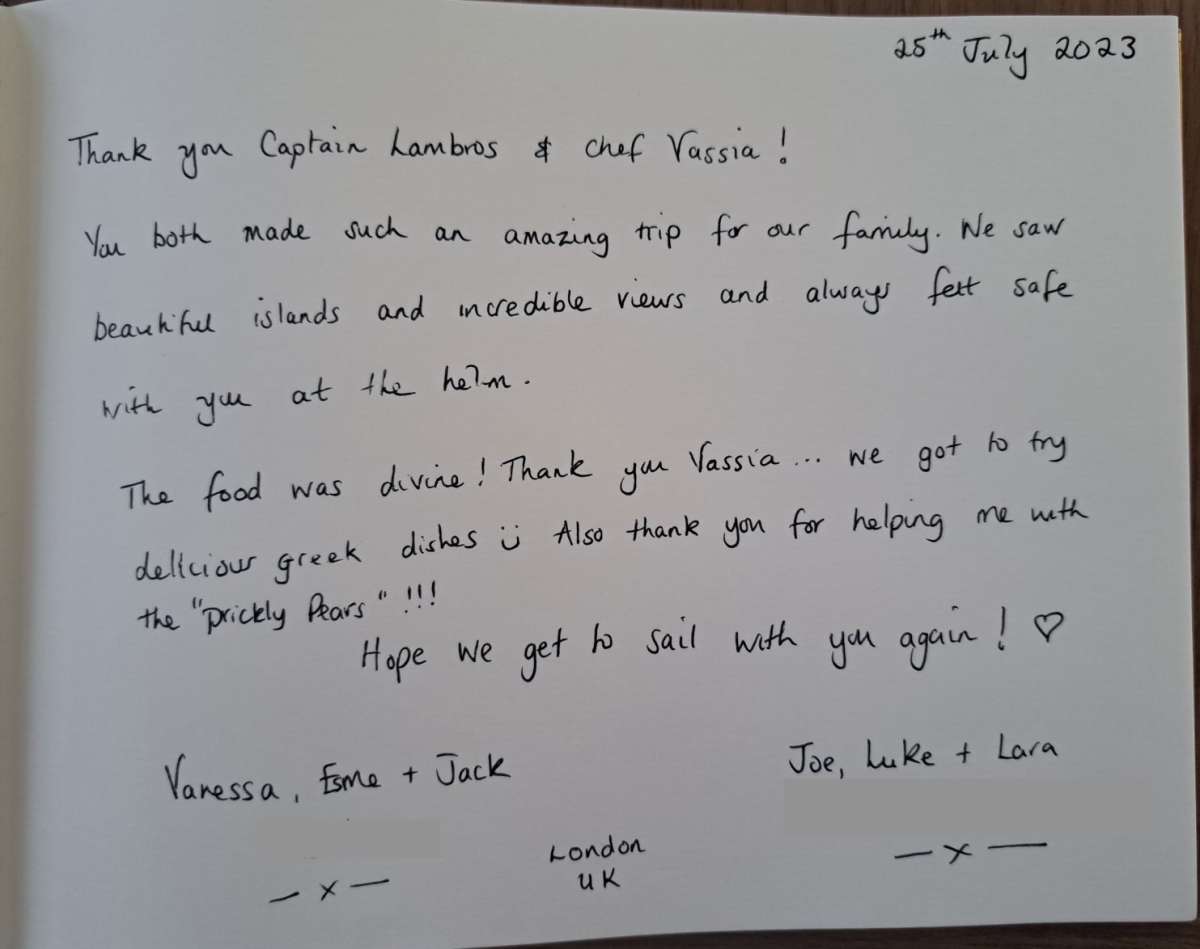 We cannot thank you enoughfor such a beautiful week. Incredible food. We have loved trying all of the greek favorites. Amazing views. You know the best spots for swimming, views & sleeping. Thank you for sharing it all with us. It has been a pleasure getting to know you. Enjoy your time off & have a lovely rest of your summer.
