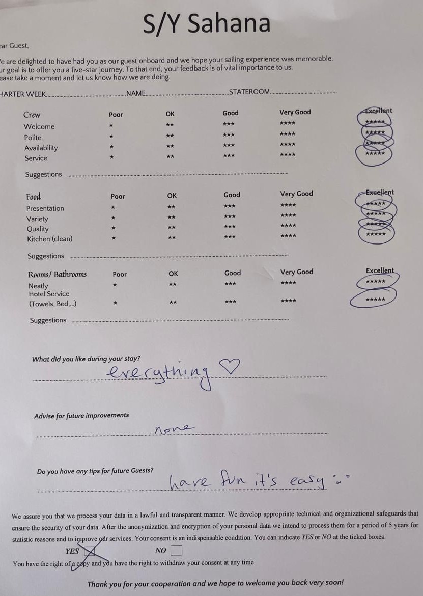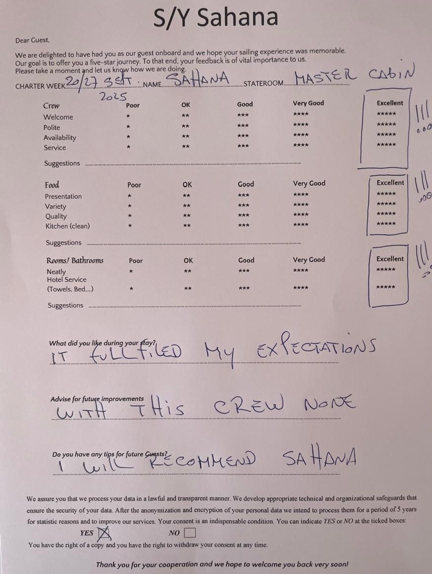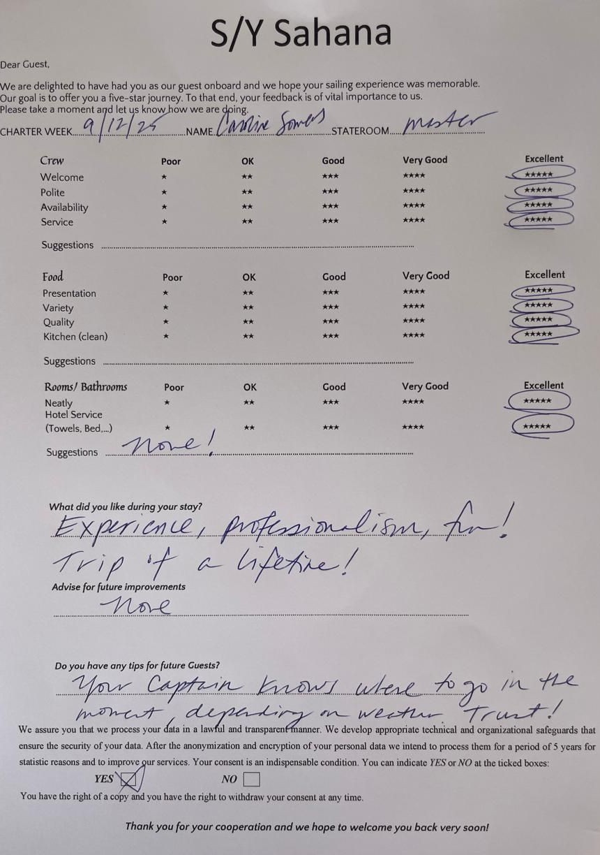 Sahana is not just a yacht; it is a floating haven with a wonderful crew of three dedicated professionals who are committed to ensuring that every moment on board is nothing short of perfection. From personalized service to expert navigation, the crew of Sahana is there to cater to your every need and create unforgettable memories during your Greek island adventure.