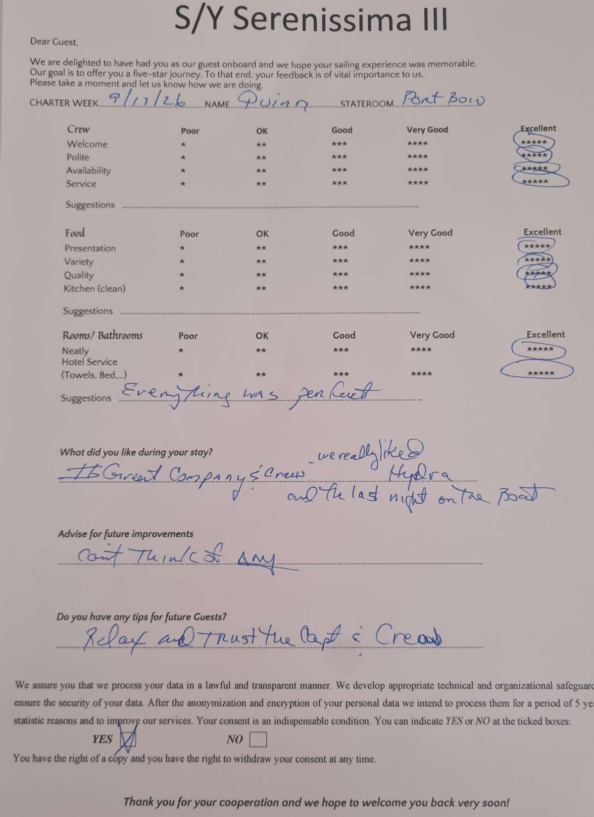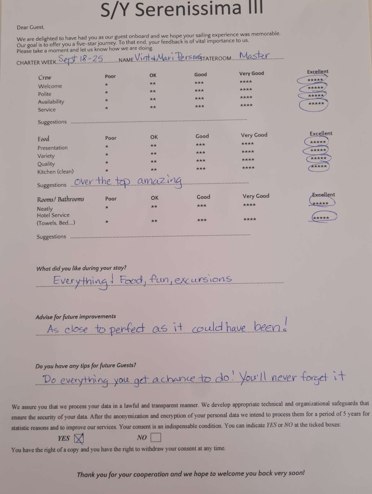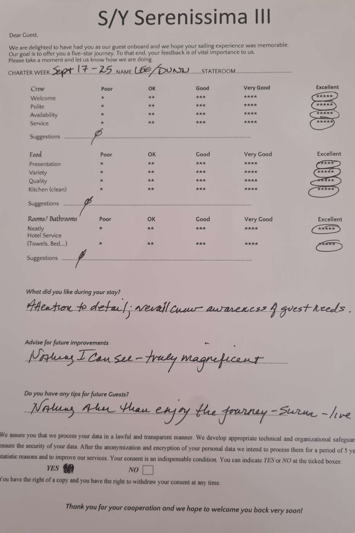 Of course, no luxury experience is complete without a dedicated team to attend to your every need. S/Y SERENISSIMA III is accompanied by a professional and attentive team, including the captain, chef, chief stew, deck/stew, and deckhand.