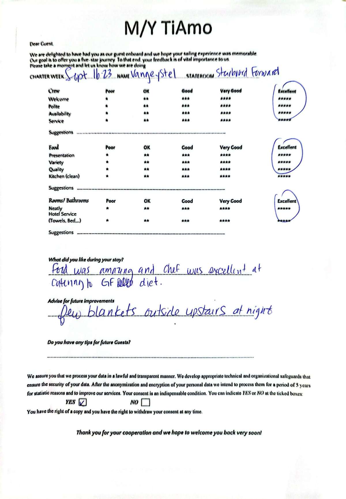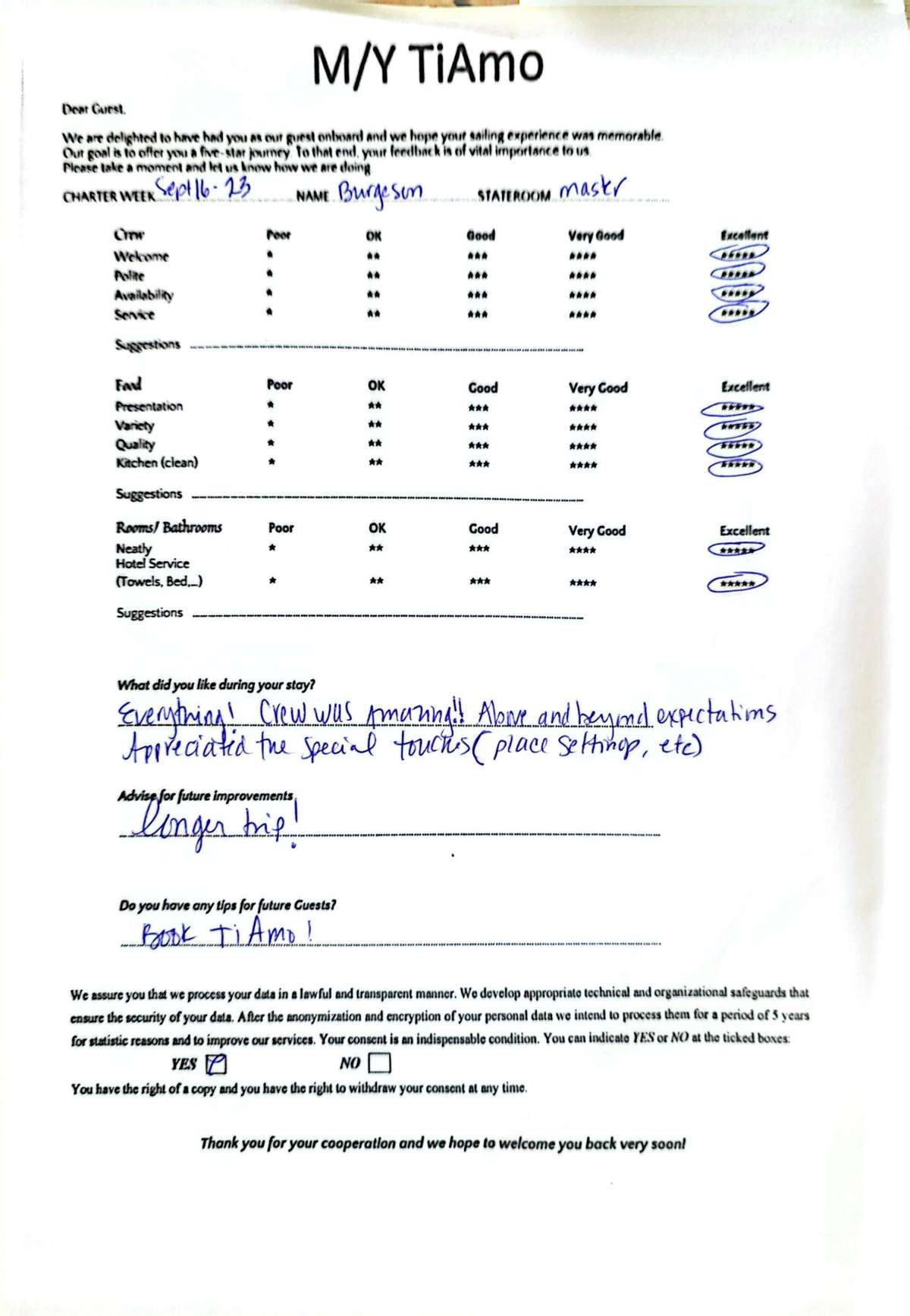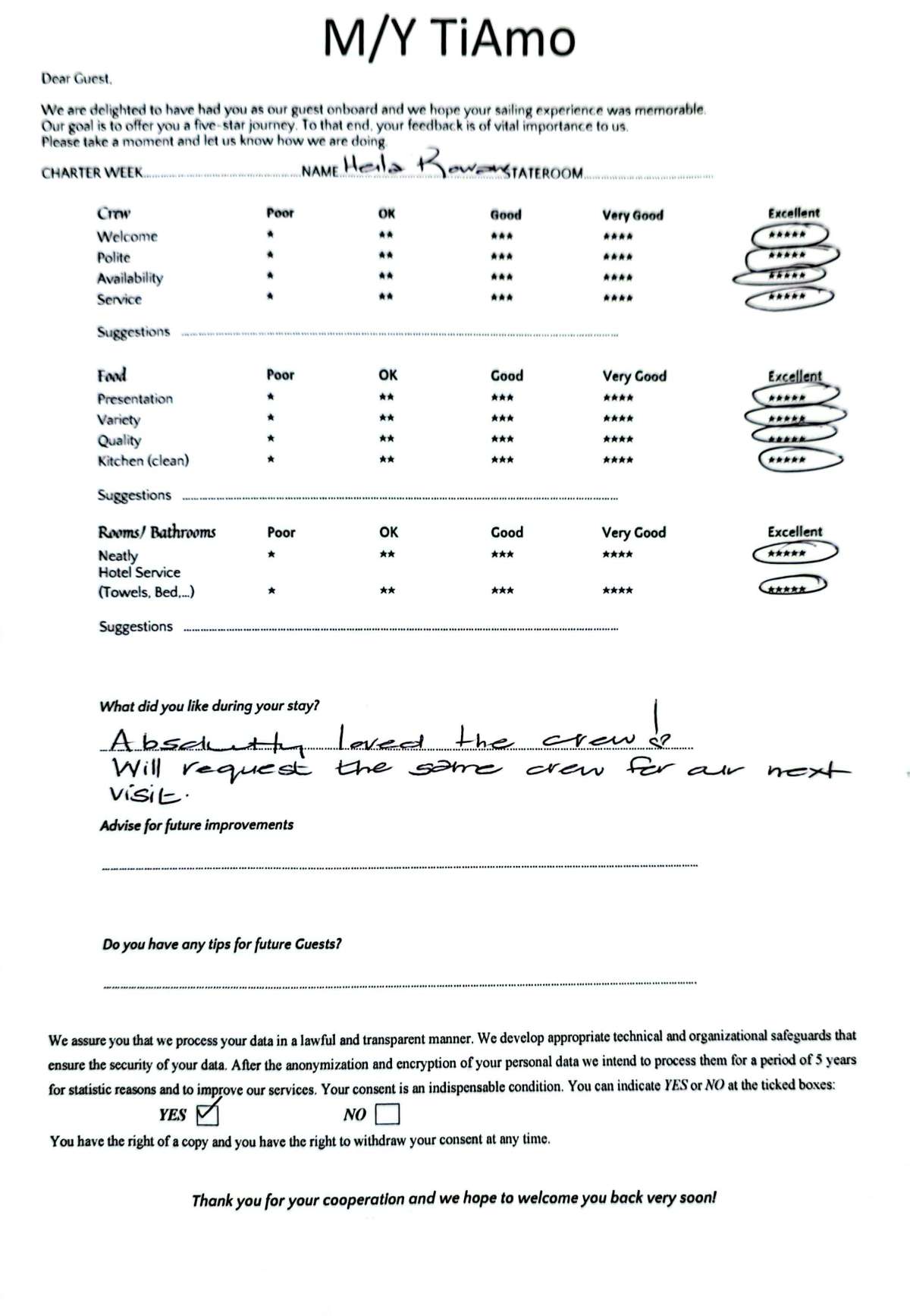 "What a successful charter we just had on TI AMO - I adore this crew, they are so wonderful, the client could not have been happier so thank you for making this last minute booking such a success as always!"Sarah