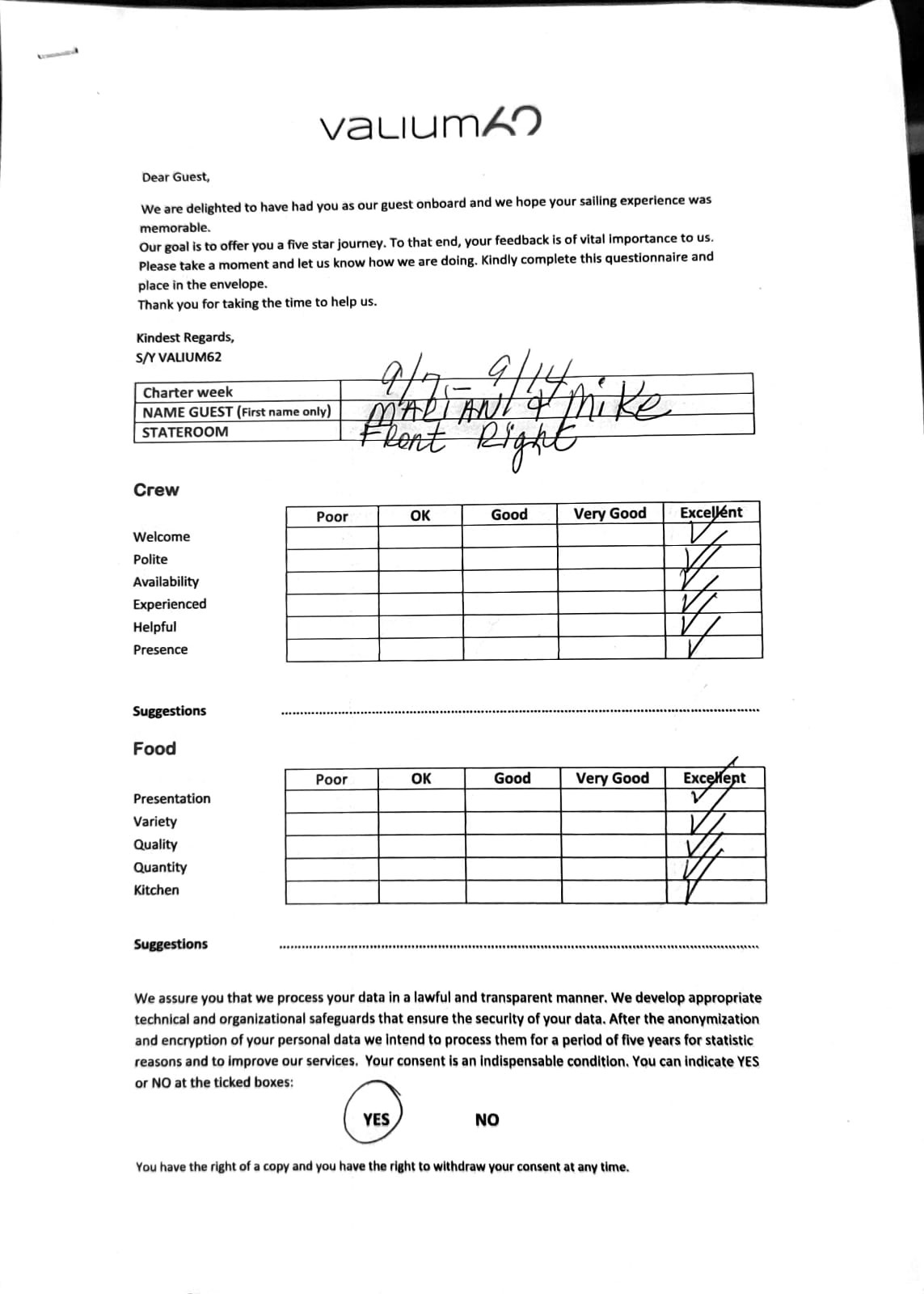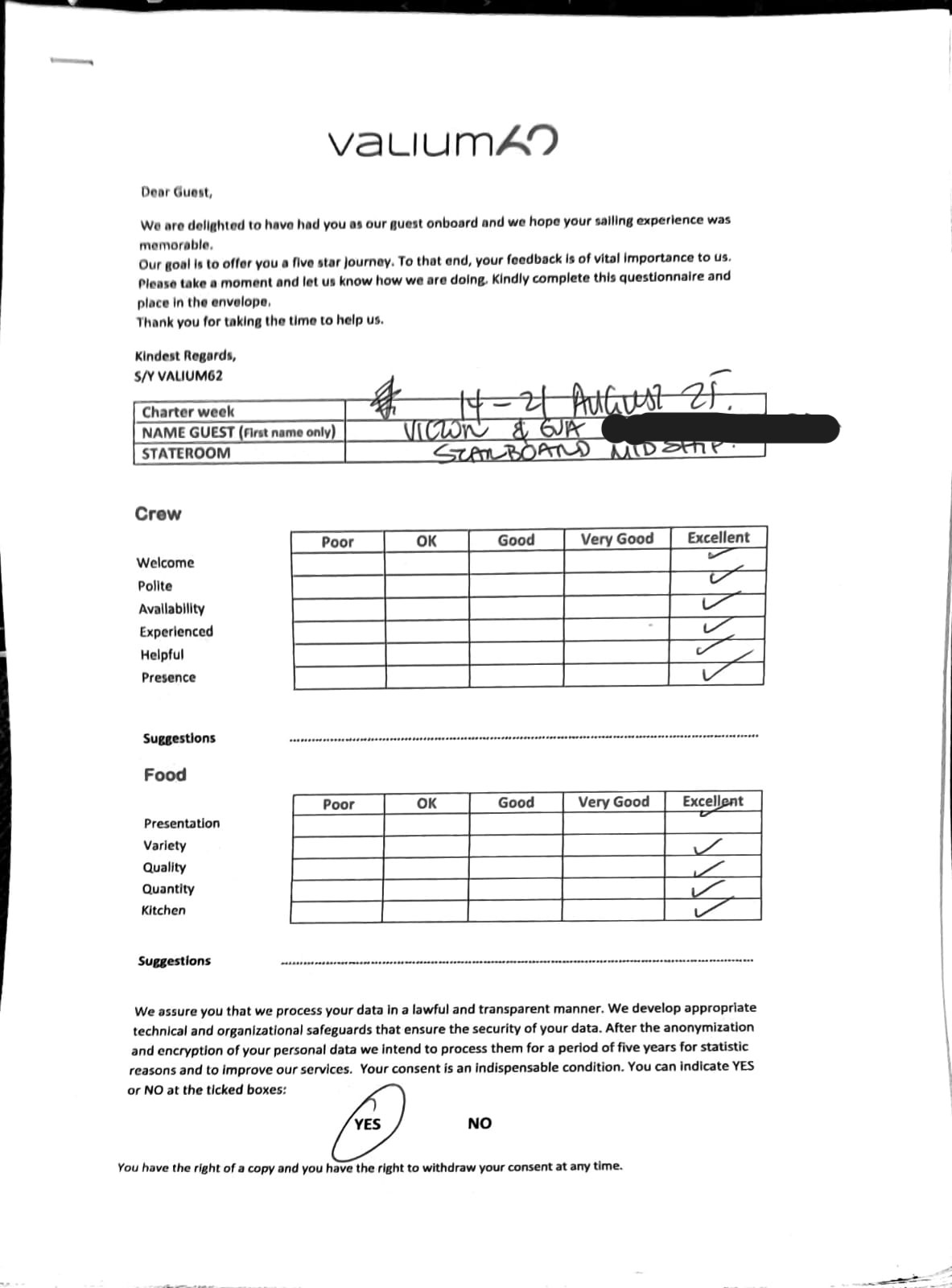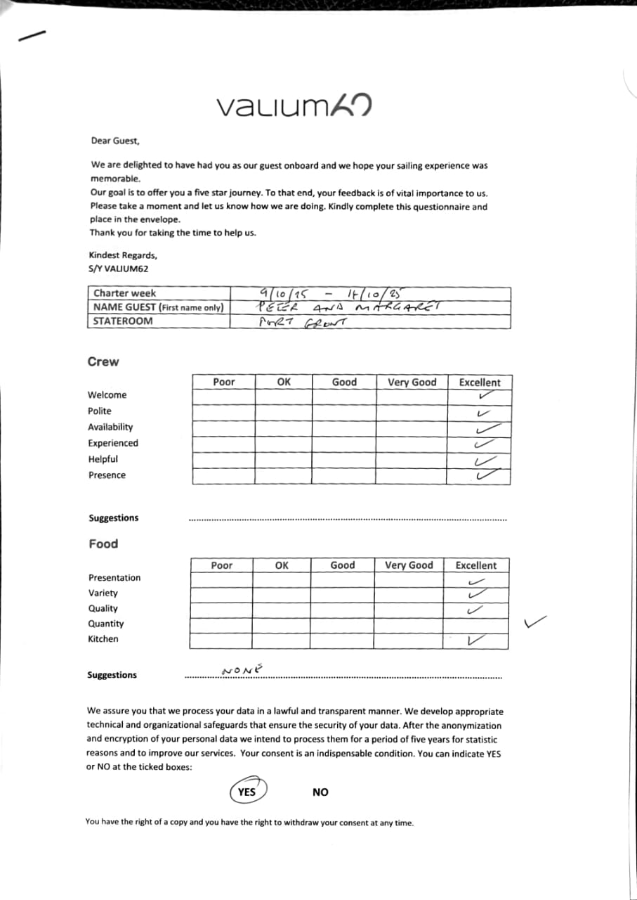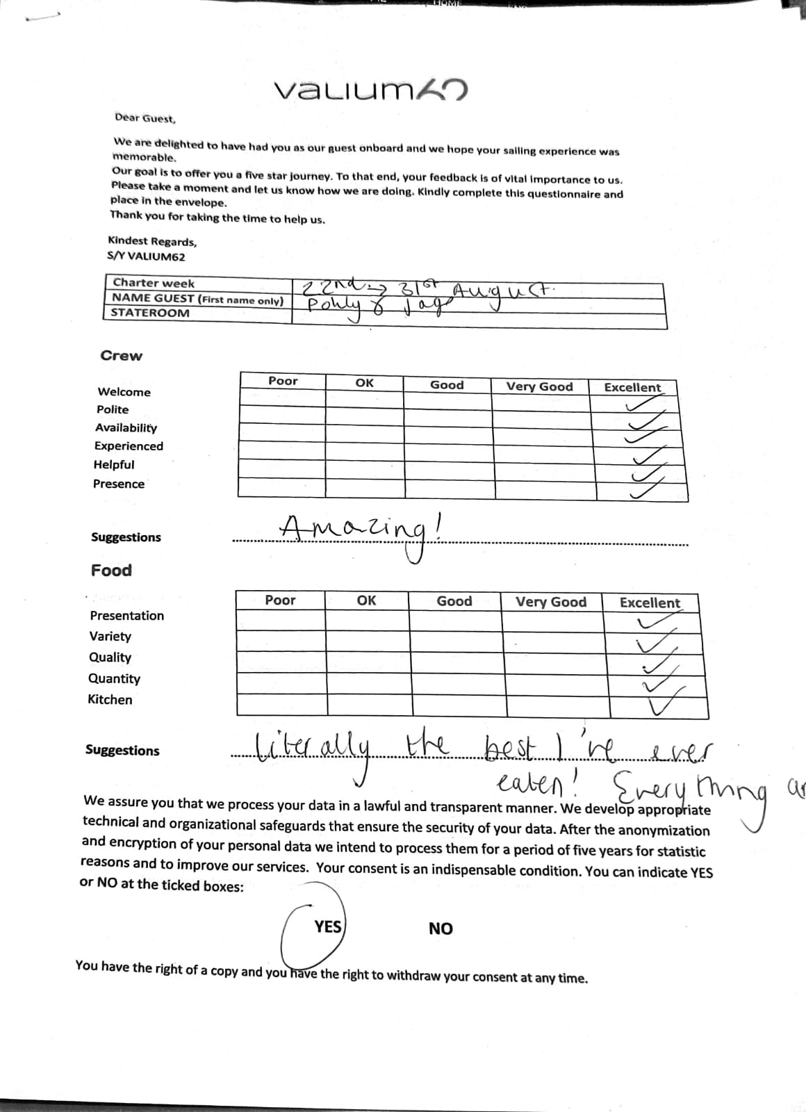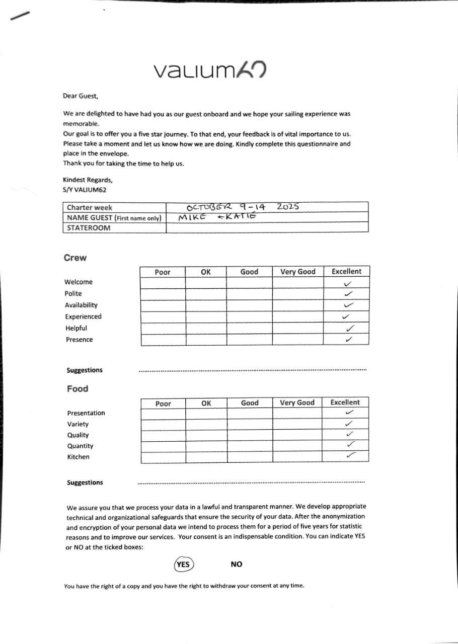 Thank you for making our trip absolute perfection! This holiday was amazing due to the crew of Valium 62. This holiday was nothing less than 5 star service from each meal served, every coctail and every perfect cove selections that we would never have been to if it wasn't for our captain. This week was a dream! Memories for a lifetime! We are forever grateful for your hospitality and opening our souls up to proper Greek culture. We are excited to book our next trip with you. We will be back!19th July to 26th July 2024