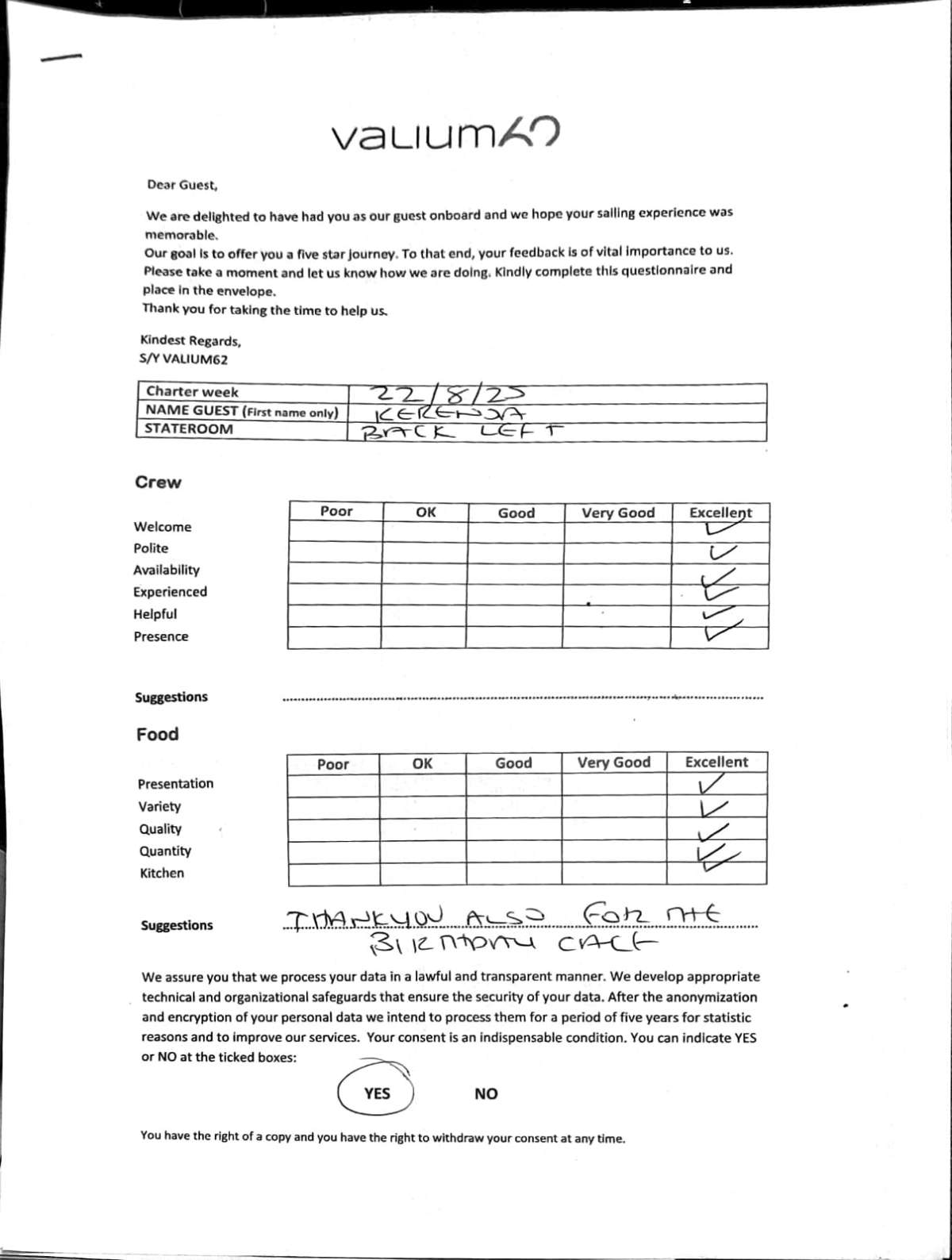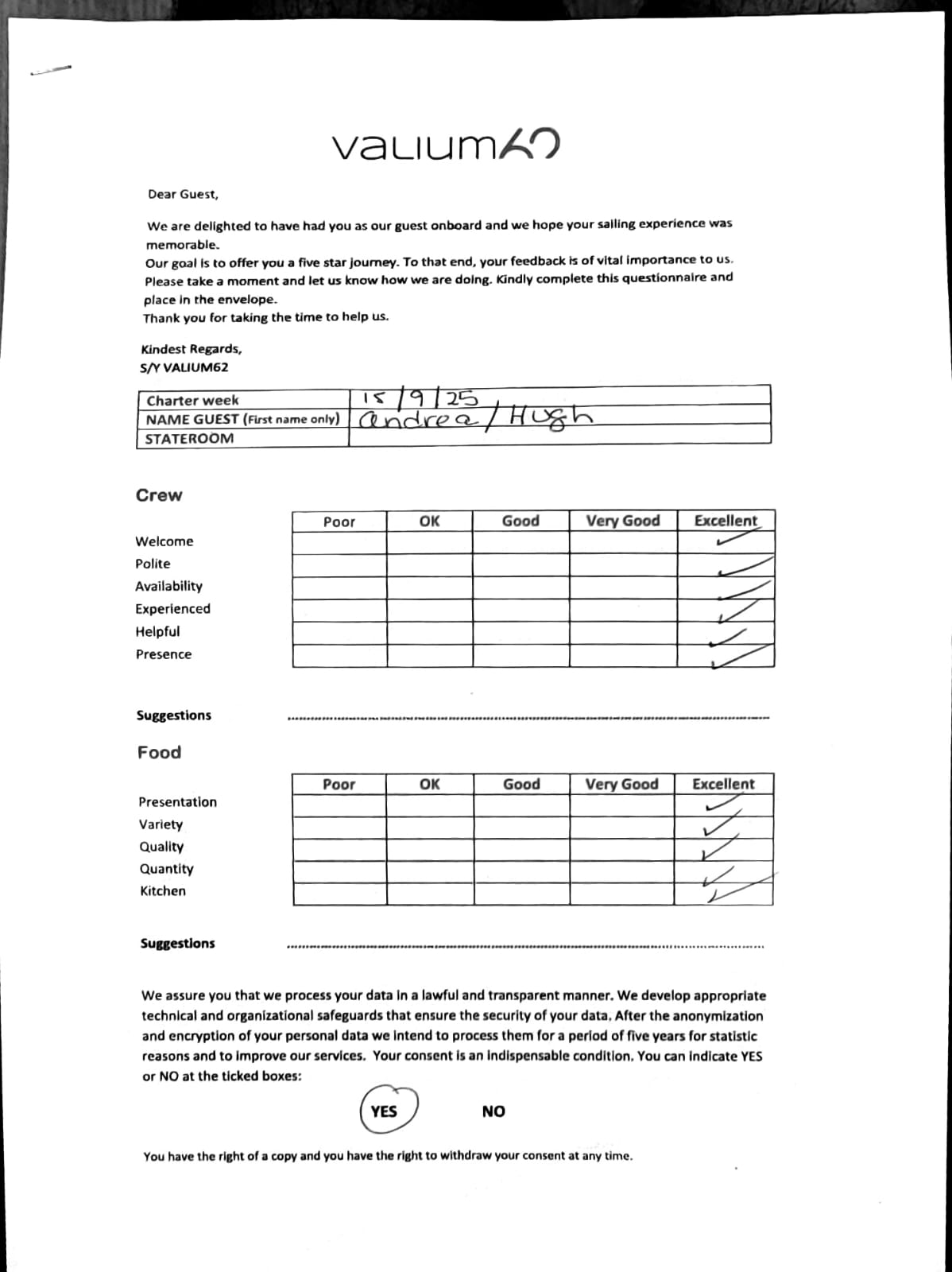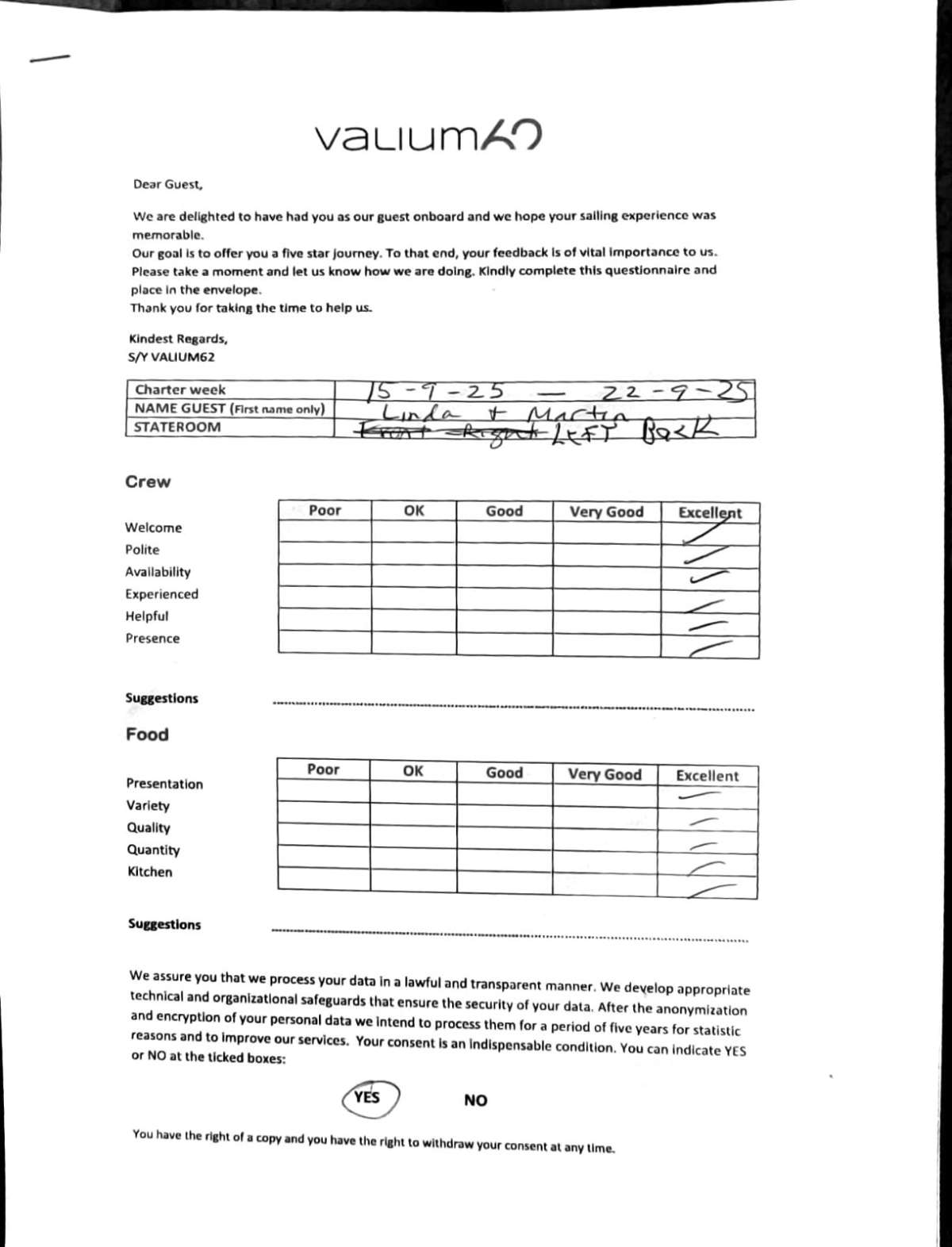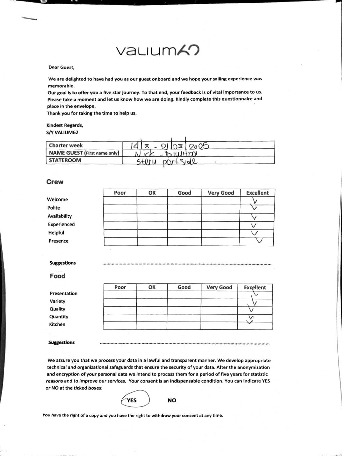 Thank you for making our trip absolute perfection! This holiday was amazing due to the crew of Valium 62. This holiday was nothing less than 5 star service from each meal served, every coctail and every perfect cove selections that we would never have been to if it wasn't for our captain. This week was a dream! Memories for a lifetime! We are forever grateful for your hospitality and opening our souls up to proper Greek culture. We are excited to book our next trip with you. We will be back!19th July to 26th July 2024