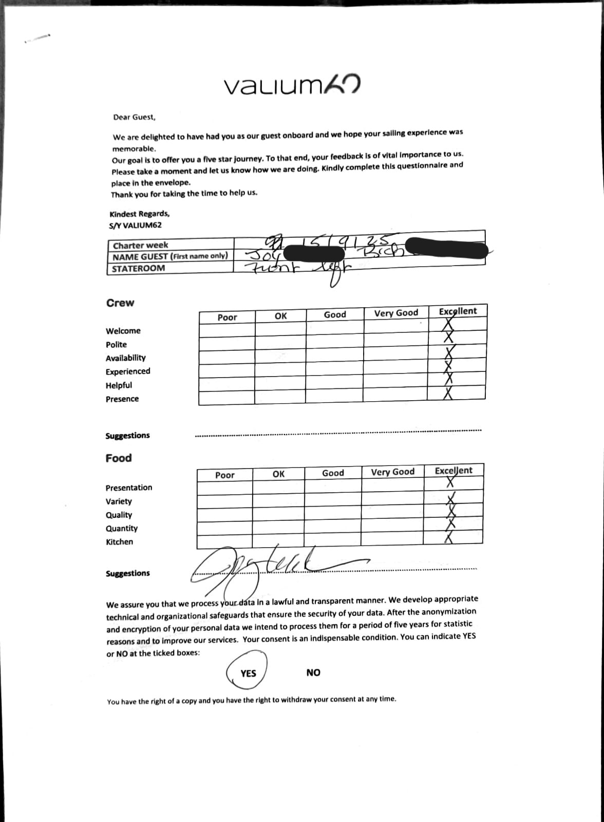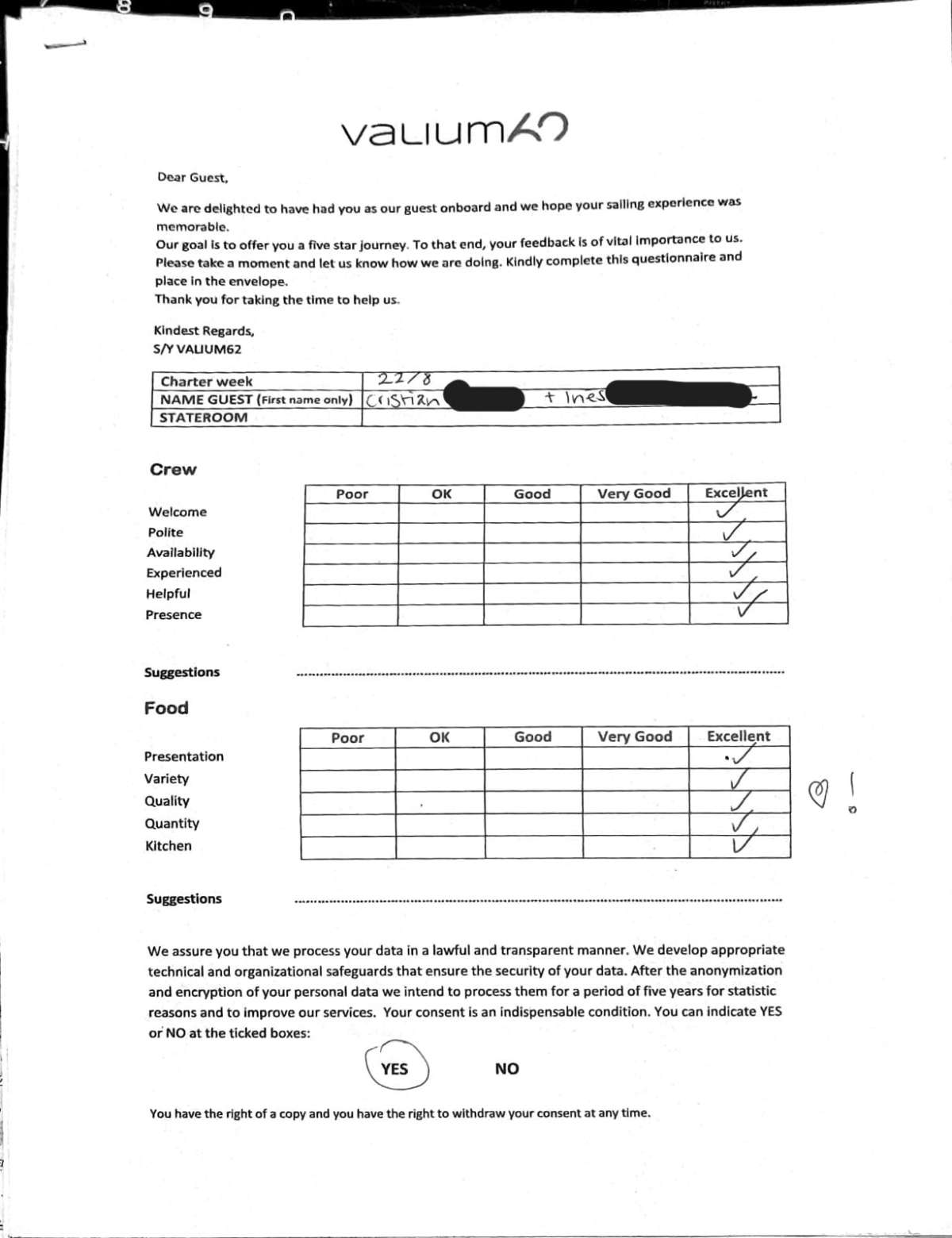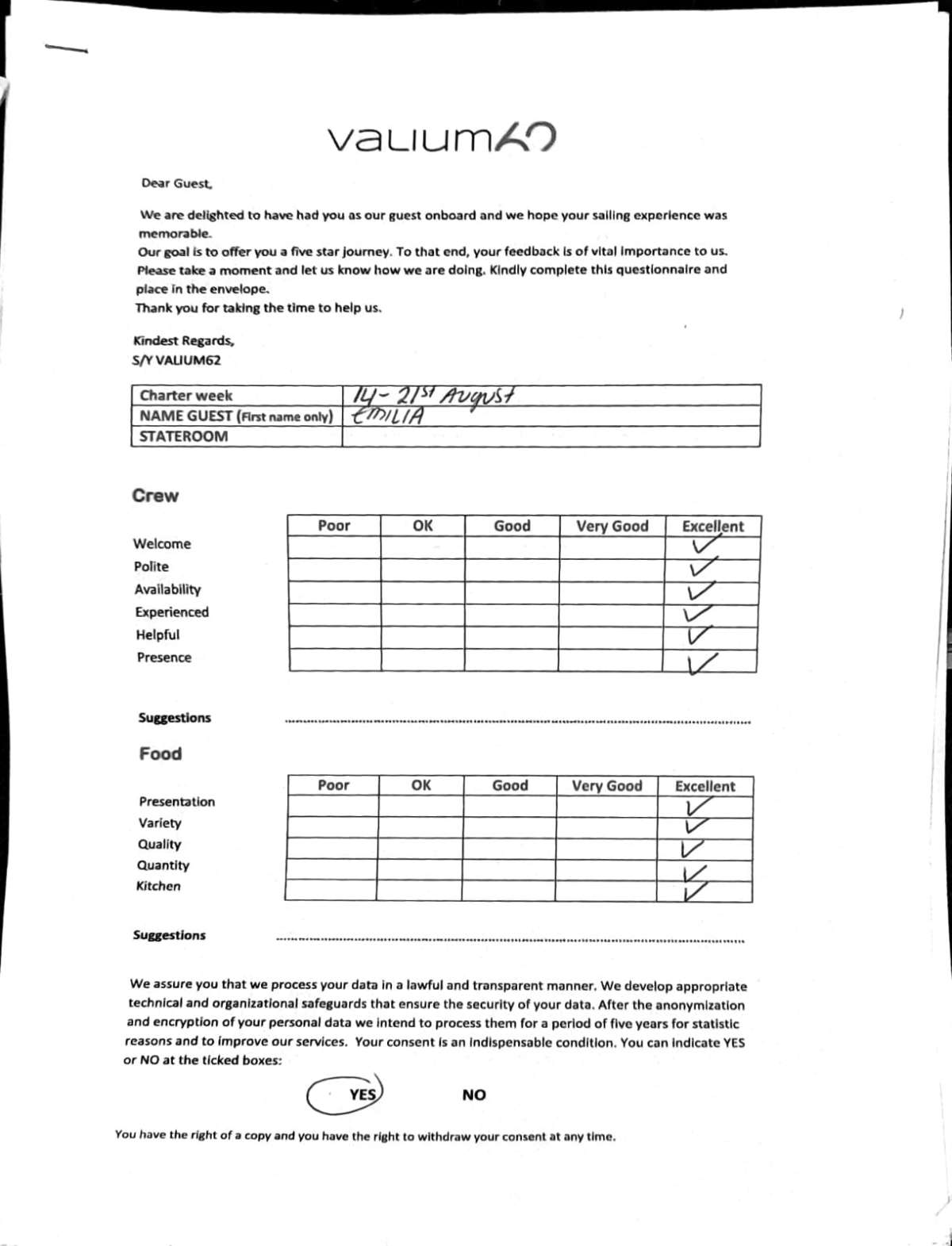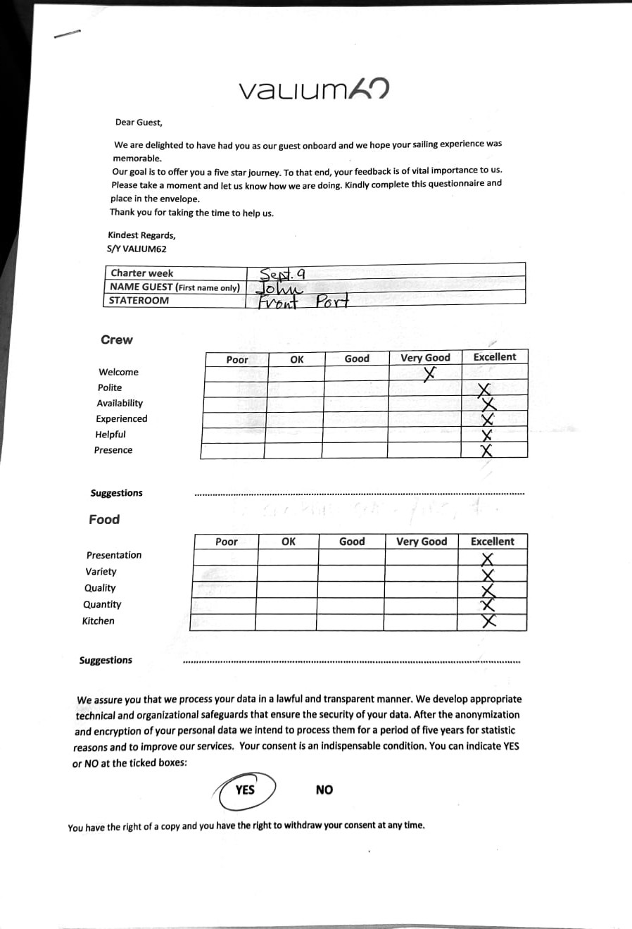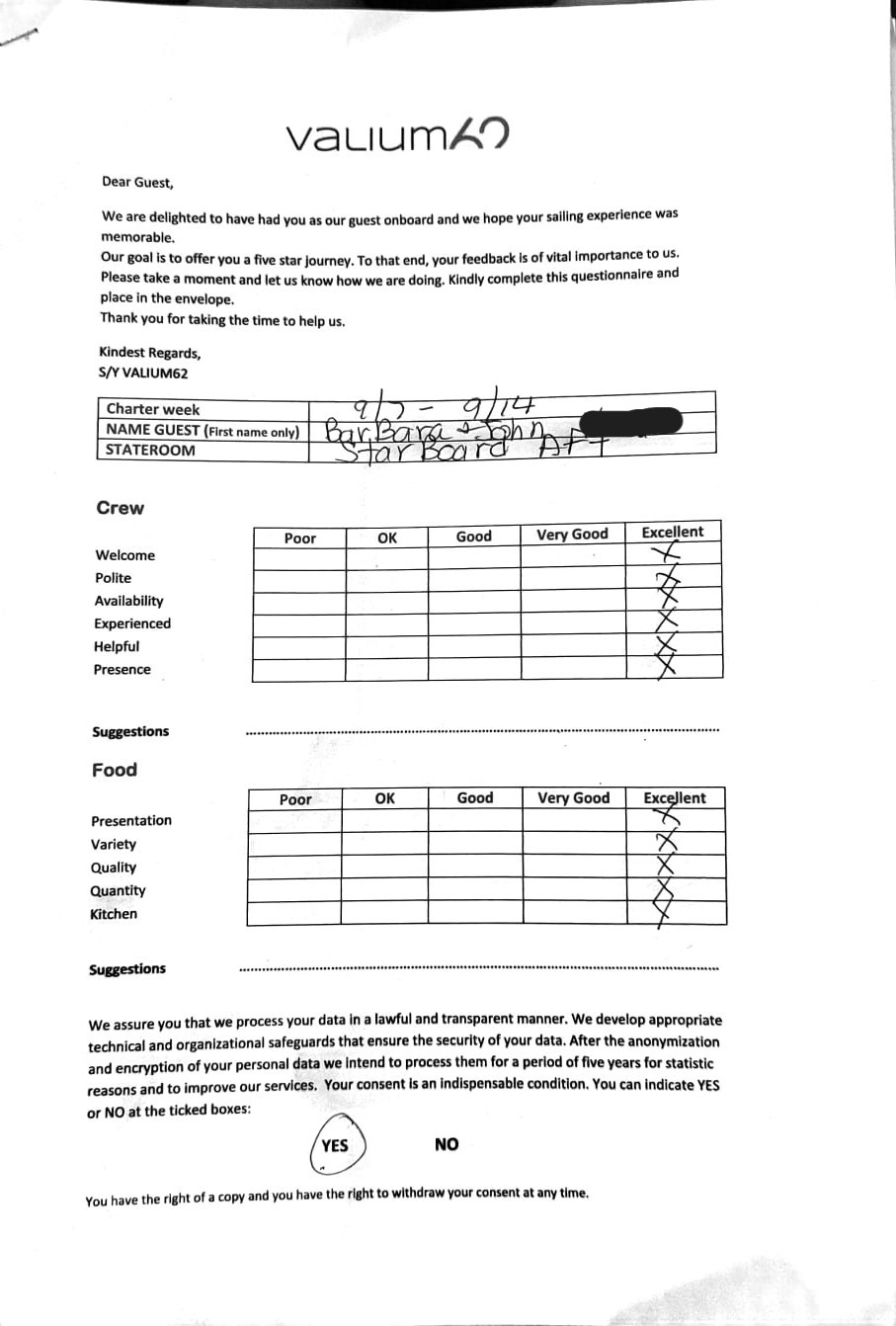 Thank you for making our trip absolute perfection! This holiday was amazing due to the crew of Valium 62. This holiday was nothing less than 5 star service from each meal served, every coctail and every perfect cove selections that we would never have been to if it wasn't for our captain. This week was a dream! Memories for a lifetime! We are forever grateful for your hospitality and opening our souls up to proper Greek culture. We are excited to book our next trip with you. We will be back!19th July to 26th July 2024