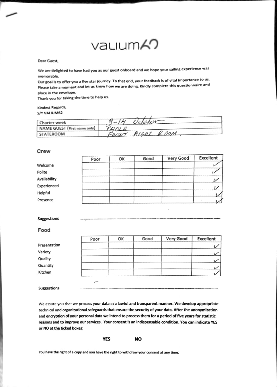 Thank you so so much for all the pampering.. it was an unforgettable experience, a great trip visiting your beautiful country. We are out of words to describe how wonderful our trip was! The food was amazing, the crew was so professional and friendly!I hope we can come visit Greece again and sail with Valium 62 of course!!!