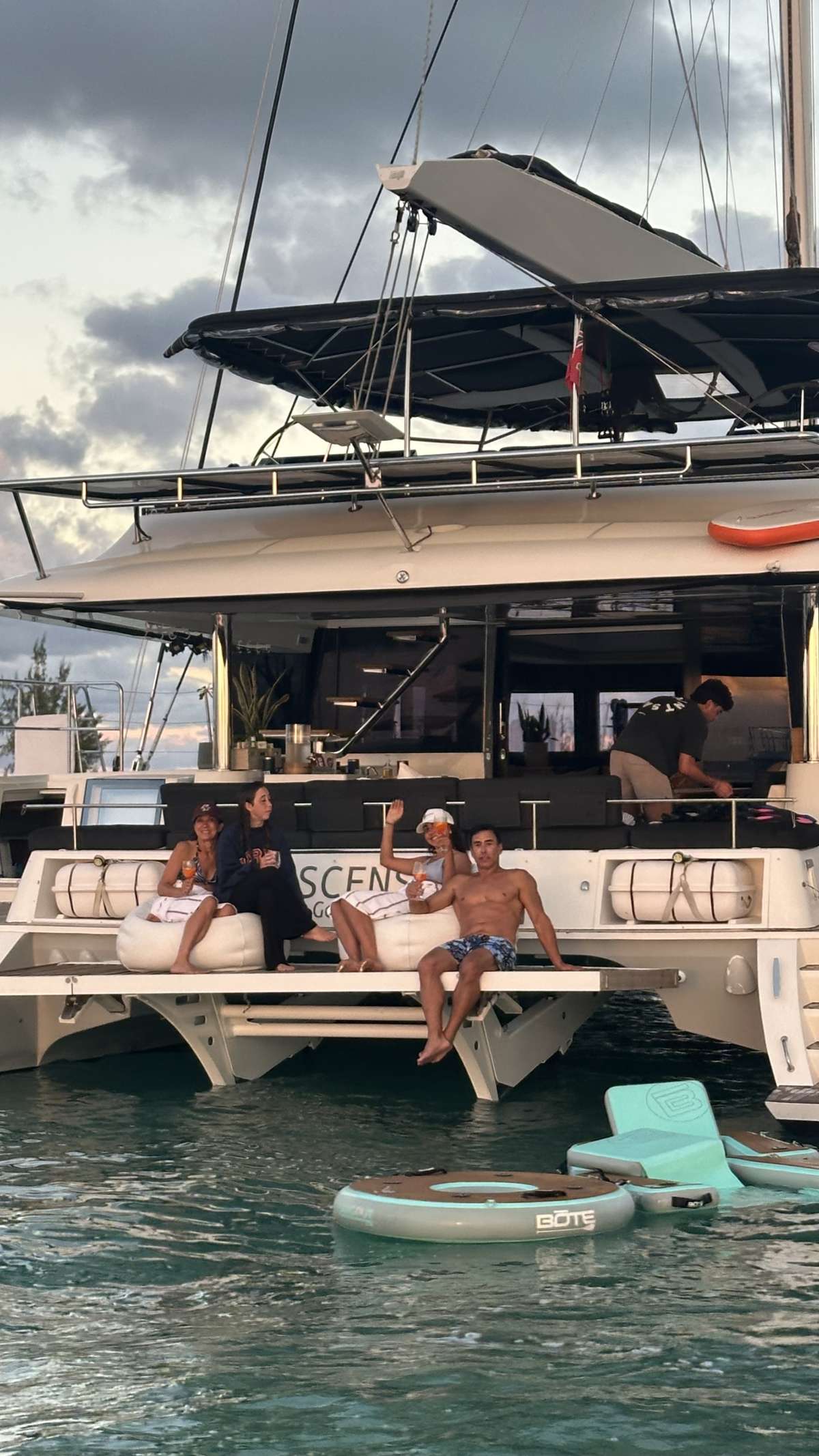 ASCENSION is a Lagoon 620 with a modern, elegant look and serious volume. She sleeps 8 guests in 4 queen cabins, with a bright main-deck saloon and multiple outdoor lounges for sun, shade, and panoramic sunsets.