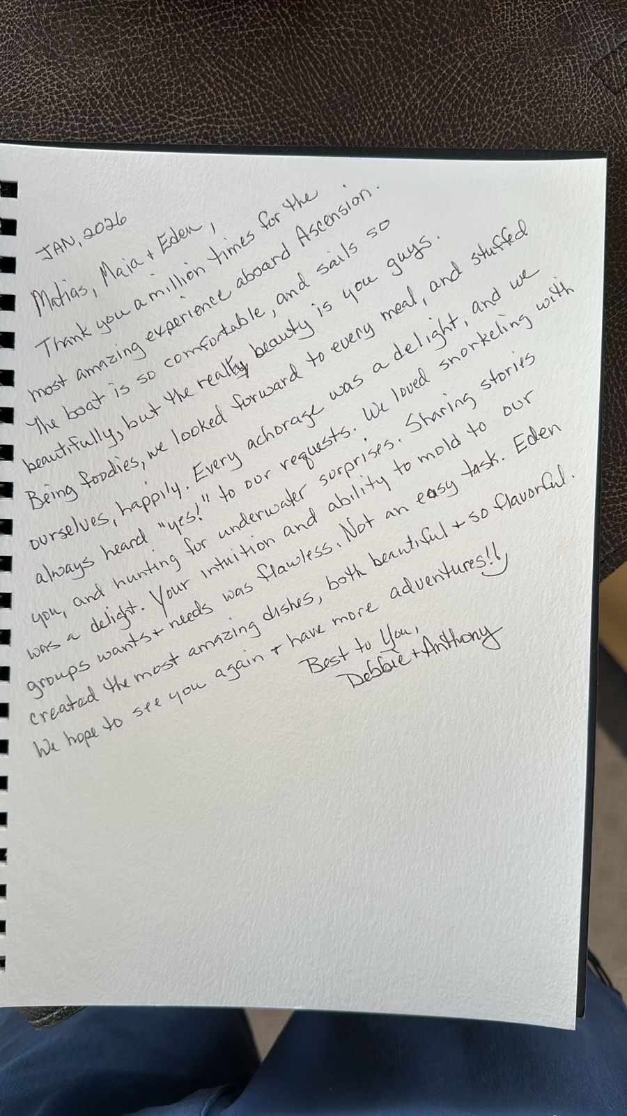 Maia, your music was an absolute joy to listen to that filled our hearts with such pleasure. Don' t ever stop singing and playing the piano and guitar. Matias you made us always feel safe knowing you were in complete control of the boat. Eden, your quiet kindness was a joy to see and and really enjoyed everything you cooked for us. Until we meet again, thank you!!