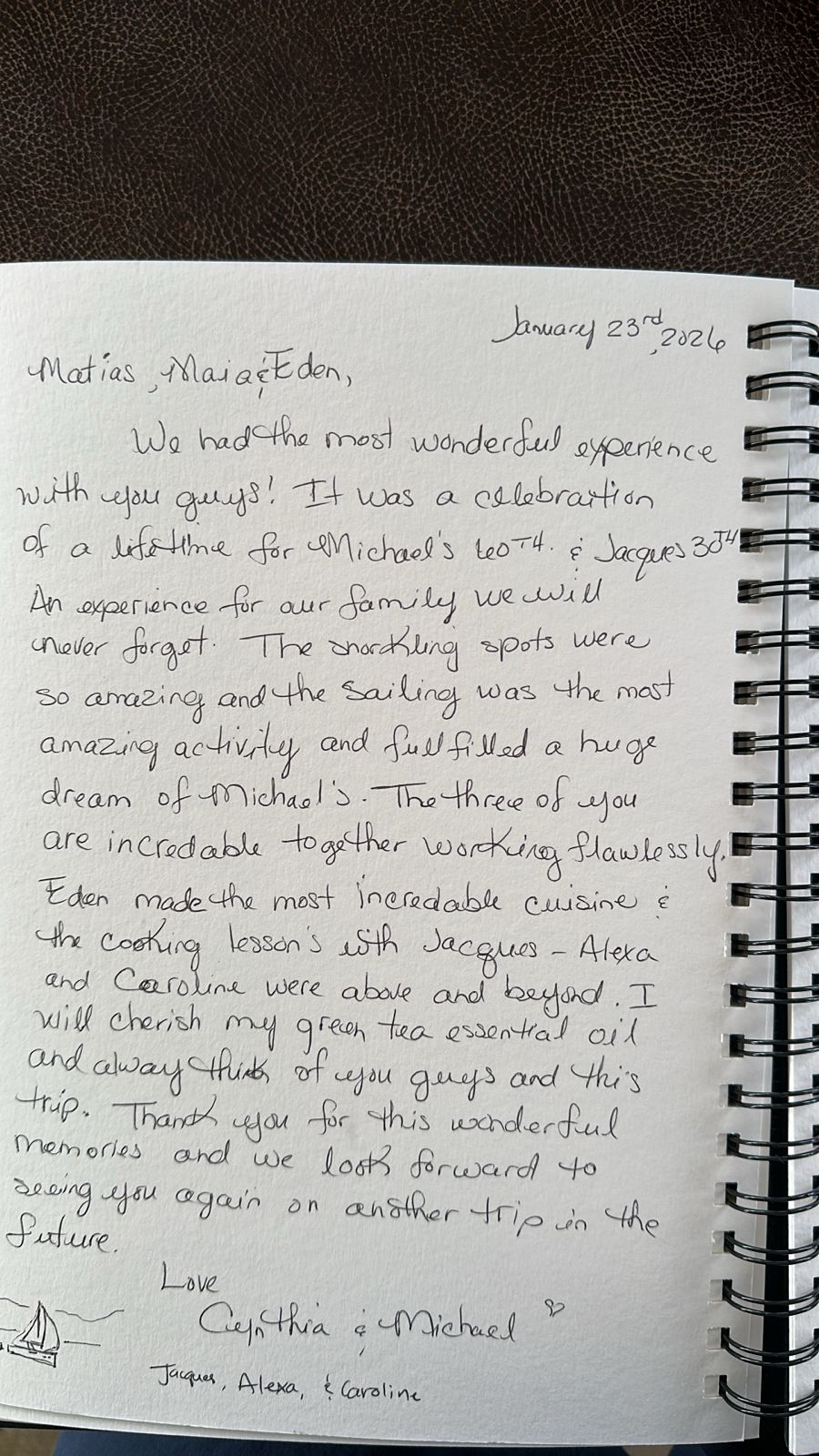 Dear Maia, Mati, and Eden, thank you for that unforgettable week. For us it was truly unique, and for me it meant discovering that traveling around the Caribbean by boat is a deeply enriching and unforgettable experience. And doing it with this crew, who are now our friends, made it even more special!