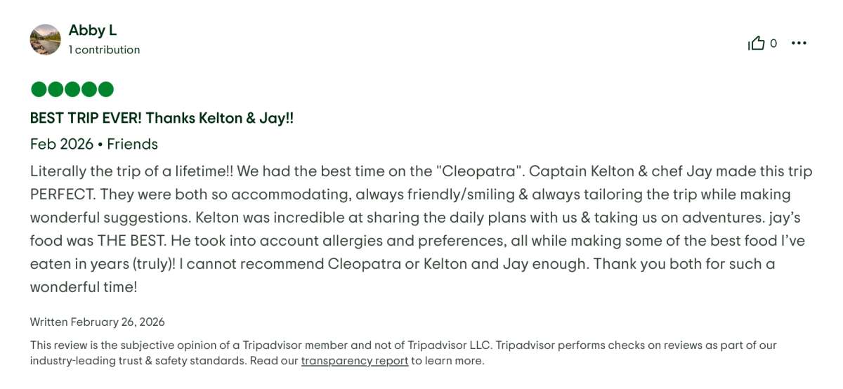Literally the trip of a lifetime!! We had the best time on the "Cleopatra". Captain Kelton & chef Jay made this trip PERFECT. They were both so accommodating, always friendly/smiling & always tailoring the trip while making wonderful suggestions. Kelton was incredible at sharing the daily plans with us & taking us on adventures. jay’s food was THE BEST. He took into account allergies and preferences, all while making some of the best food I’ve eaten in years (truly)! I cannot recommend Cleopatra or Kelton and Jay enough. Thank you both for such a wonderful time!