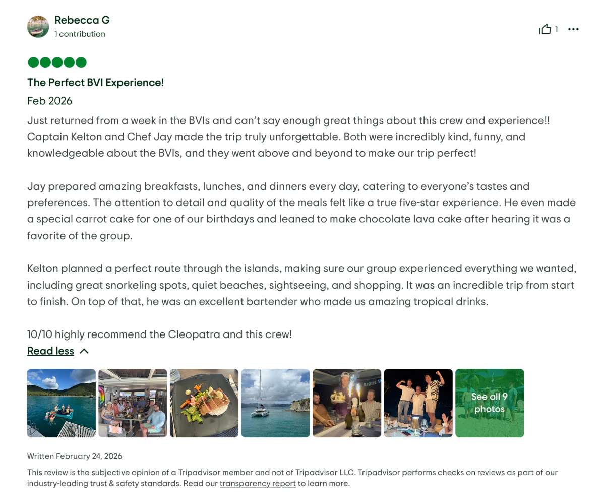 It was the most amazing trip on the Cleopatra catamaran. The boat was absolutely beautiful and we had everything we needed for the 7 days we spent sailing from island to island. Our captain, Kelton, and our chef, Jeandre, went above and beyond to ensure the best experience for us. Everything they did, from taking us on fun hikes with views that were breathtaking, positioning the boat in the bests areas for snorkeling and swimming, to preparing the most beautiful and tasteful meals and drinks made it a 5 star experience. They took us to all of the beautiful spots we wanted to see and they always had drinks and snacks for us ready on the spot. It was a memorable time we will cherish until next time on Cleopatra.