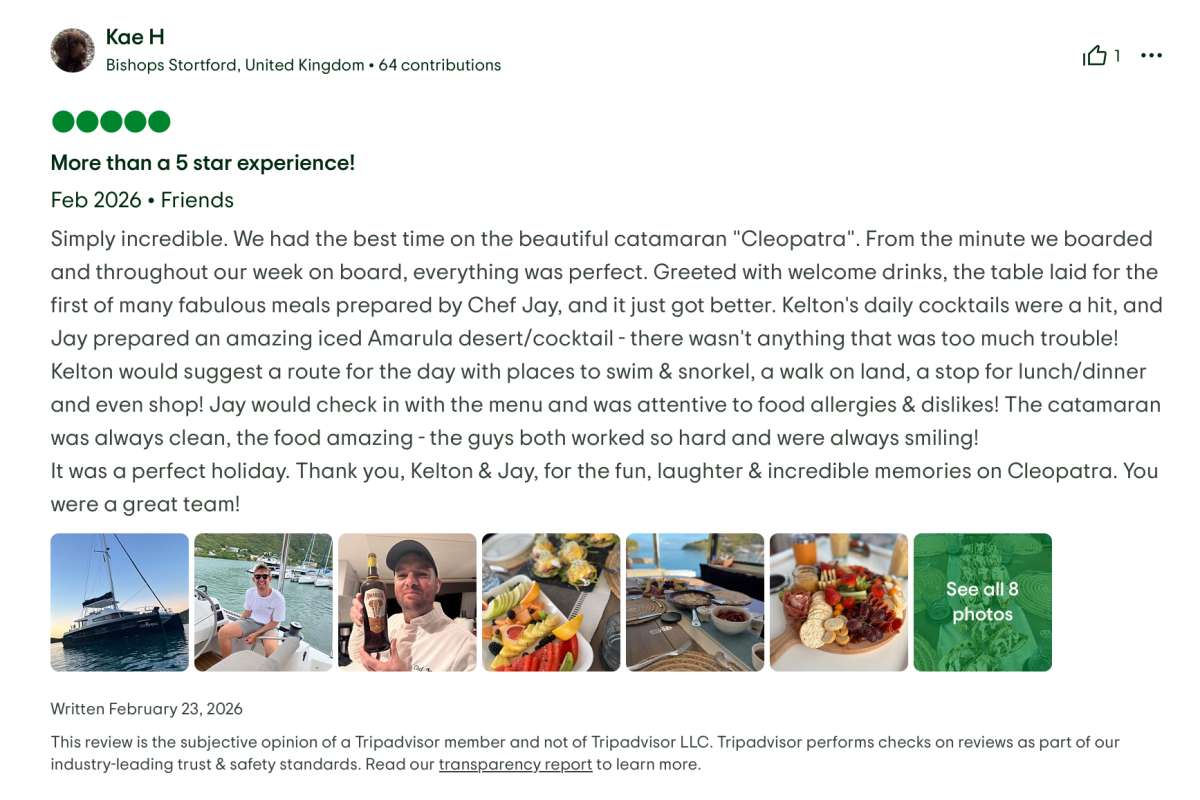 Simply incredible. We had the best time on the beautiful catamaran "Cleopatra". From the minute we boarded and throughout our week on board, everything was perfect. Greeted with welcome drinks, the table laid for the first of many fabulous meals prepared by Chef Jay, and it just got better. Kelton's daily cocktails were a hit, and Jay prepared an amazing iced Amarula desert/cocktail - there wasn't anything that was too much trouble!