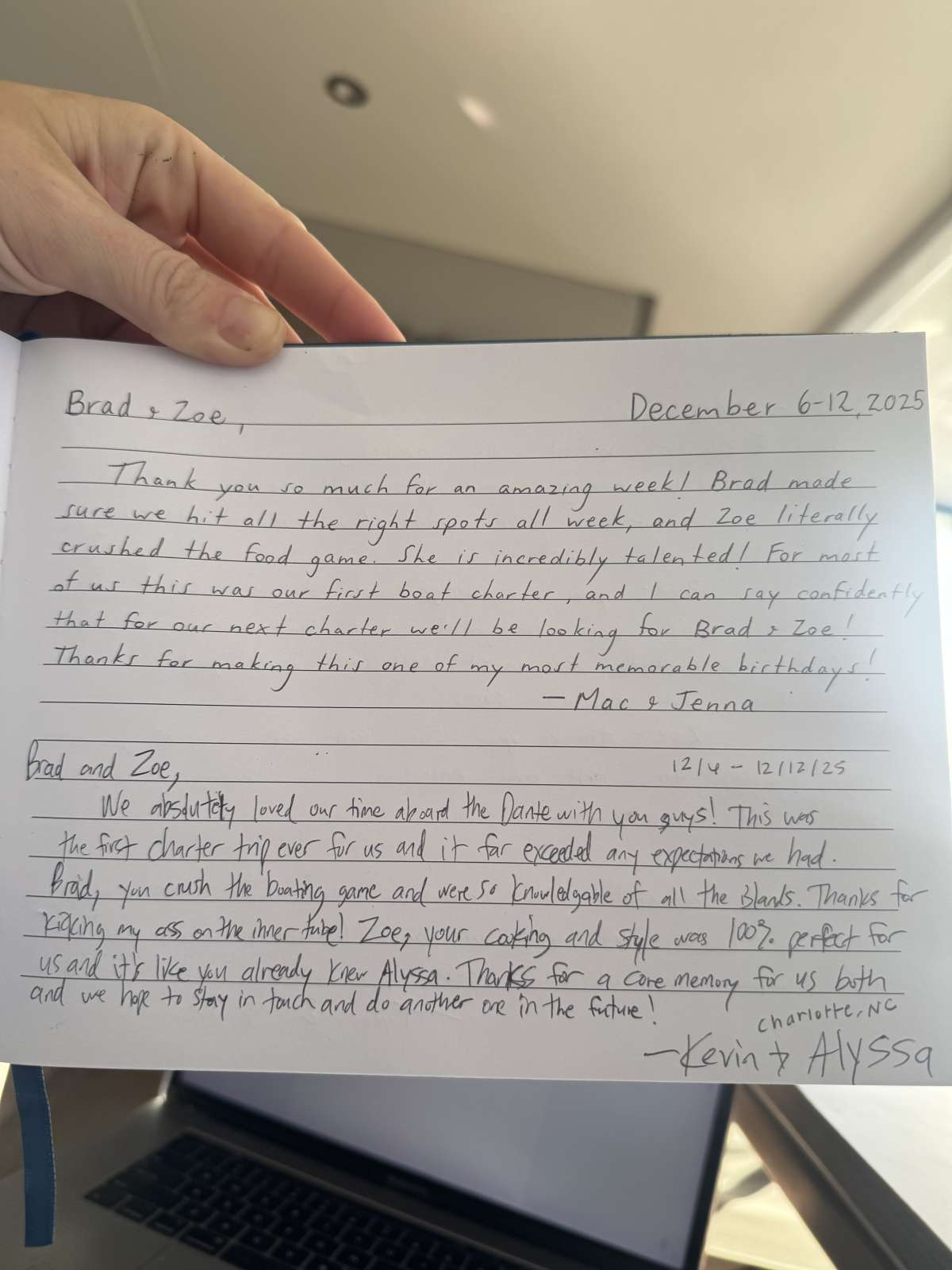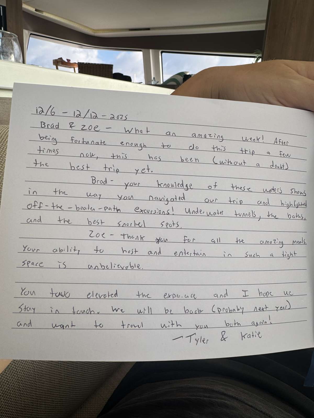 Thank you, thank you so much. We had such a lovely time on PurelyBlu. Captain Brad and Zoe were fantastic. They were attentive and adaptable to all our needs. They were there when we needed them and ghosts when it was family time. They always seemed to anticipate our needs. Overall this will go down as one of our best family vacations.