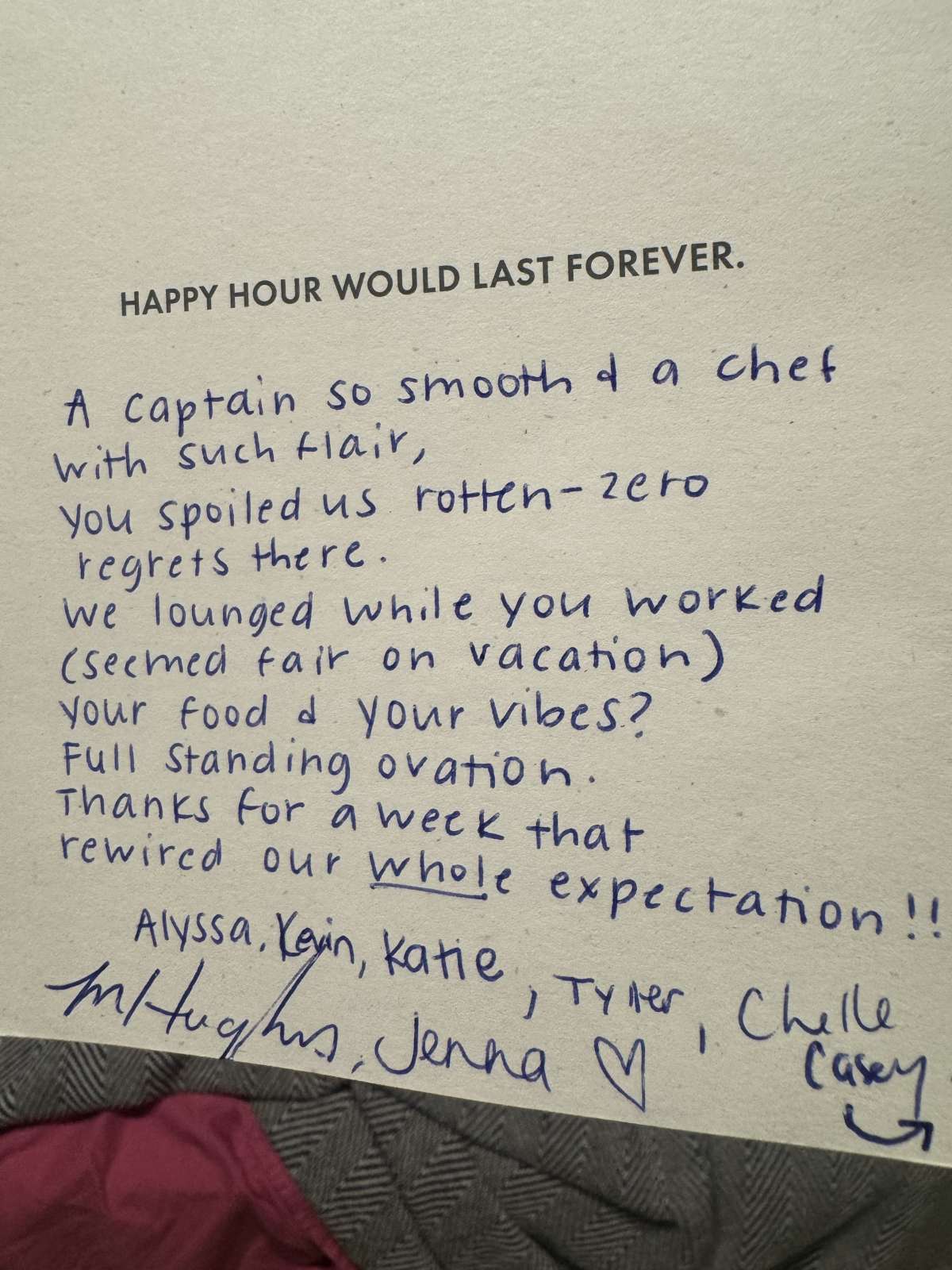 Thank you so much for an amazing week! Brad made sure we hit all the right spots all week, and Zoe literally crushed the food game. She is incredibly talented! For most of us this was our first boat charter, and I can say confidently that for our next charter we’ll be looking for Brad & Zoe! Thanks for making this one of my most memorable birthdays!
