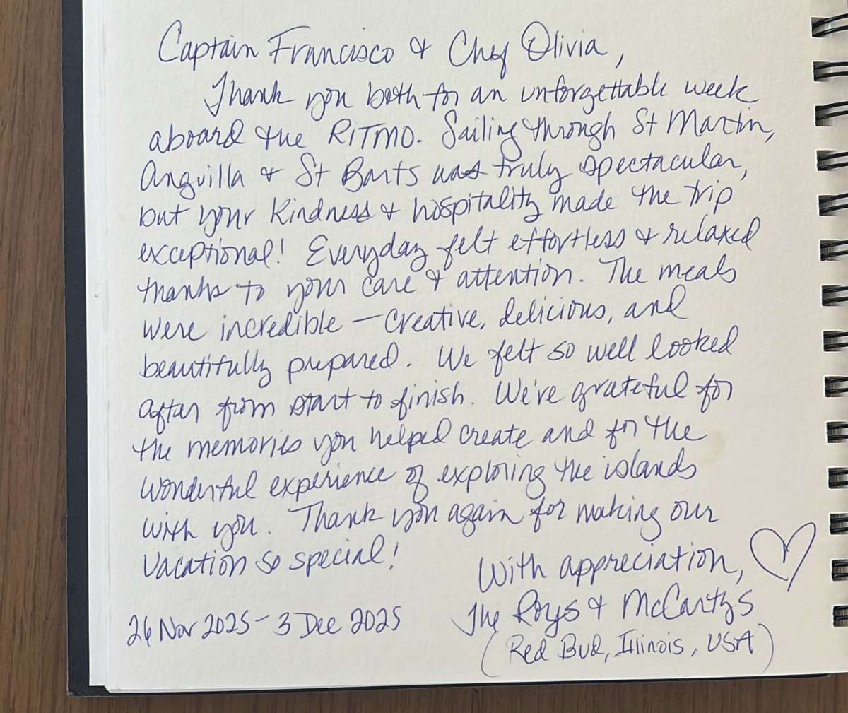 Thank you for an unforgettable week onboard Ritmo Sailing through St Martin, Anguilla and St BArths was truly spectacular, but your kindness and hospitality made the trip exceptional! Everyday felt effortless and relaxed thanks to your care and attention. The meals were incredible, creative, delicious and beautifully prepared, We felt so well looked after from start to finish. We are grateful for the memories your helped create and for the wonderful experience of exploring the islands with you. Thank You again for making our vacation so special!