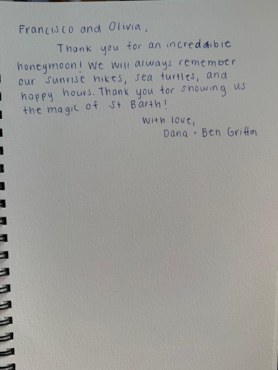 Francisco and Olivia, Thank you for an incredible honeymoon! We will always remember our sunrise hikes, sea turtles, and happy hours. Thank you for showing us the magic of St Barts! With Love, Dana and Ben
