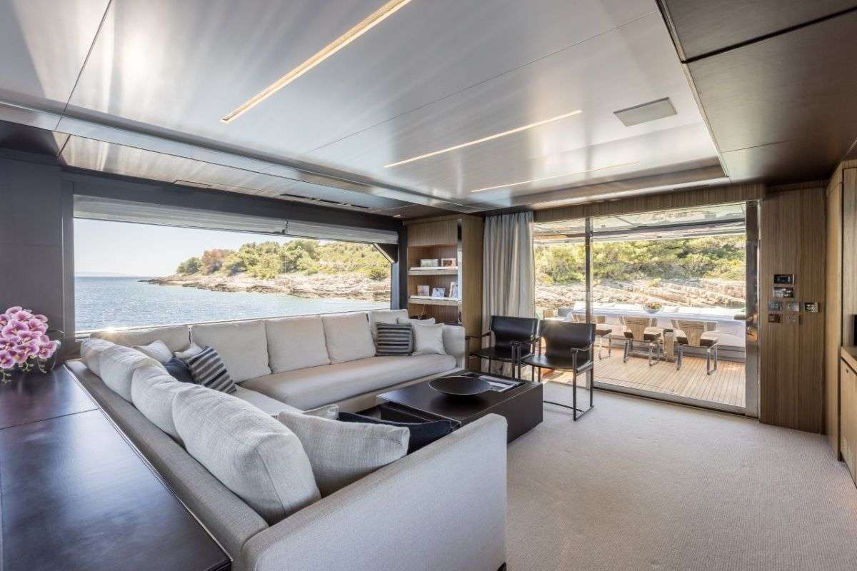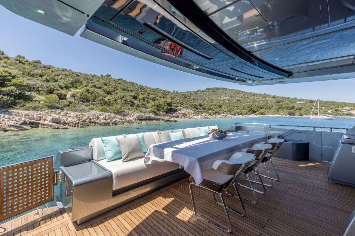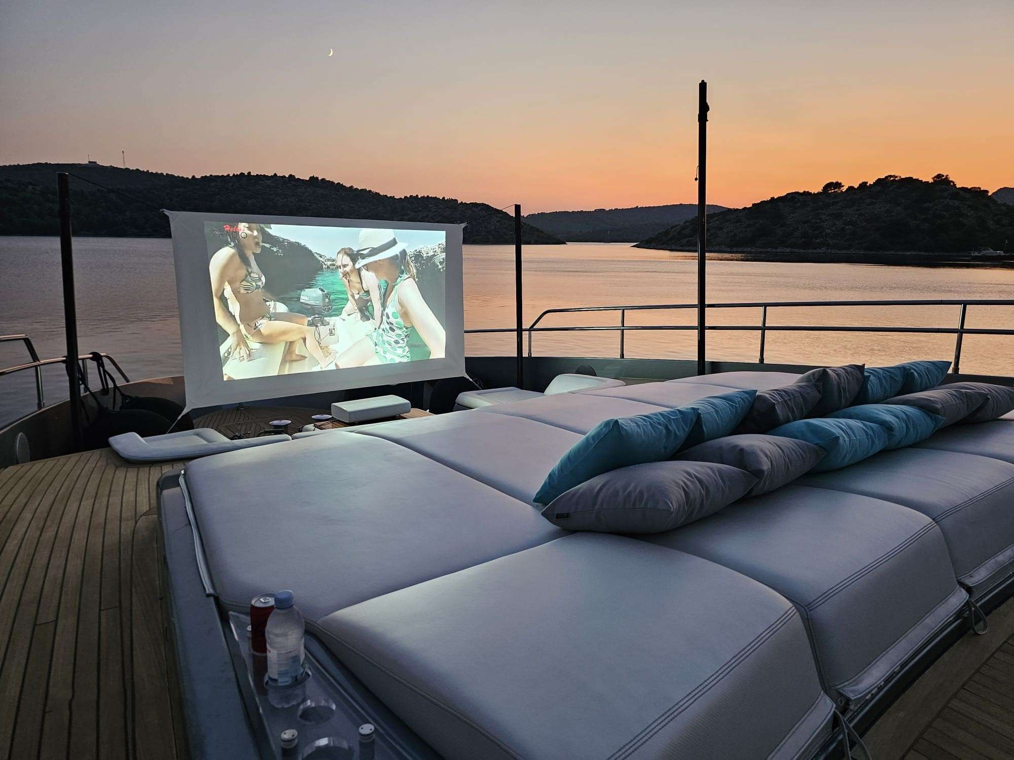 Additional onboard amenities include an open-air cinema and generous lounge areas, complemented by a dedicated crew of six who deliver discreet, professional service throughout the charter.