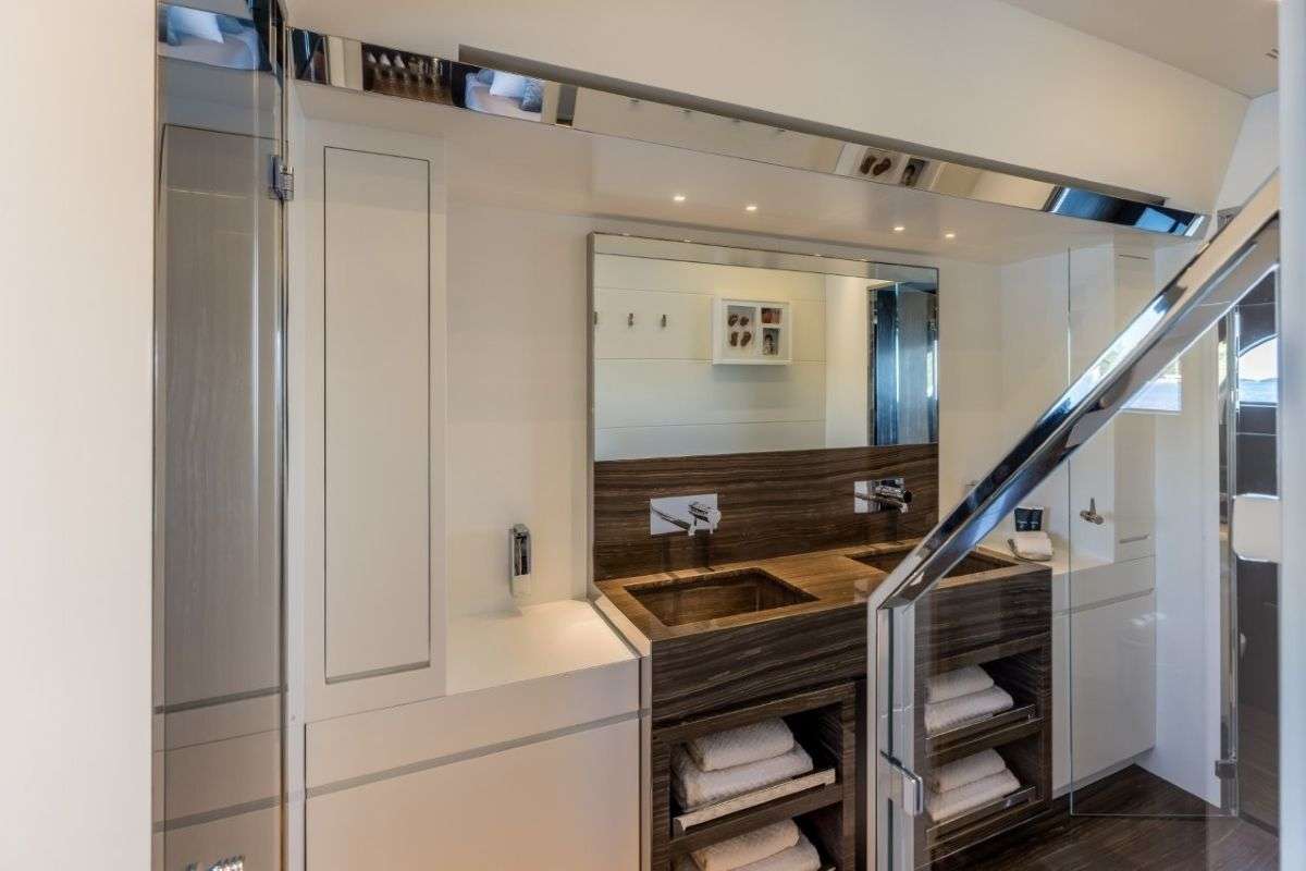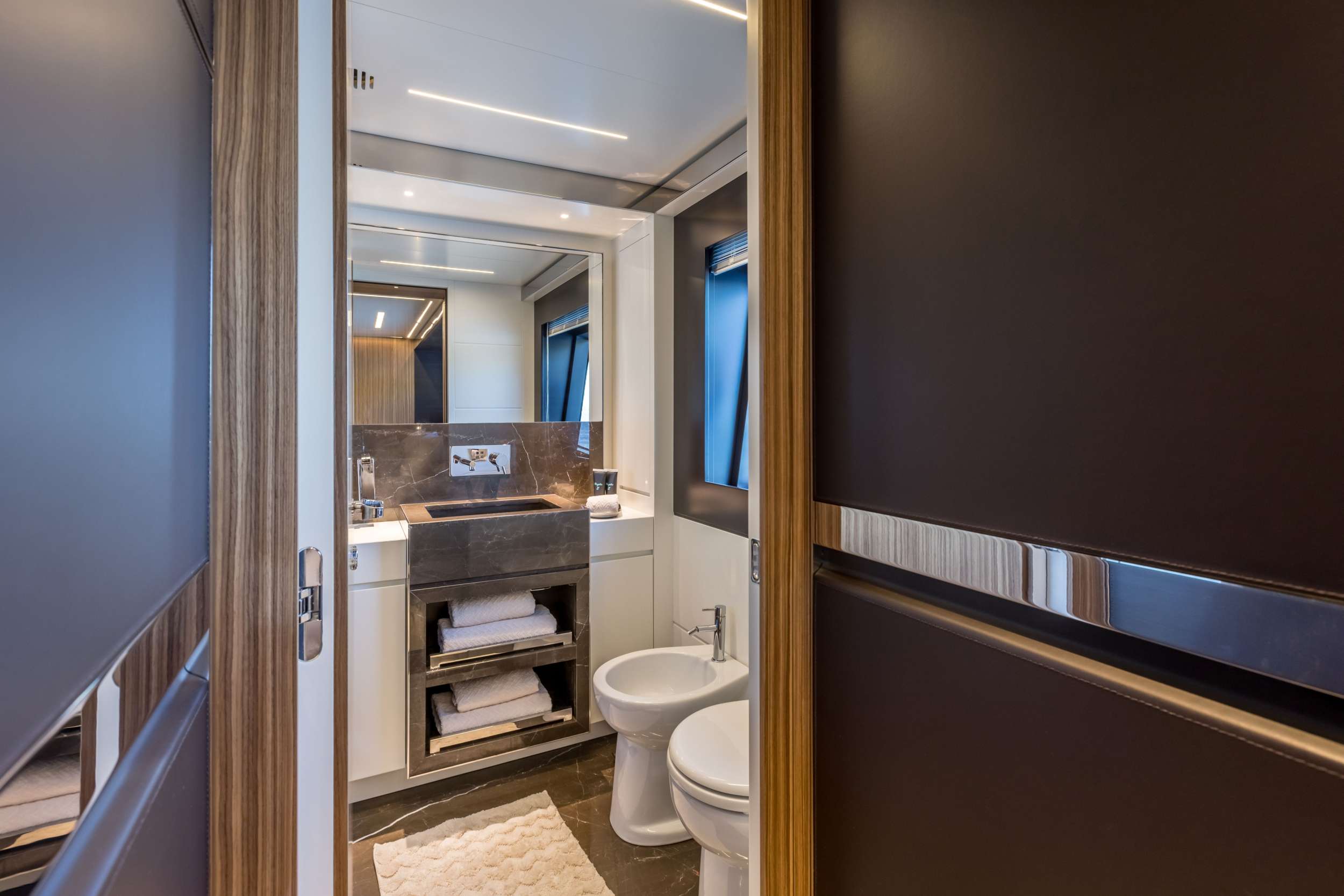 Her distinctive exterior reflects a dynamic and modern profile, while her wide-body configuration enhances interior volume and livability. A highlight of the layout is the expansive master stateroom located on the main deck, offering a private suite typically found on much larger yachts. Below deck, four well-appointed double guest cabins, provide flexible accommodation for up to 10 guests all together.