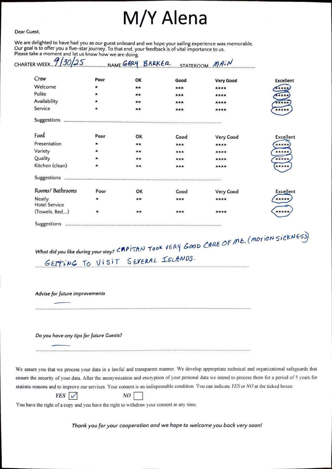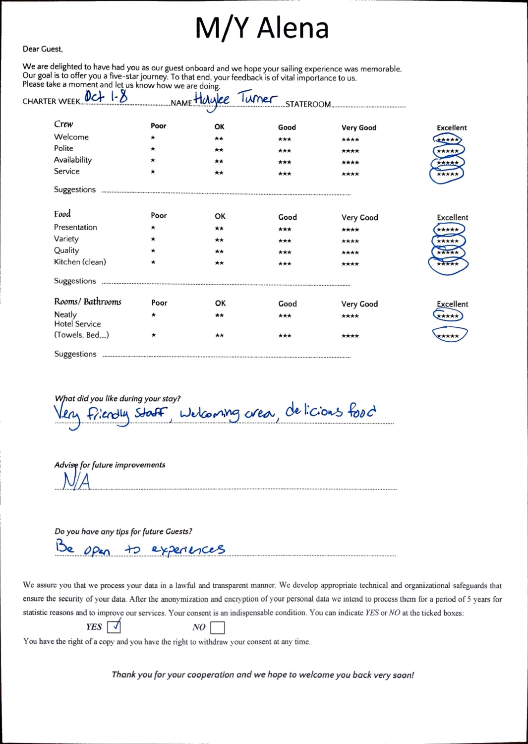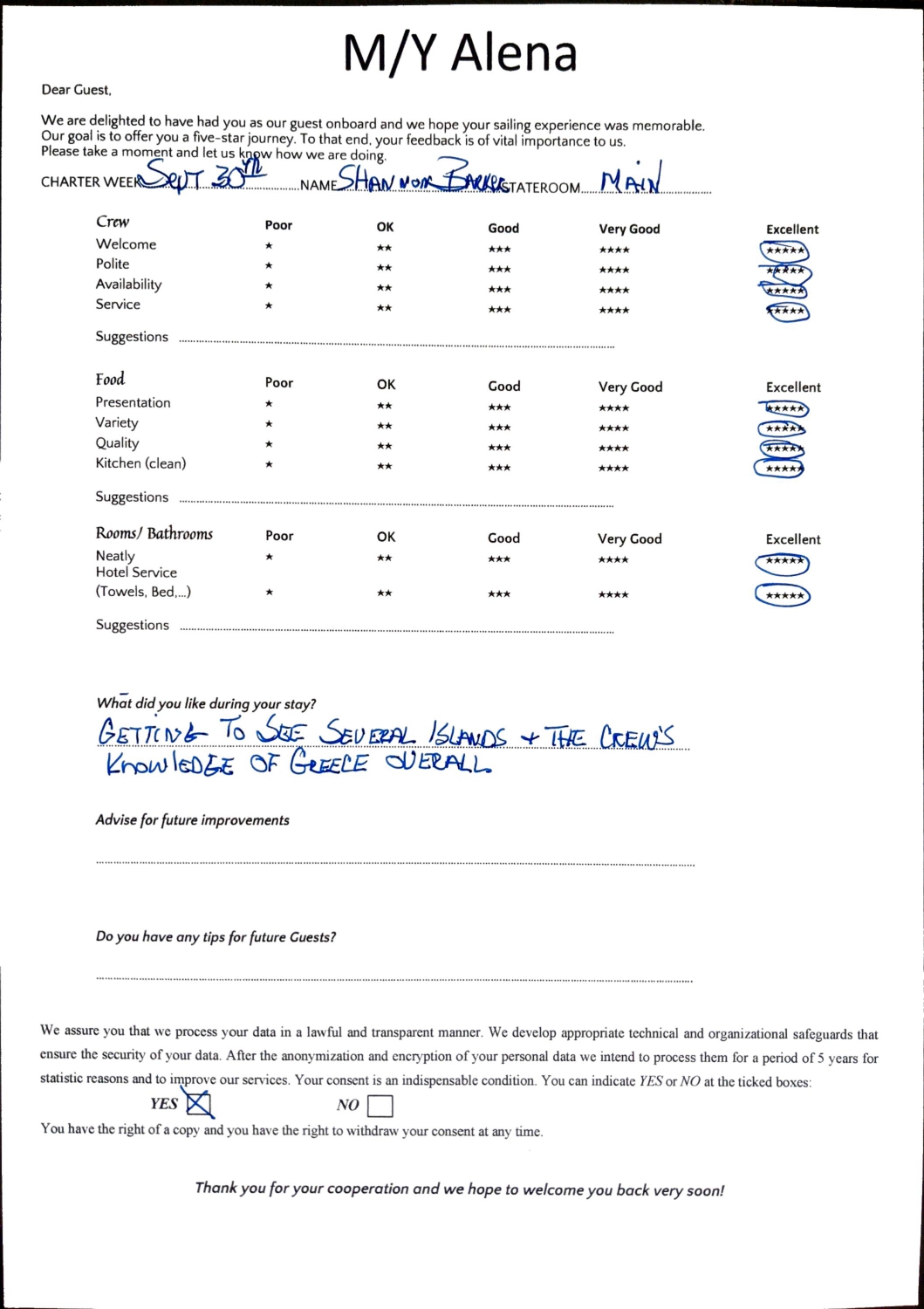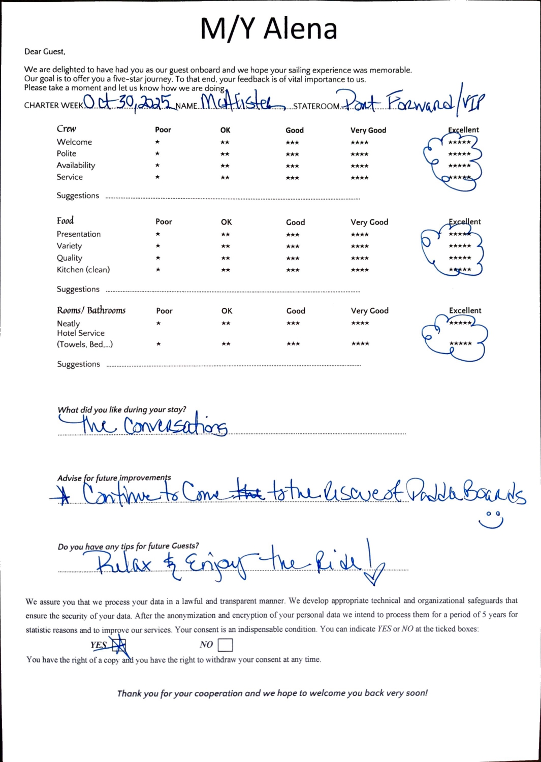 He is familiar with the latest culinary trends and developments, is able to adapt his menu to different guest preferences and is continually looking to improve and evolve his skills and techniques to provide the best dining experience for his guests on board! He is excited to further continue to grow and develop in his field as a yacht chef on Alena and is grateful for the challenges and rewards the yacht industry and the personal guest feedback brings with it.