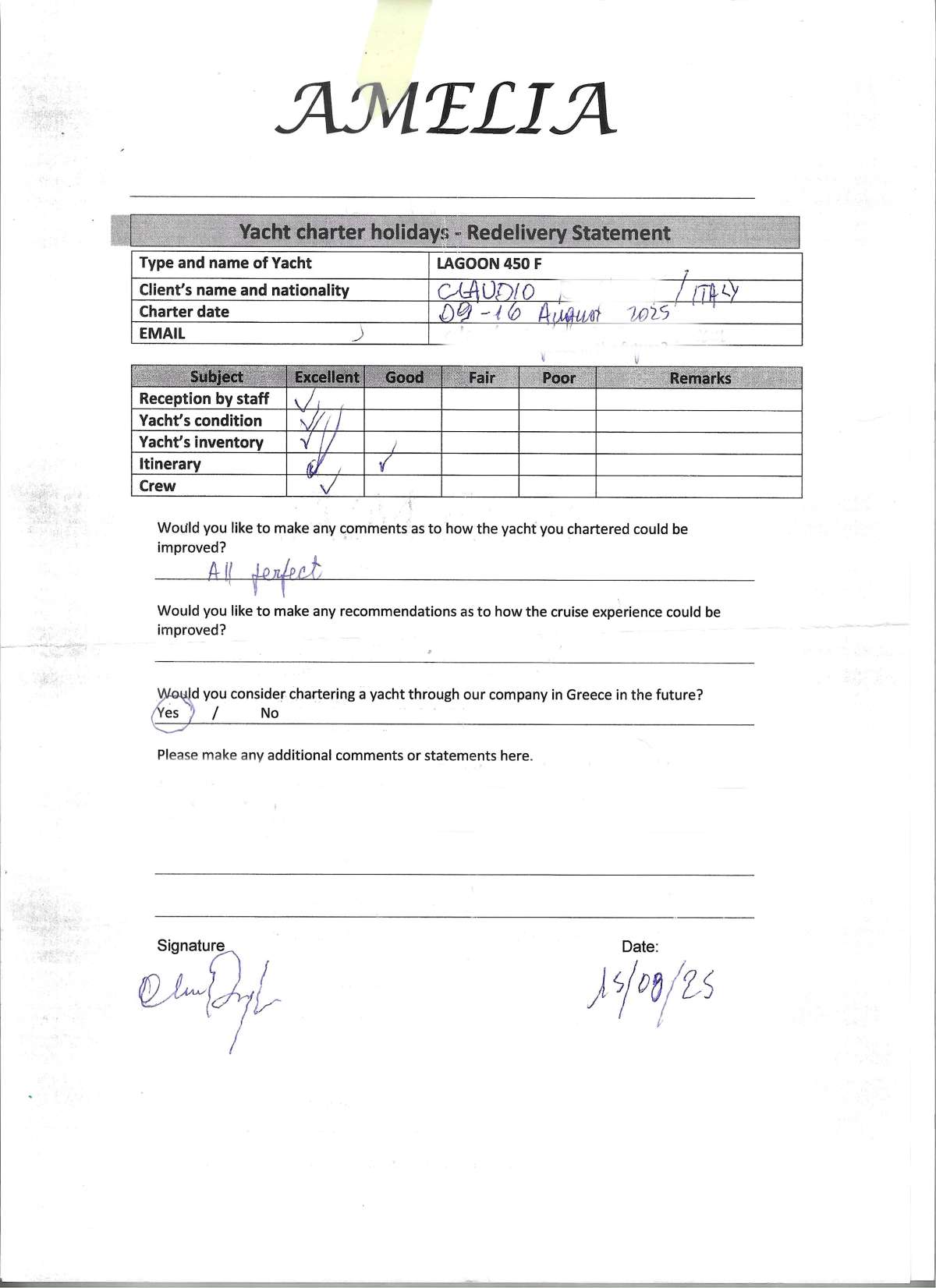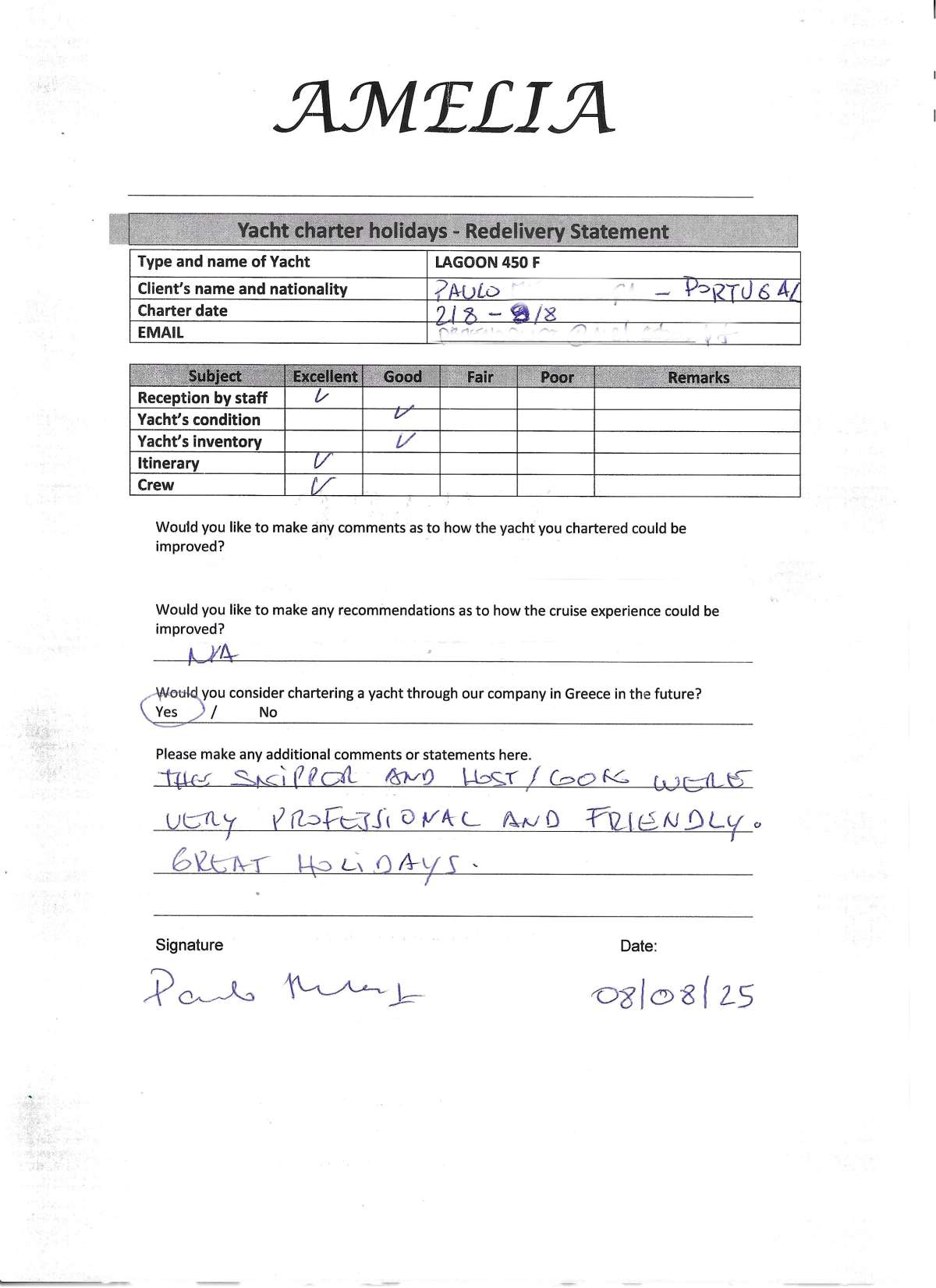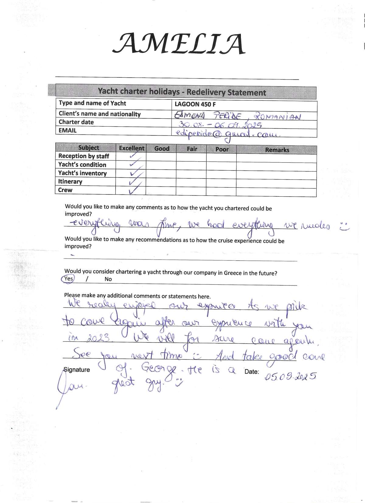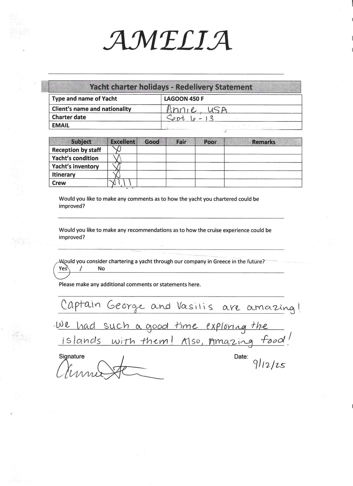 Thank you for everything. Amelia was an amazing experience and Greece was truly incredible. I will be in touch again next year and hopefully I can get a larger group to come.