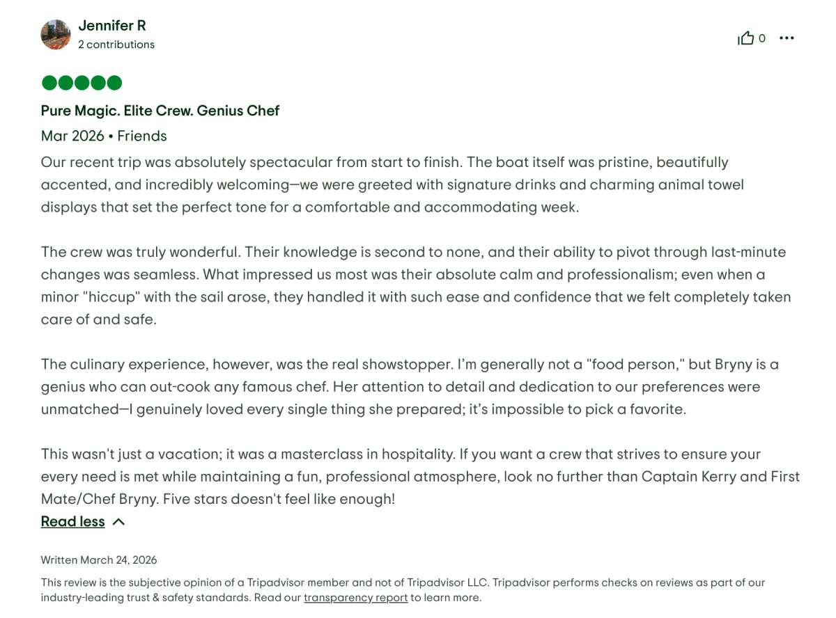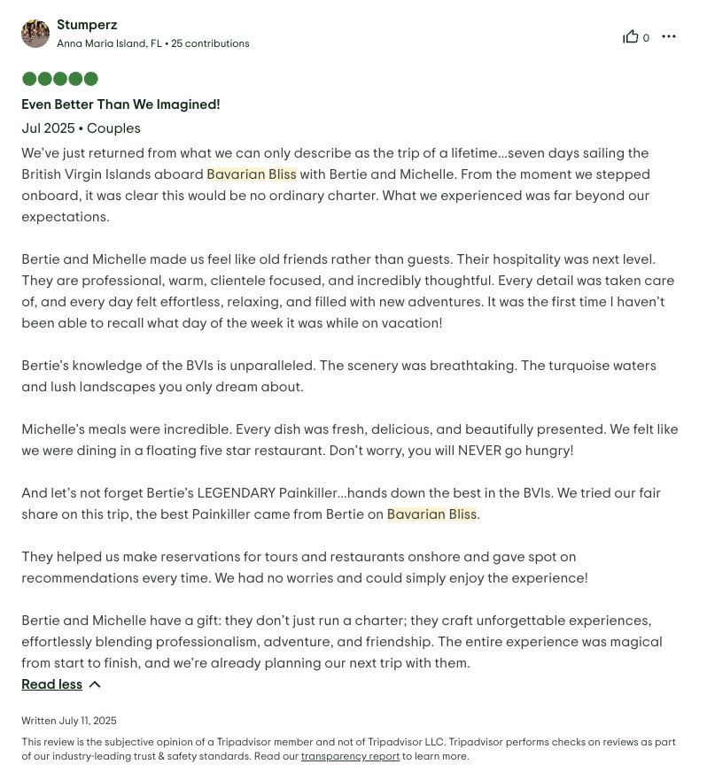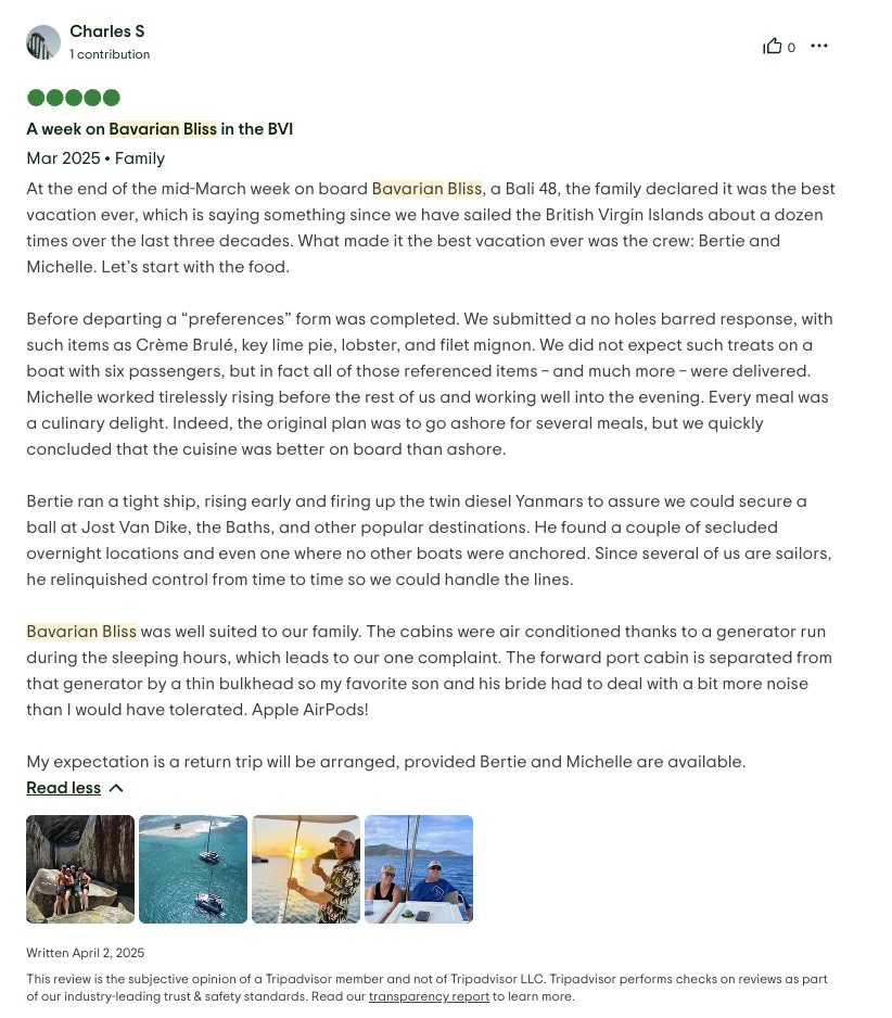 Bavarian Bliss accommodates up to 8 charter guests in 3 spacious queen cabins and 1 twin cabin each with en-suite facilities and individually controlled air conditioning. The yacht is equipped with solar panels, a water maker, and a full-sized refrigerator. Guests can enjoy a customizable menu, a fully stocked bar, a coffee/espresso machine, snorkeling gear, 2 stand-up paddleboards, a towable water tube, a 10-ft floating dock, fishing gear, and a Bluetooth sound system.