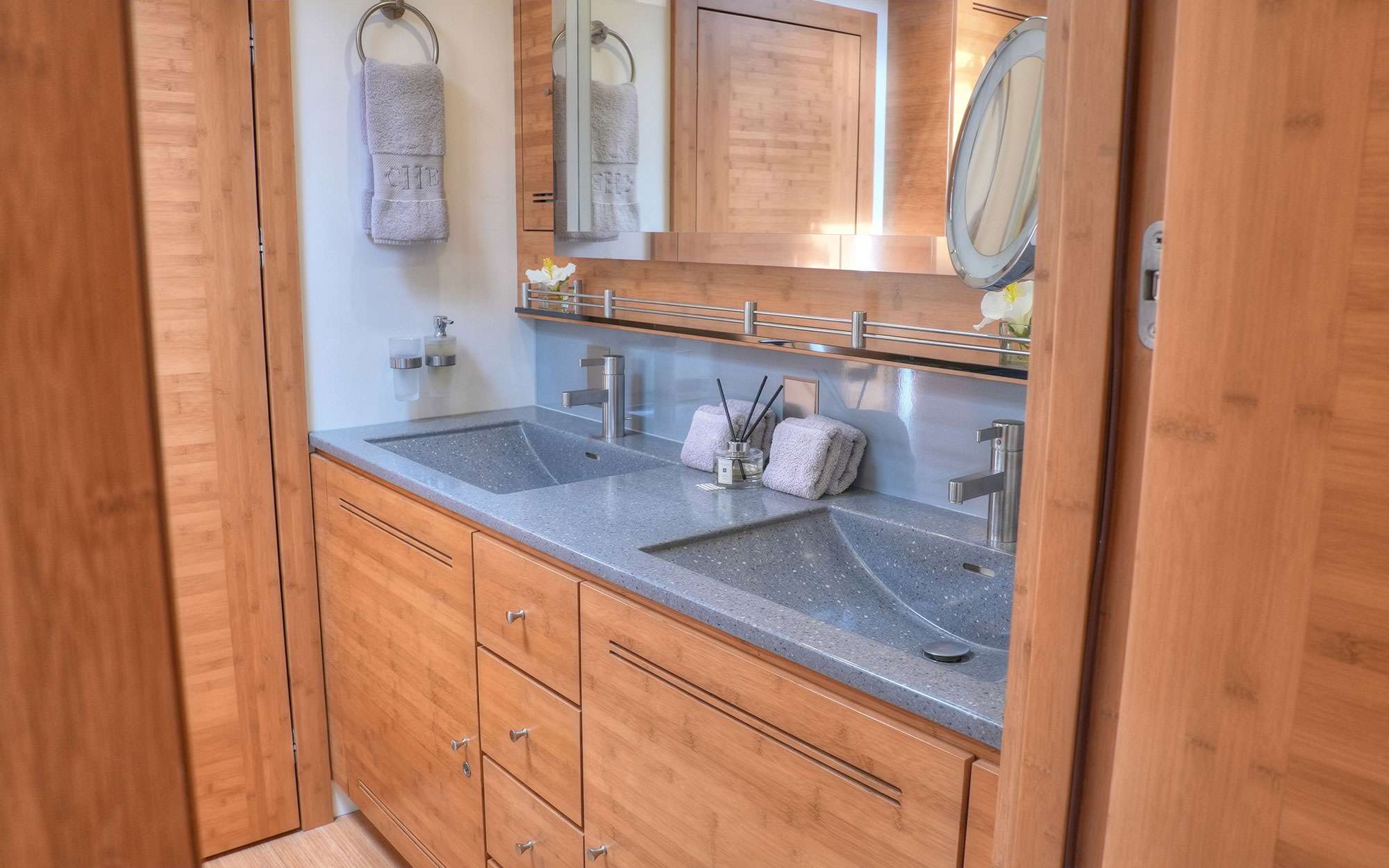 Sous Vide NY Strip finished on the grill with porcini cous cous, oven dried cherry tomatoes, grilled vegetables, fresh herbs, and balsamic reduction.