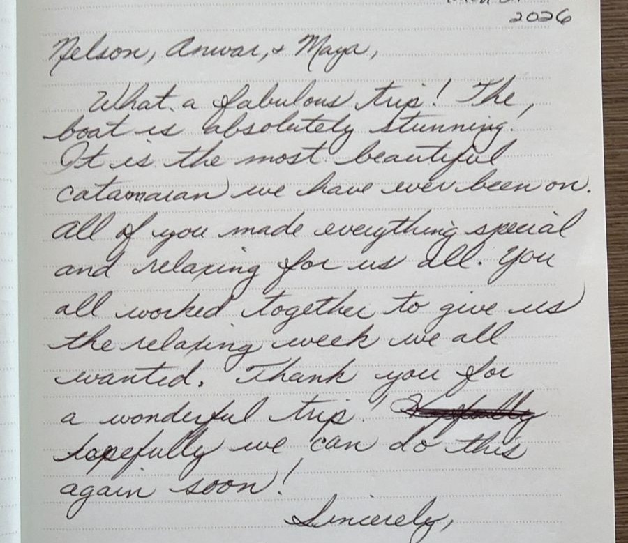 We are so thankful for our time with you. The beautiful boat will not be forgotten and certainly we will never forget your hospitality and care.You brought us all great joy !A & G