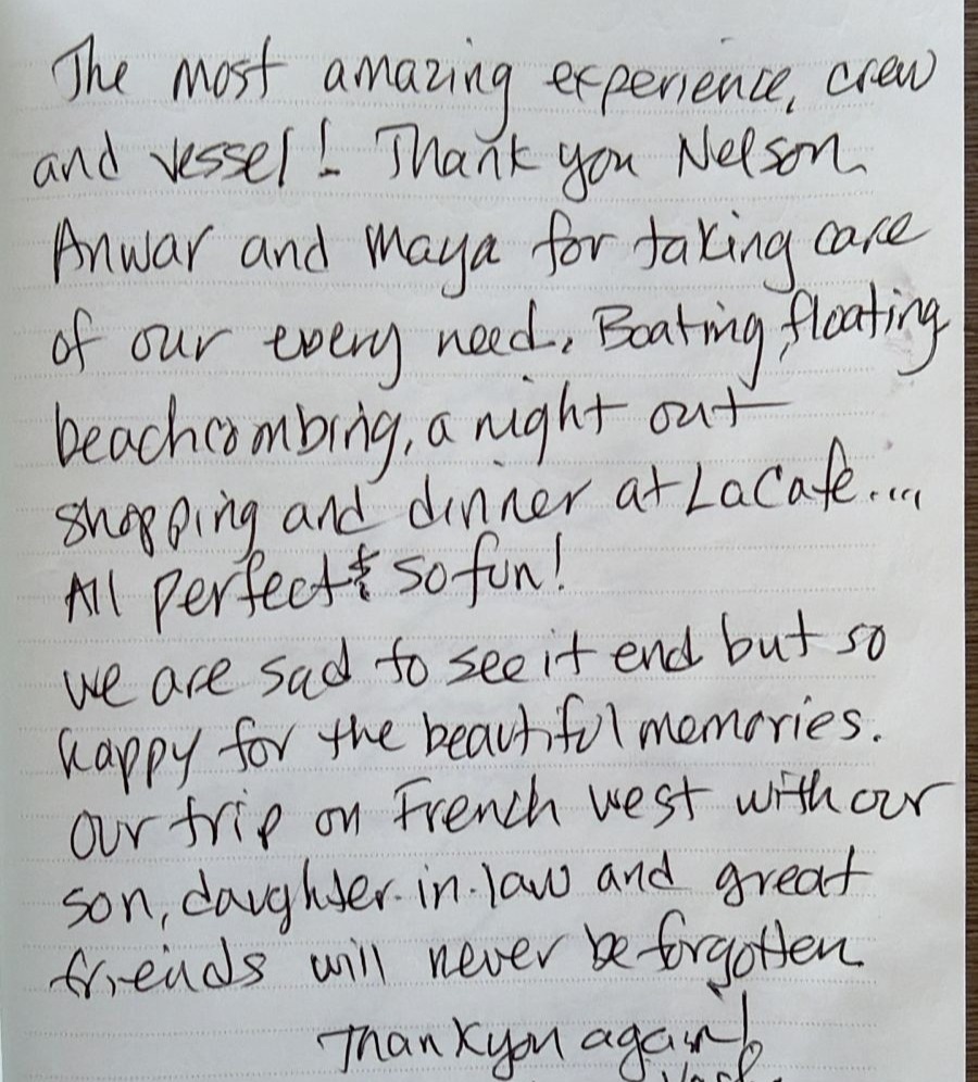 Thank you all for a trip to always remember and be grateful for. The French West is not only a beautiful boat but is run by such beautiful, capable and fun staff. Every detail was considered by the « dream team » and provided. May you continue to enjoy your position to help peoplesee the beauty of the sea.