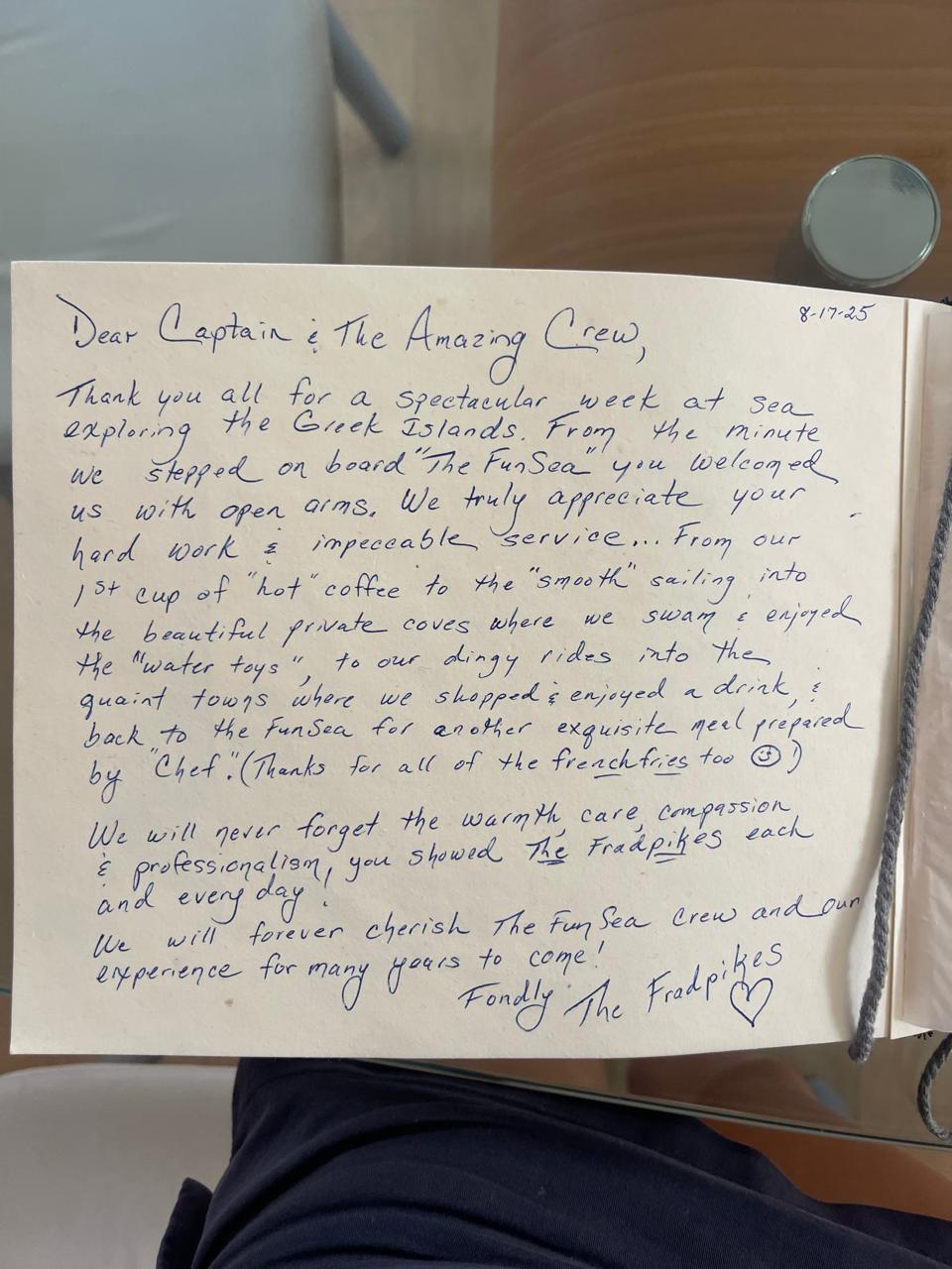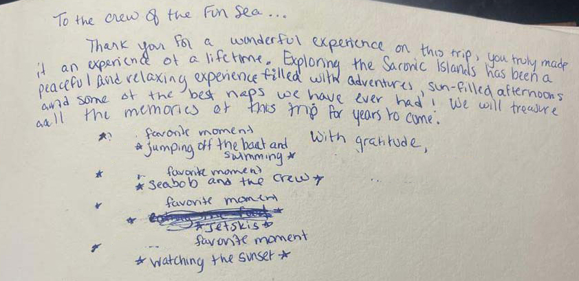 To the crew of the FUNSEA.....Thank you for a wonderful experience on this trip, you truly made it an experience of a lifetime. Exploring the Saronic islands has been a peaceful, bird relaxing experience filled with adventures, sun-filled afternoons, and some of the best naps we have ever had. We will treasure all the memories of this trip for years to come