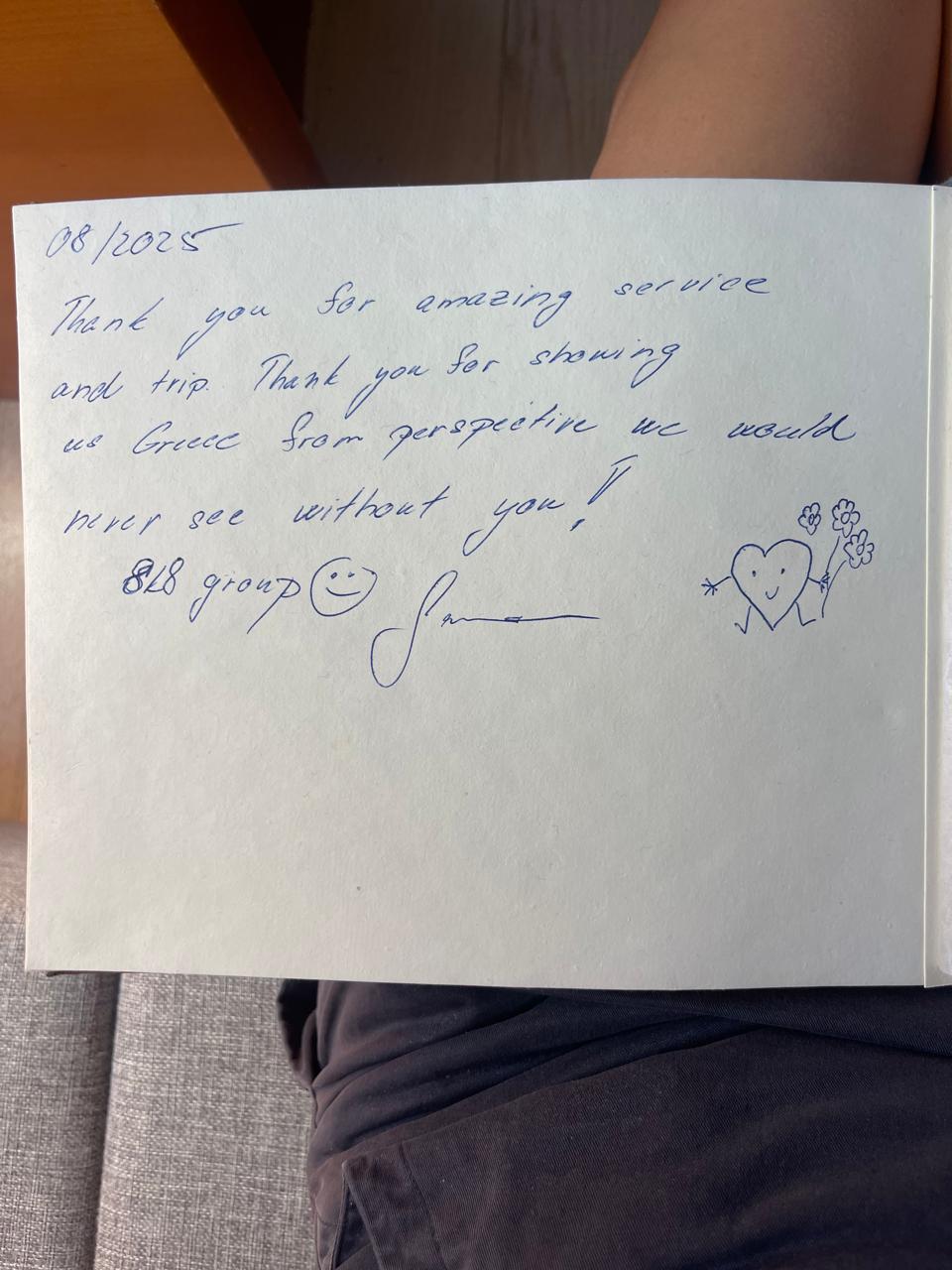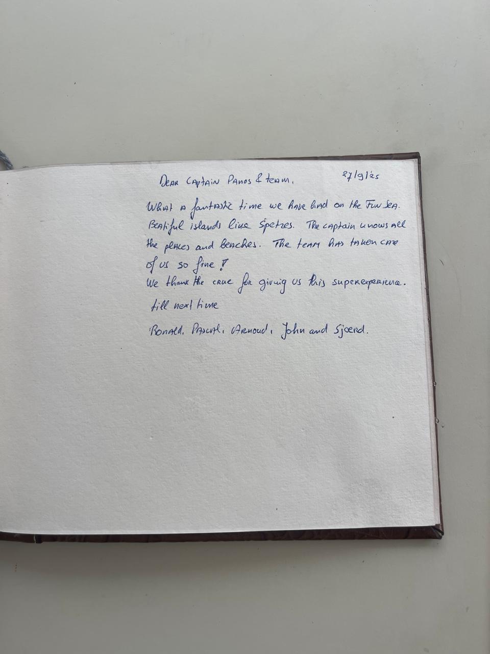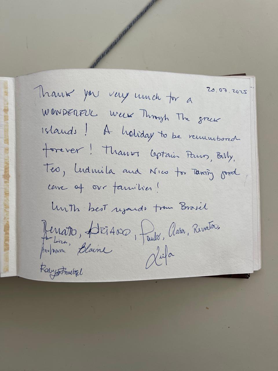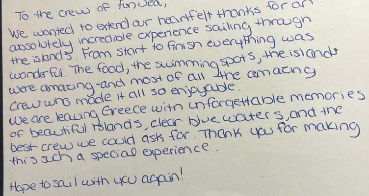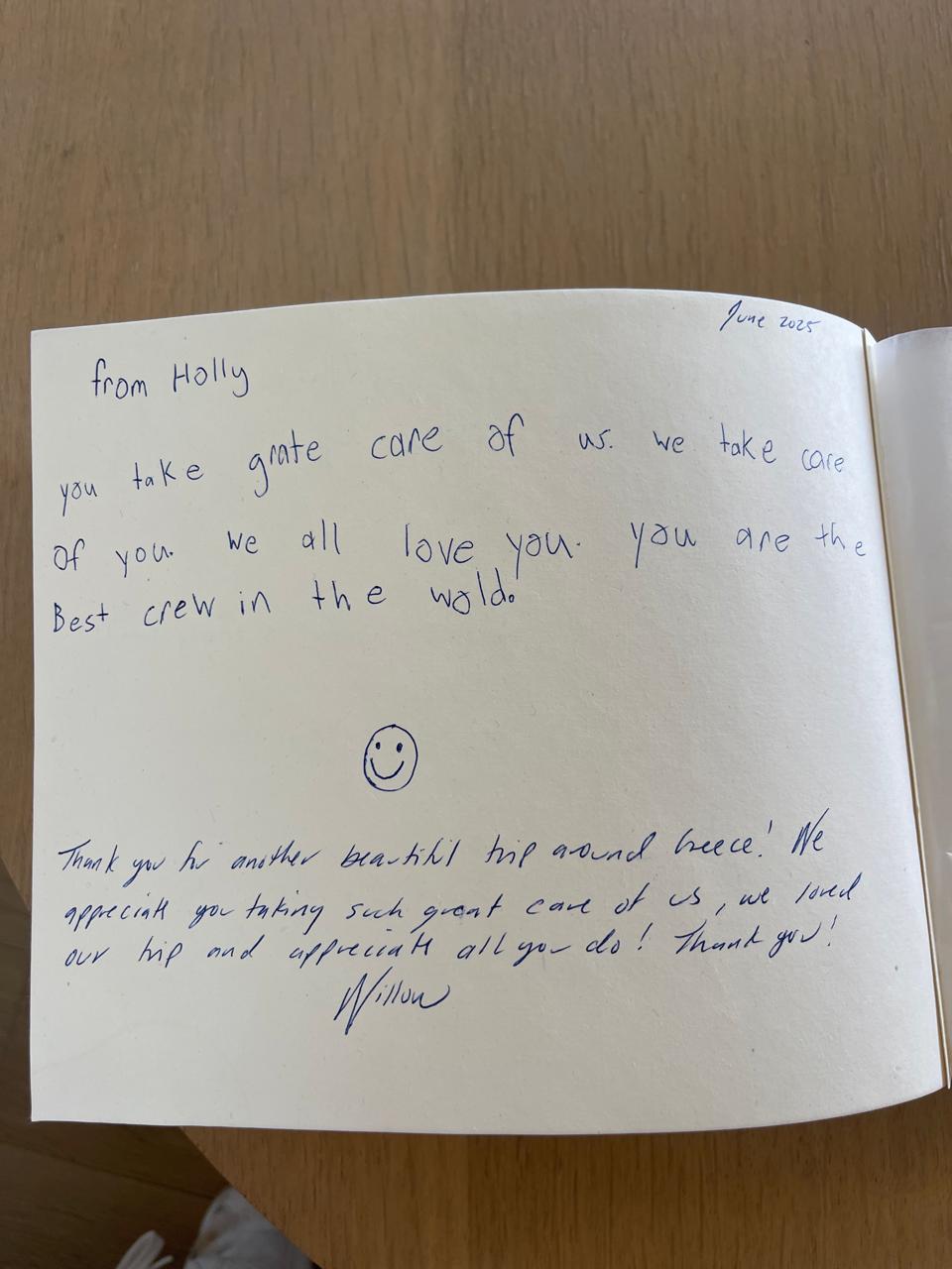 Thank you for the most amazing couple of days. You've been soon hospitable and have made us fall in love with Greece.The delicious food, chocolate cake, learning to drive the mini boat with Billy, Milla with all her hospitality, the captain who ALWAYS knows best & the rest of the crew who went above and beyond.