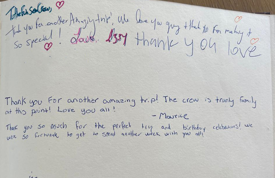 Dear Cpt + Crew,Thank you for an unforgettable time!!