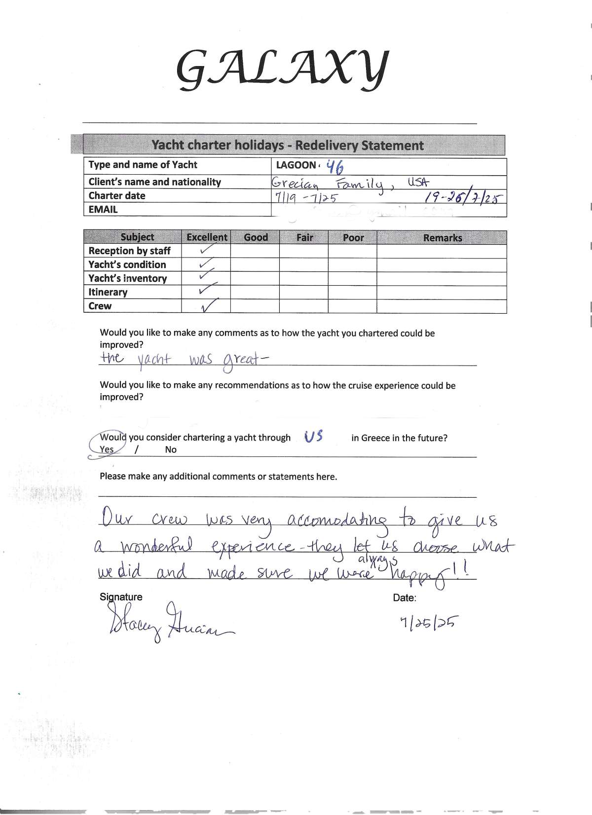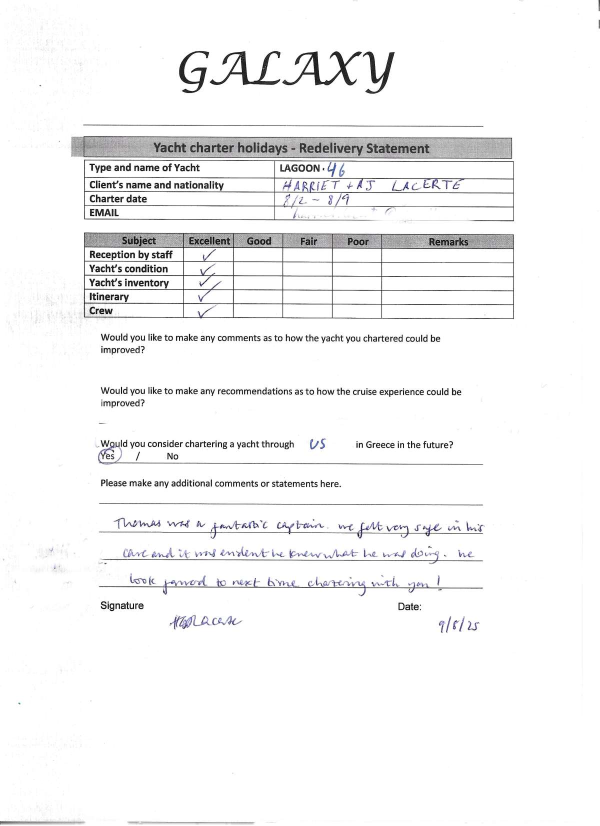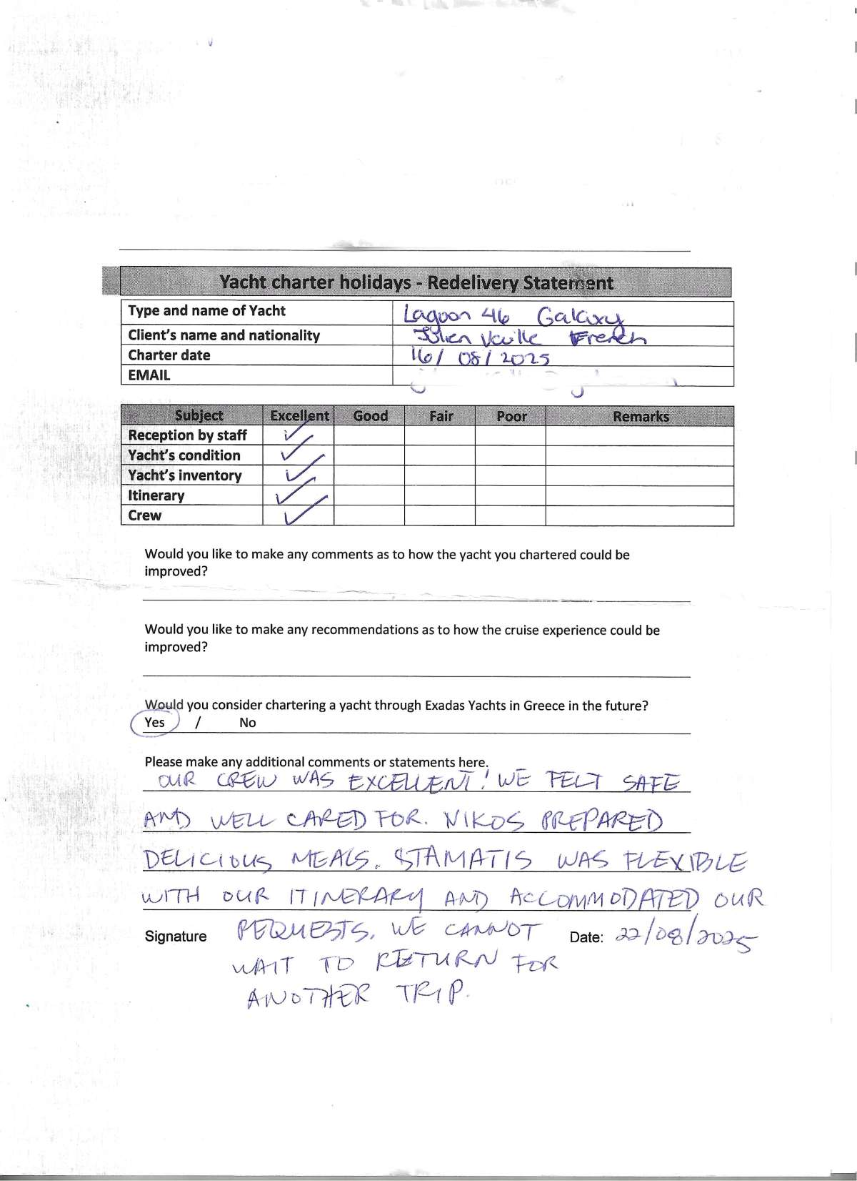 Our time aboard the Galaxy with Captain Stavro was truly extraordinary! We spent two unforgettable weeks exploring the stunning Peloponnese, and every moment was a delight.