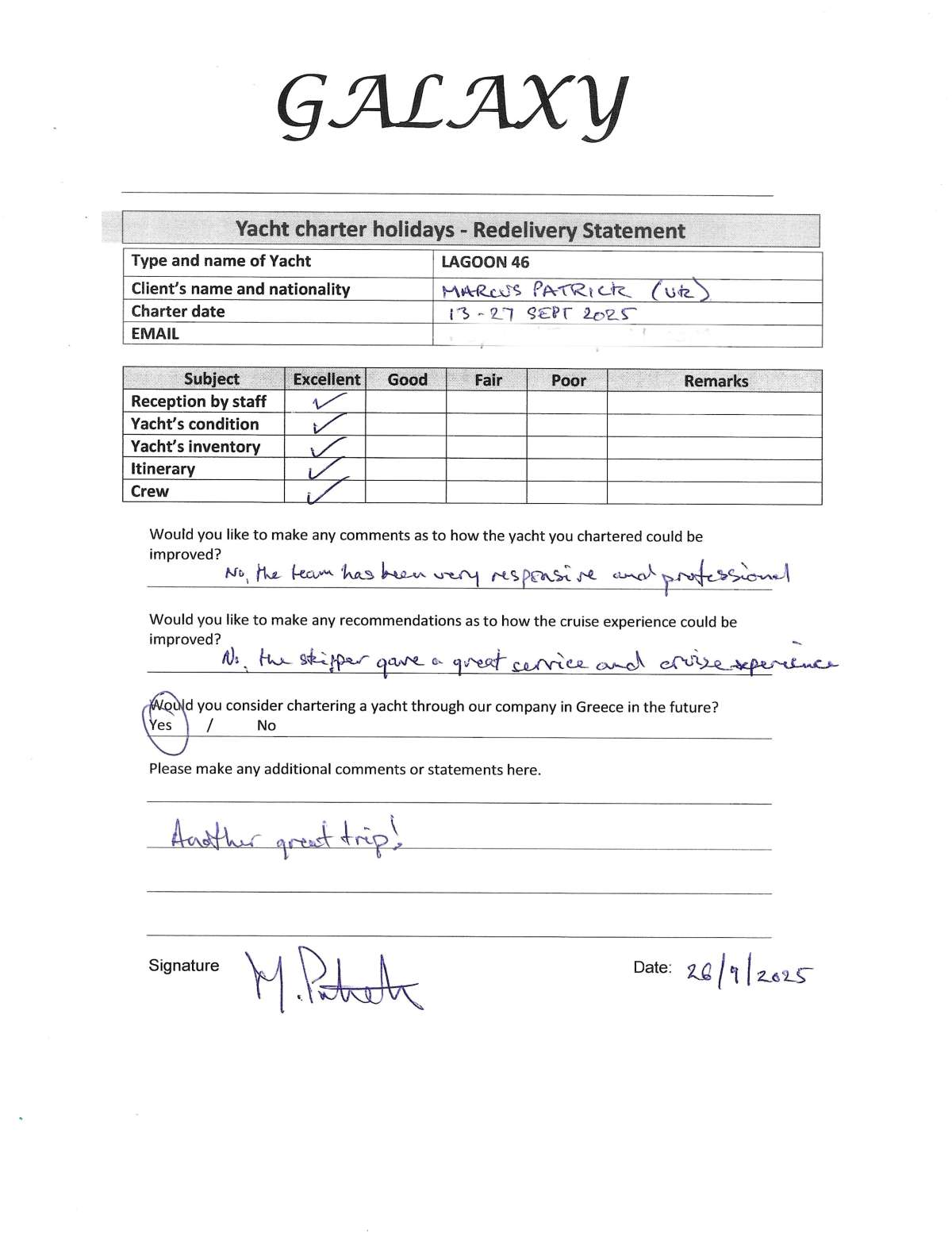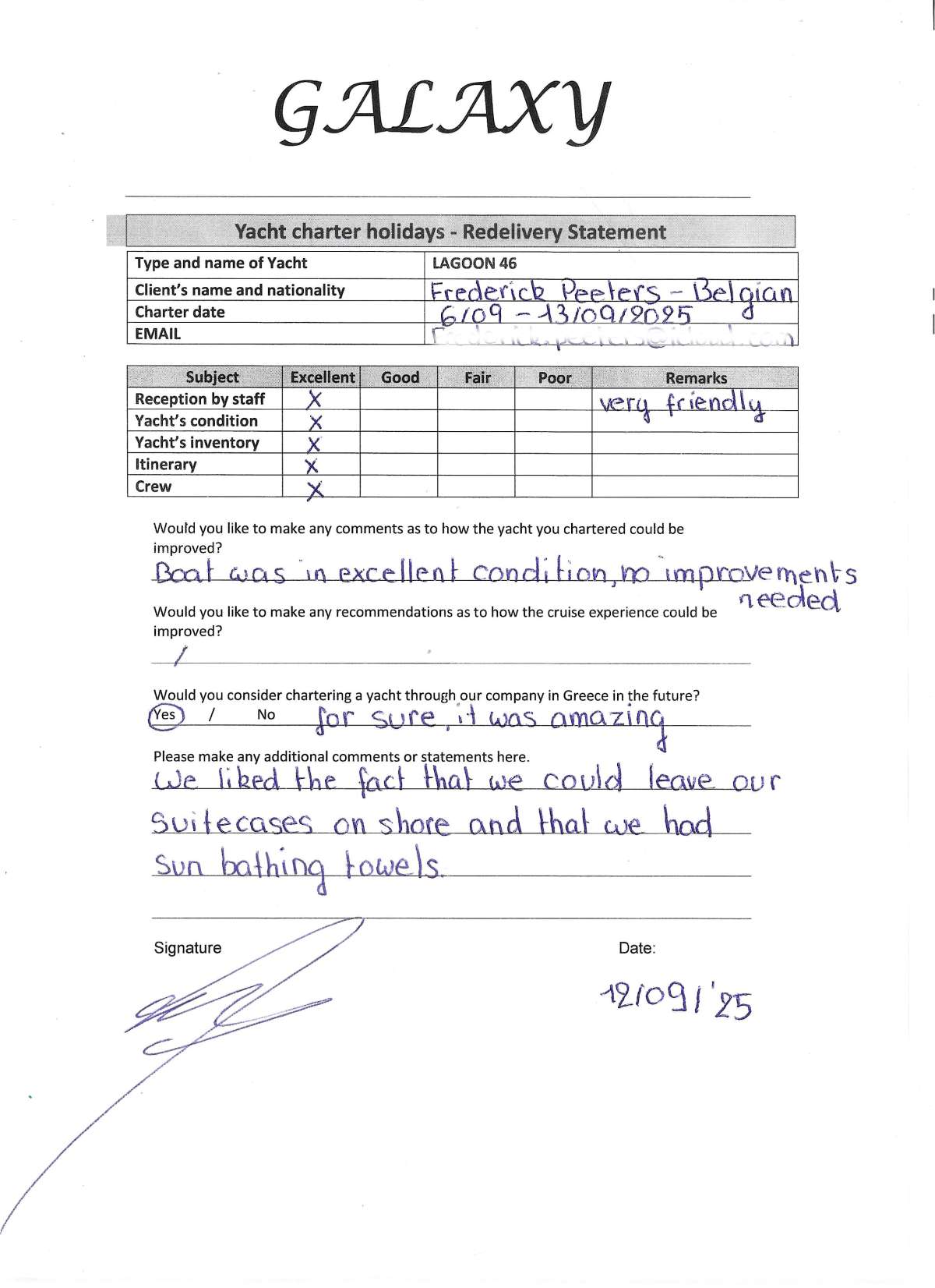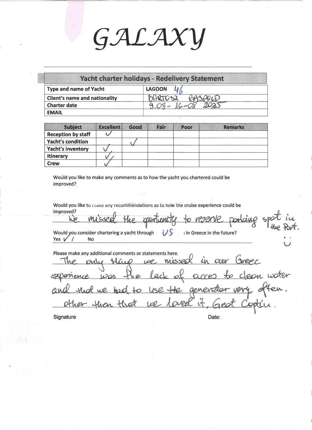 Our time aboard the Galaxy with Captain Stavro was truly extraordinary! We spent two unforgettable weeks exploring the stunning Peloponnese, and every moment was a delight.
