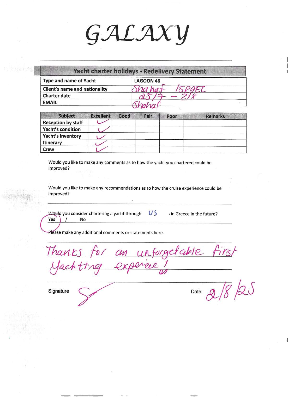 "Our week on Catamaran 'Galaxy' was truly exceptional. The crew's professionalism and warmth made our first-time sailing experience memorable. A perfect blend of luxury and adventure on the high seas."