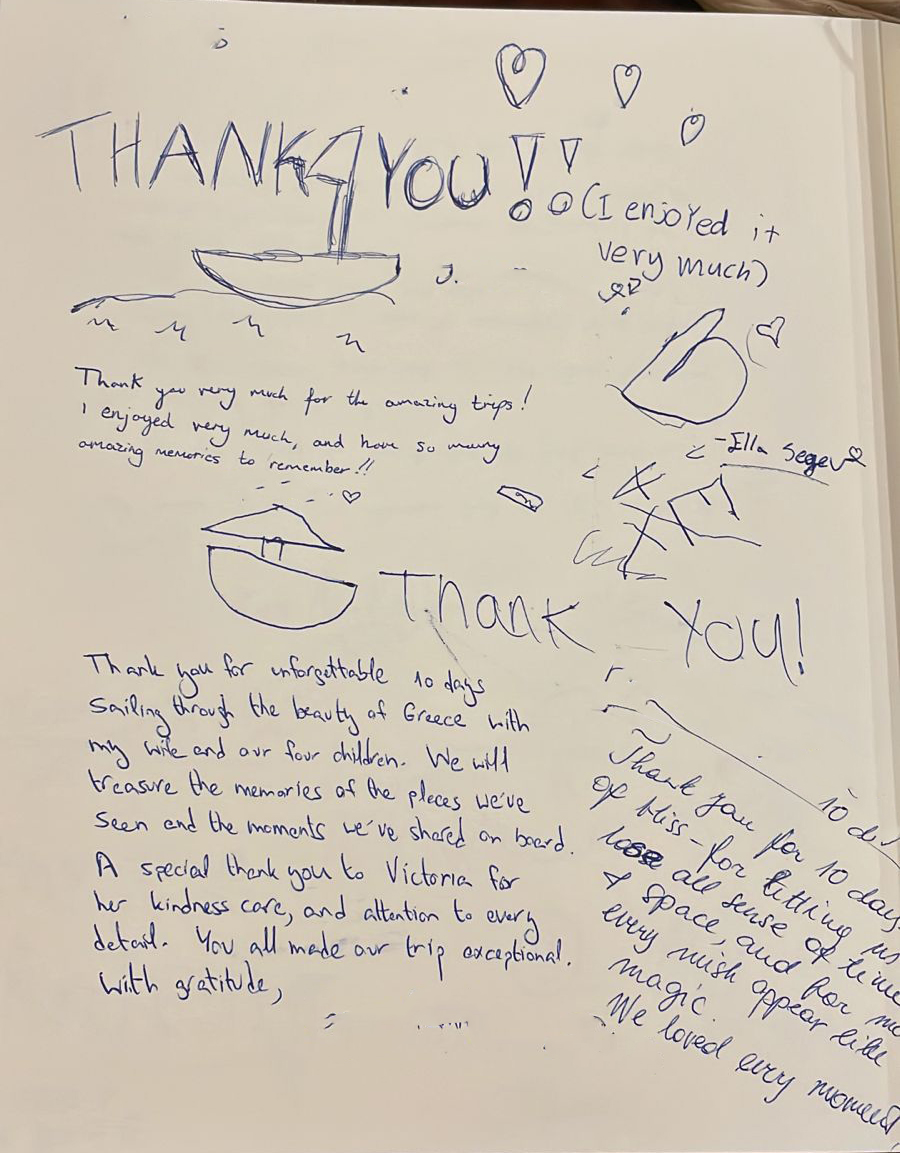 Thank you for the unforgettable 10 days sailing through the beauty of Greece with my wife and our four children. We will treasure the memories of the places we have seen and the moments wh have shared on board.