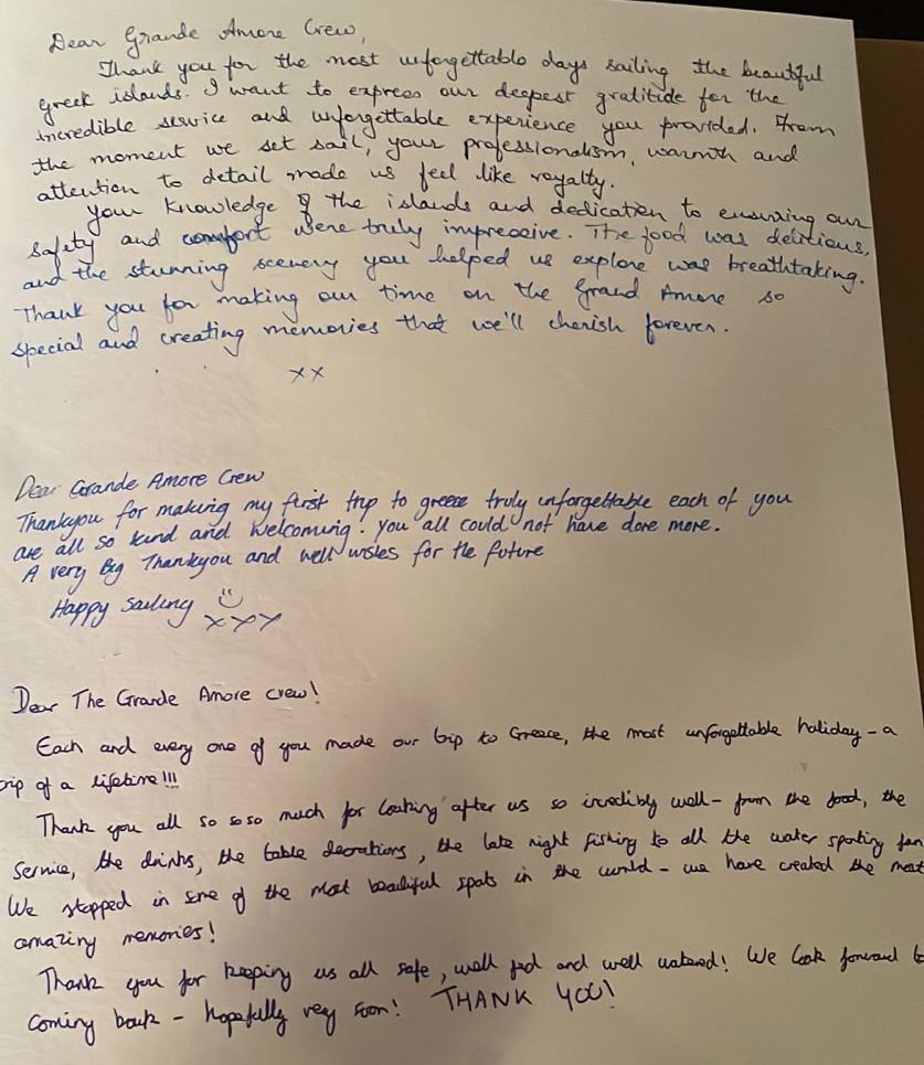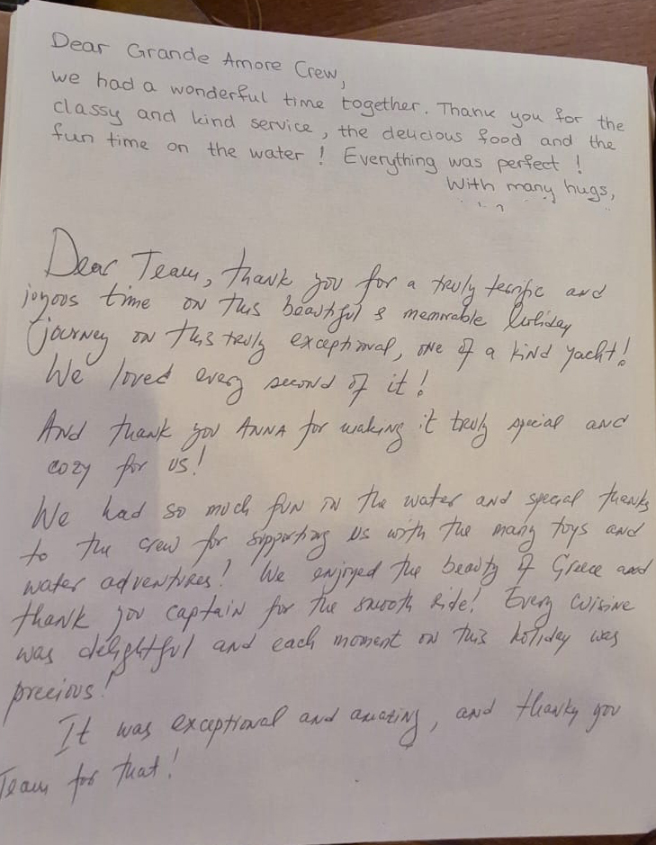 Dear Grande Amore Crew,Thank you for the most unforgettable days sailing, the beautiful Greek islands. I want to express our dapest gratitude for the incredible service and unforgettable experience you provided. From the moment we set sail your professionalism, warmth and attention to detail made us feel like royalty.