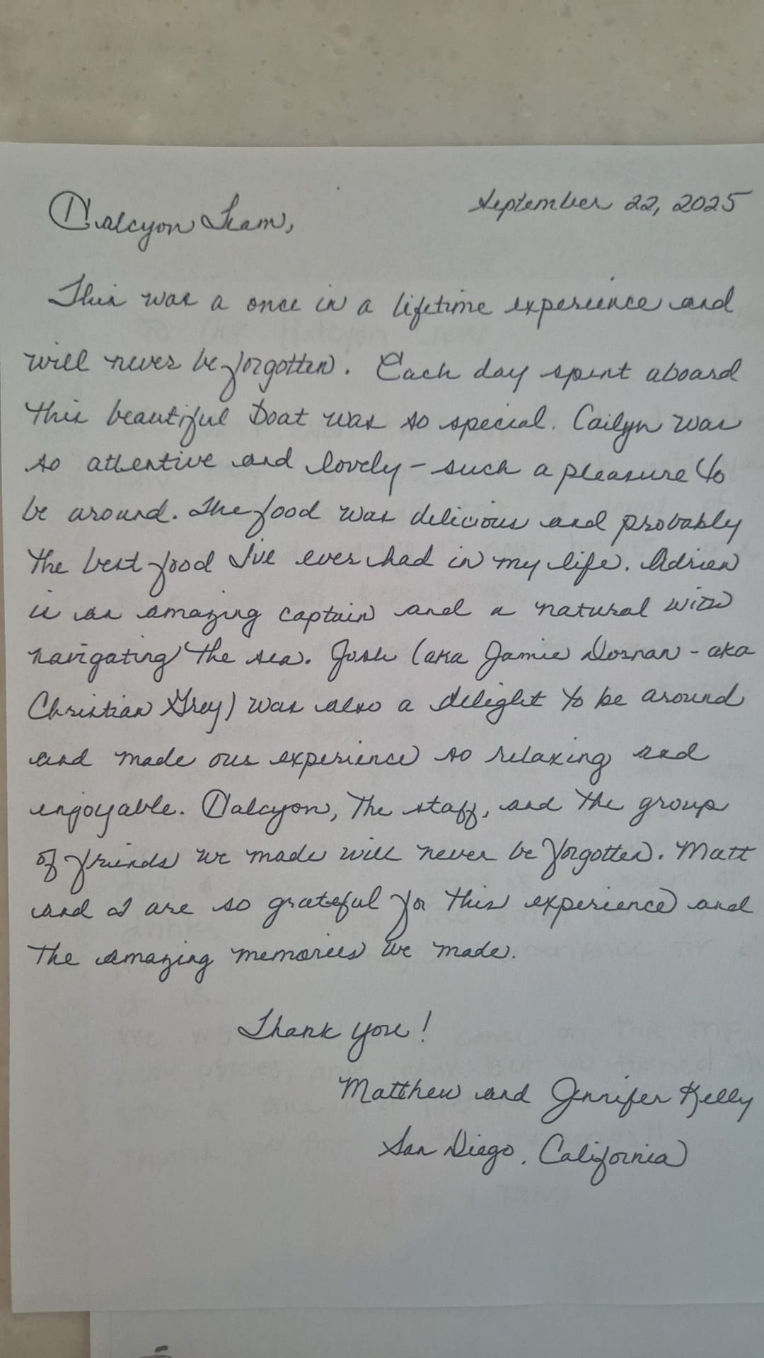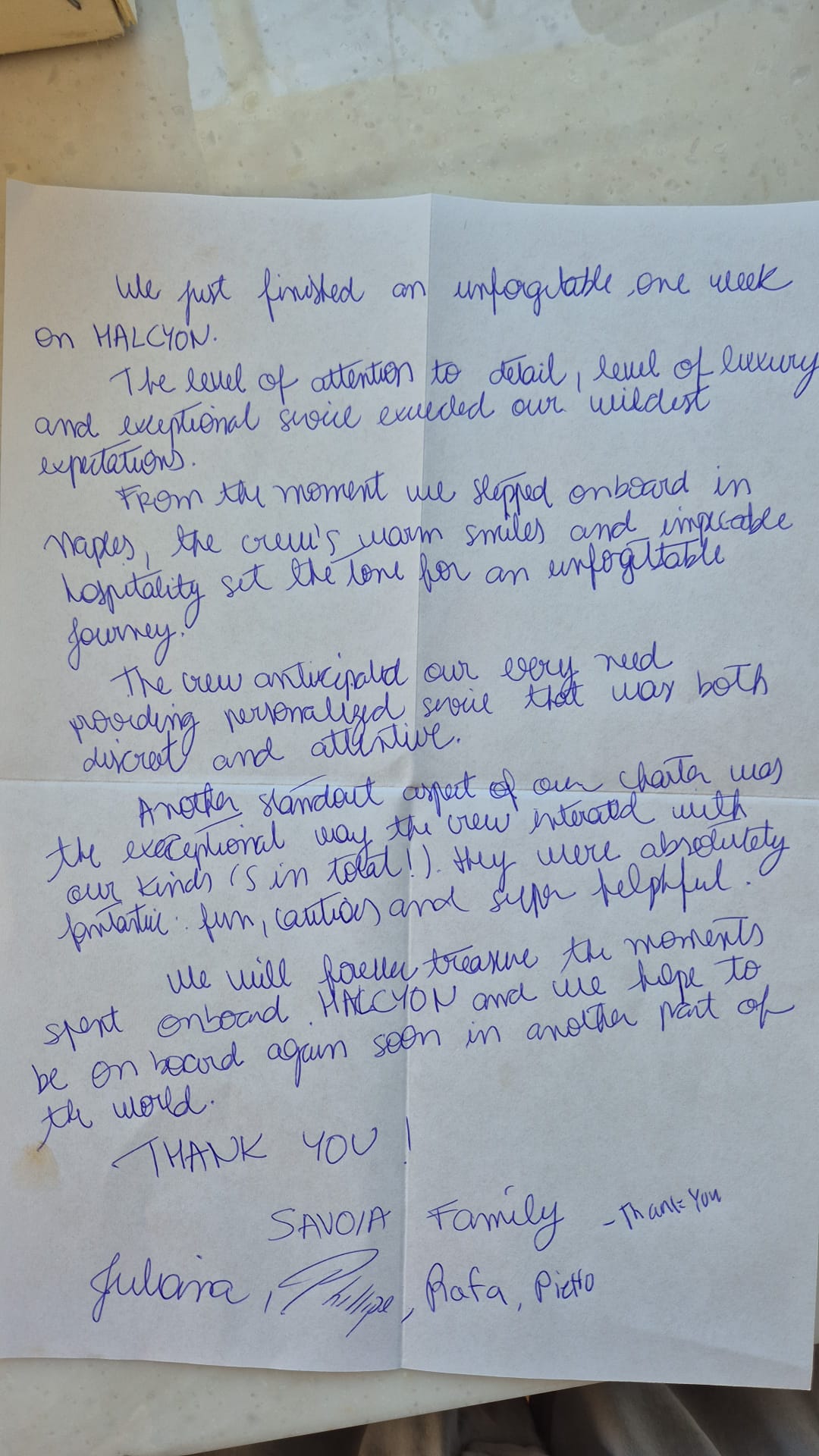 -You have all been so kind and attentive and our trip wouldn't be as memorable as it was without all of your hard work. Thank you for giving us such an unforgettable trip and we wish you all the best!