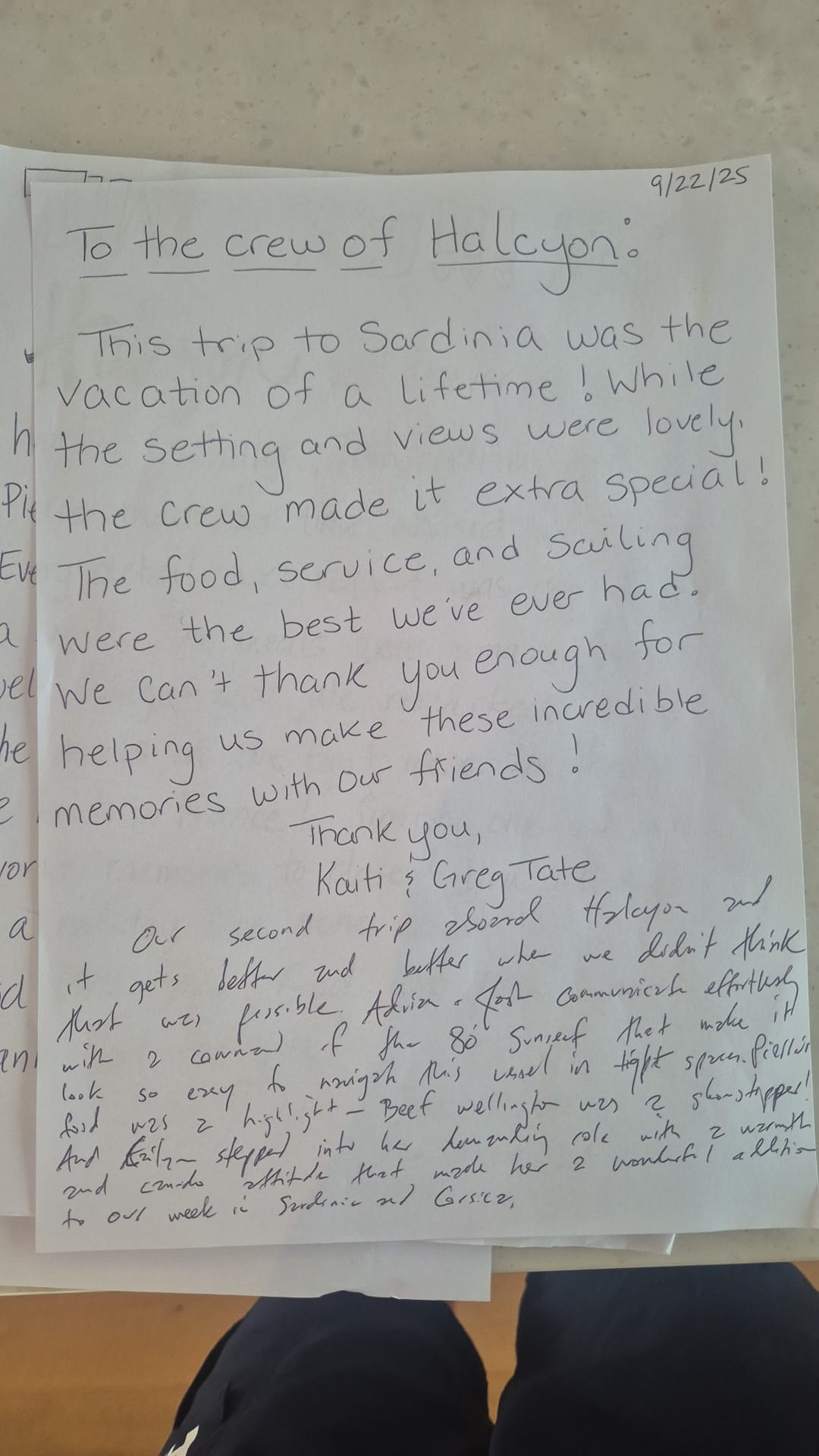 Thank you for a wonderful experience cruising around the Amalfi Coast. Pierre you are a very gifted chef and the food was perfect. Kasia thank you for the service and cleaning with a smile and managing the kiddies to give us a much needed break. Adrien you were always flexible and accommodating with the group. We enjoyed your company and the kids will talk about the trip for years to come.