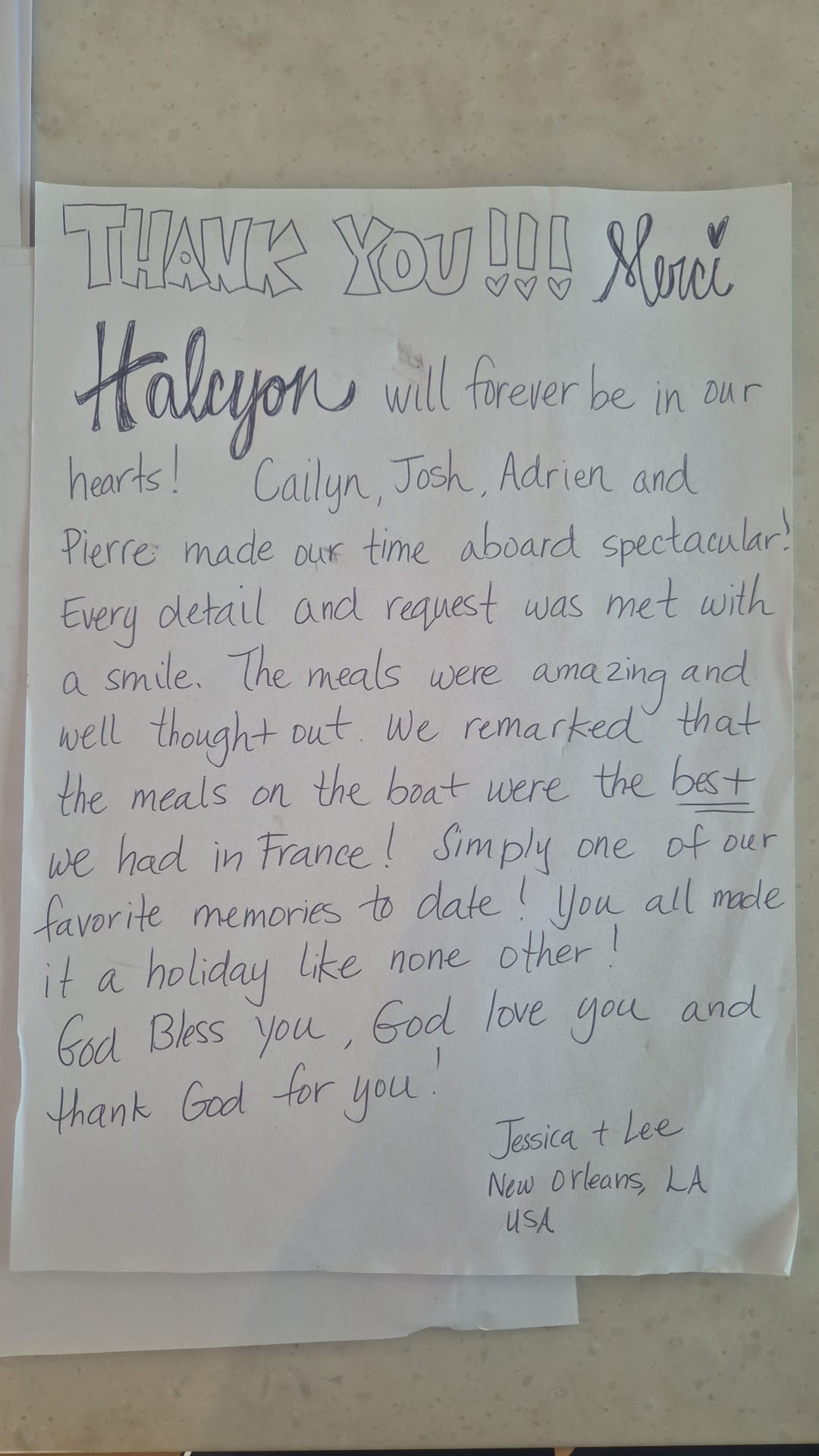 We cannot thank you enough for an unforgettable week. Christina, every meal left us speechless and stuffed with amazing food. Between the smoothies, charcuterie boards and scrumptious desserts, it will be hard re-adjusting back at home. I think collectively we have each gained a few pounds but it was well worth it. Merci Beaucoup Adrien, our voyage couldn't have been any smoother. Thank you for being there whenever we needed a ride on the dinghy, and for helping us around the ship whenver we needed it.
