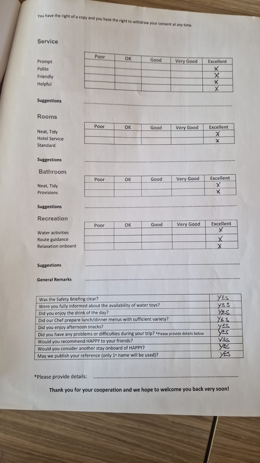 Best vacation ever! Happy was so happy for the entire trip! Was a beautiful boat, so clean with everything we needed! We were 8 friends and together with the incredible staff made for an absolutely amazing vacation!