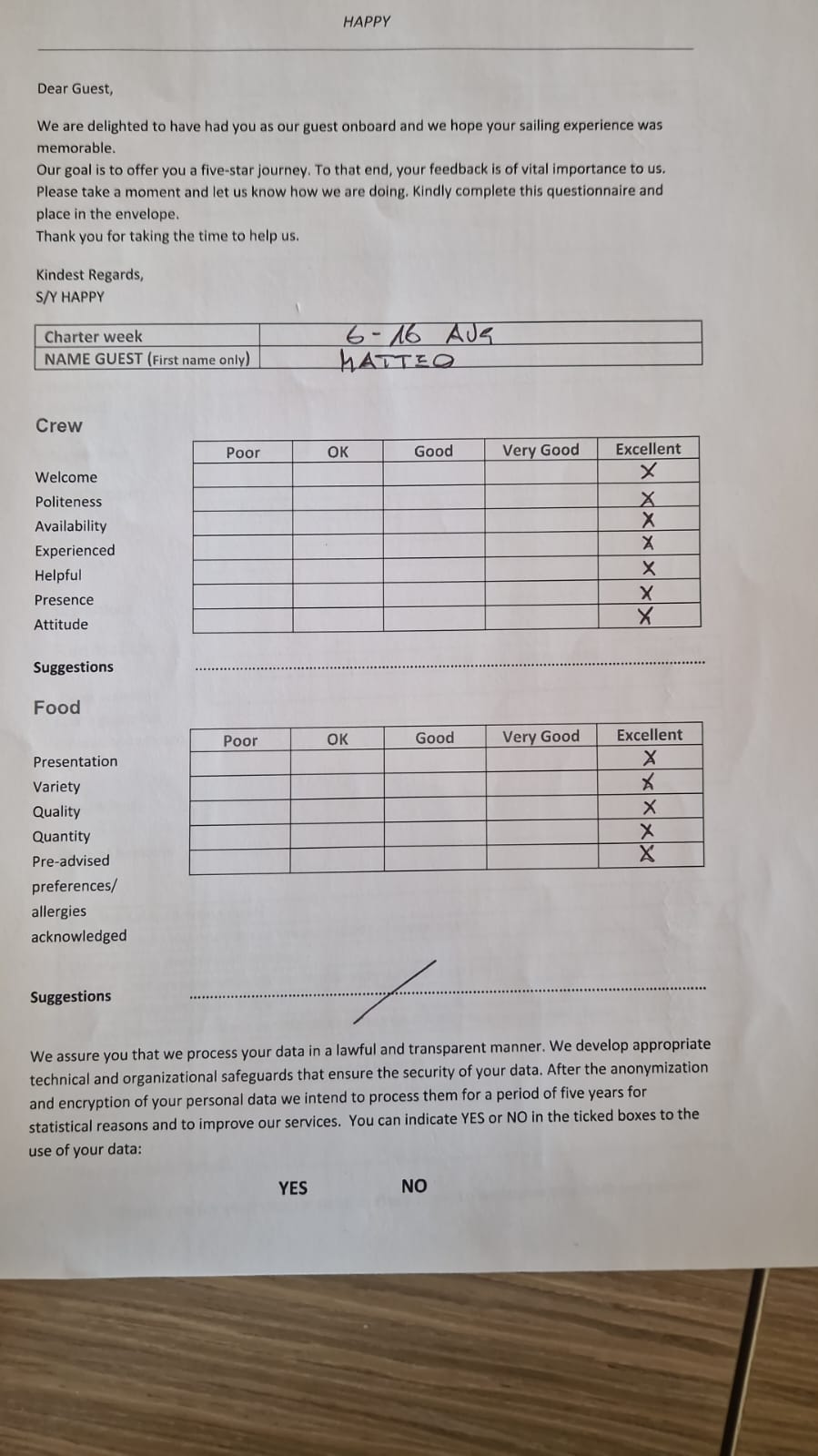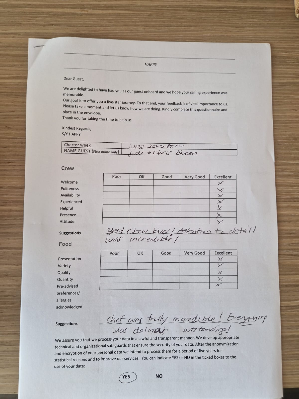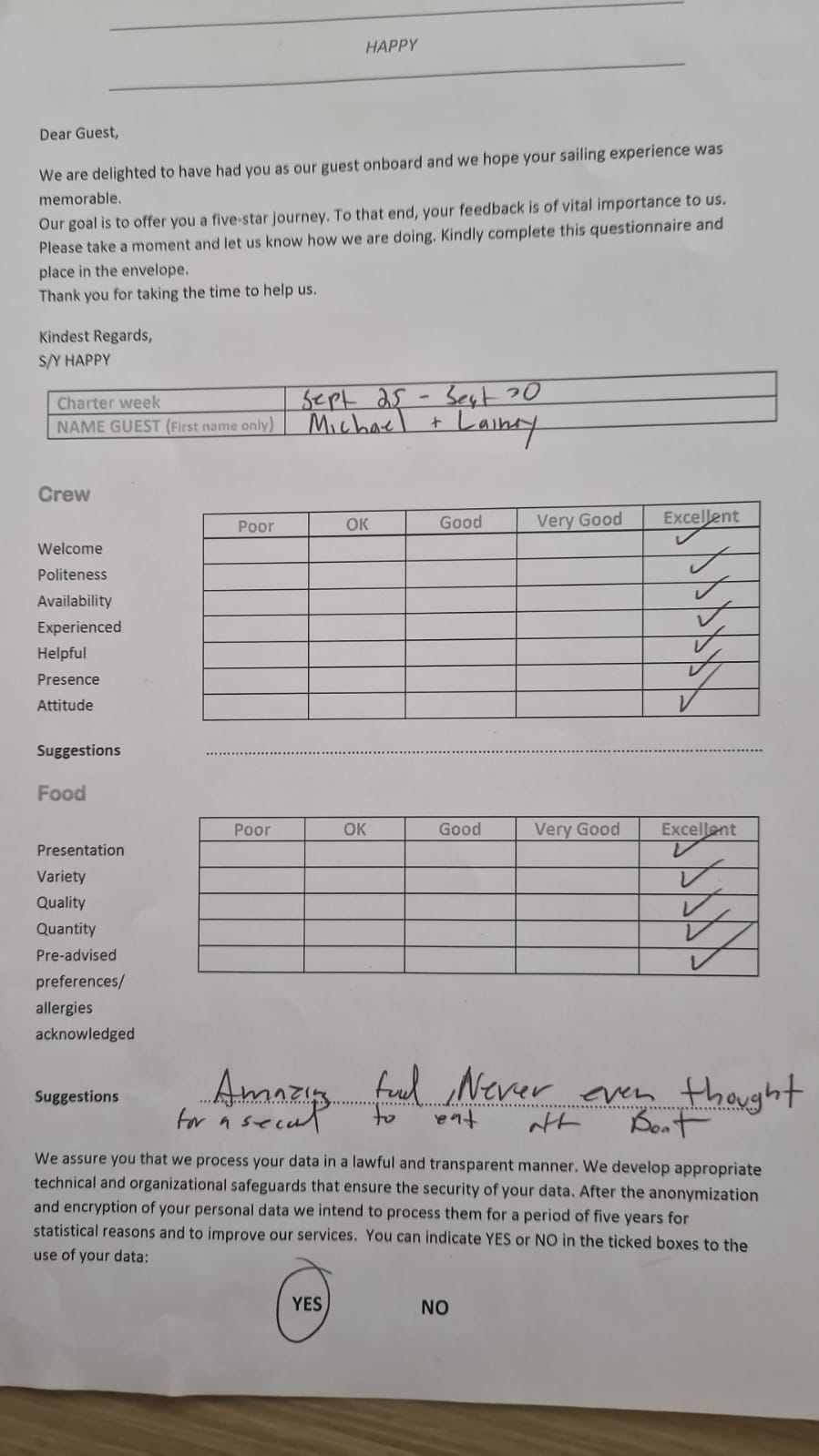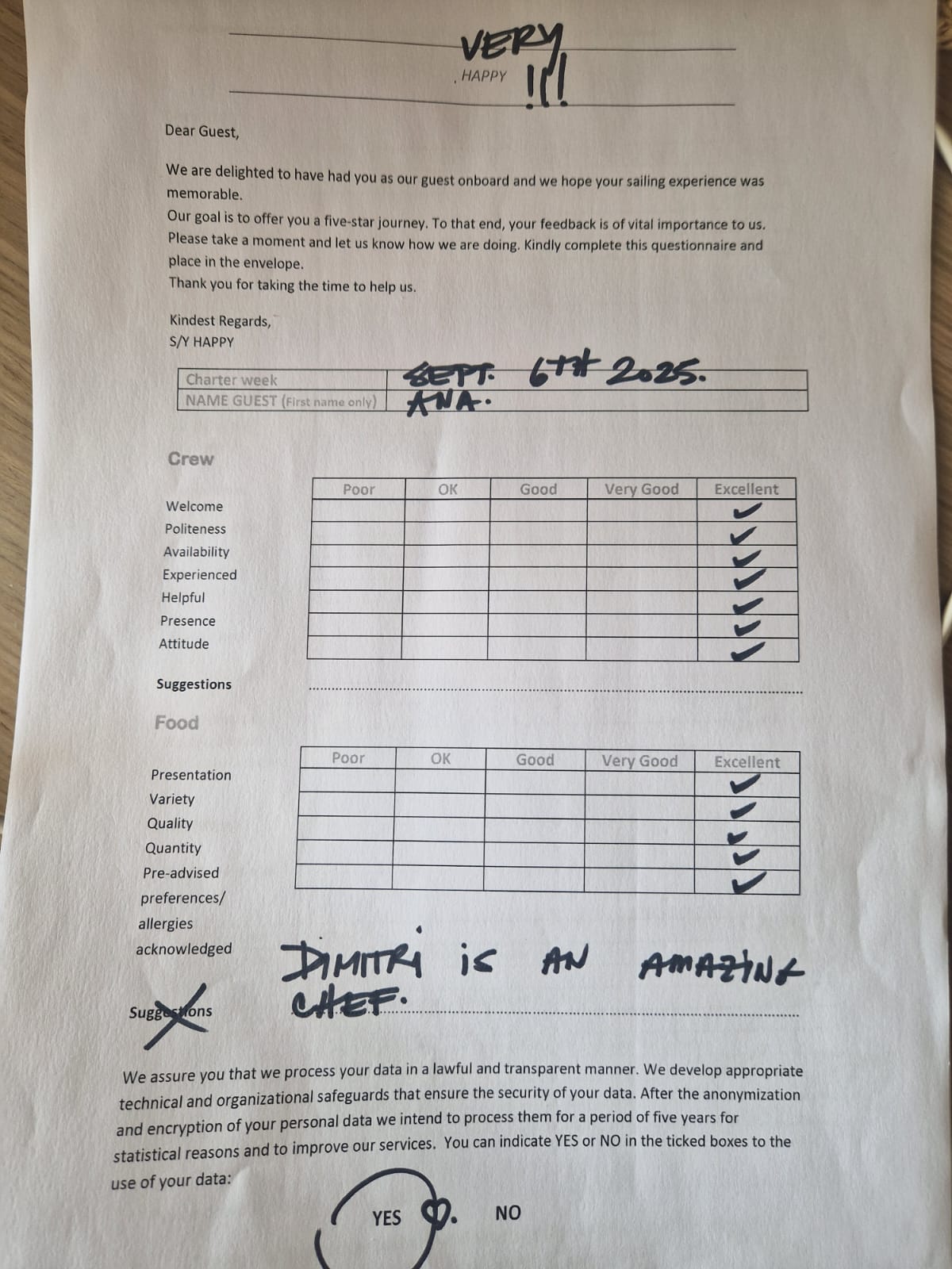''HAPPY'' is our new HAPPY! An incredible week in the bluest of waters. We couldn't have imagined a better vacation. The crew was beyond kind, helpful and attentive. George , our captain is a pro. We felt safe and relaxed and he showed us the best remote beaches and caves in area. Everything from activities, to destinations and dinners on shore. Chef Dimitris has truly spoiled us. Each meal better than the last, and Dimitris #2 made sure we had everything we needed at all times. He is also a great bartender!